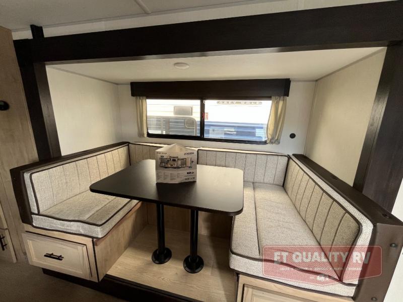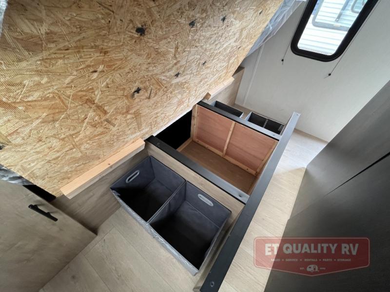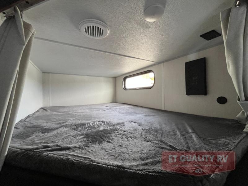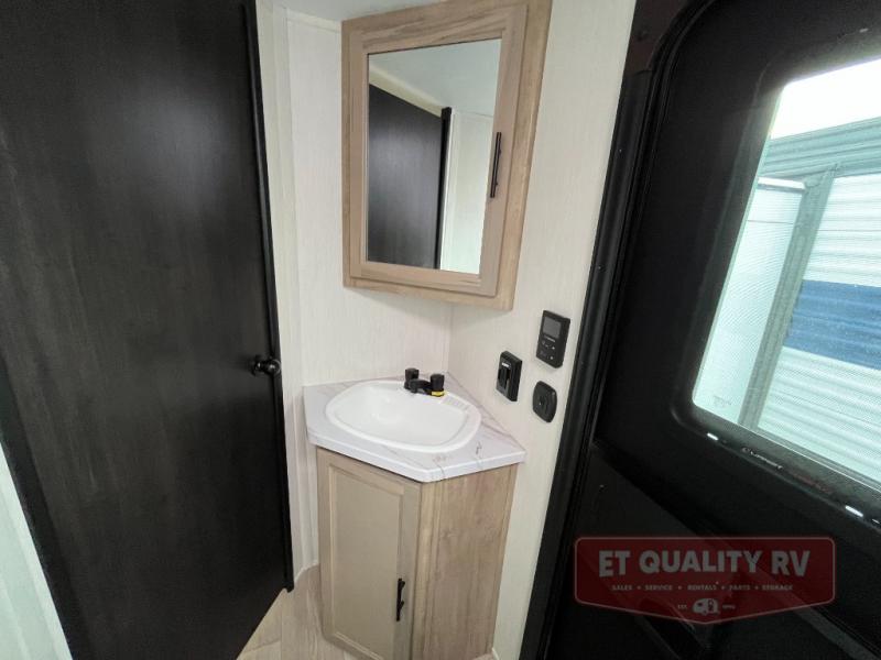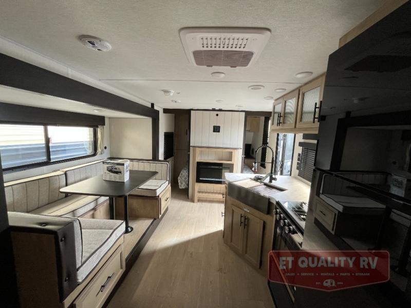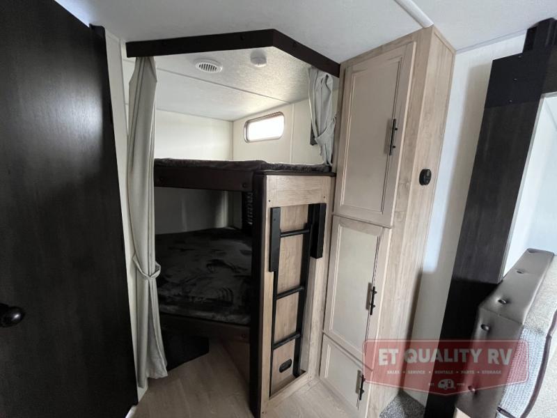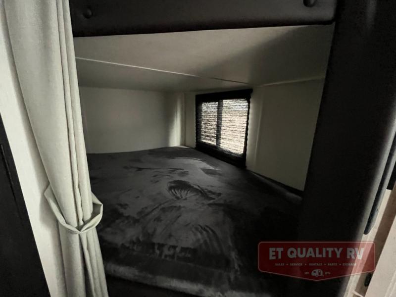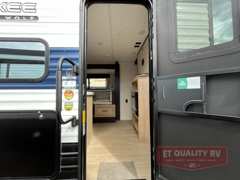 You will love the space provided in this dual entry Cherokee Grey Wolf travel trailer that has double-size bunks! The rear entry door leads right into the full bath allowing easy access from outside when you need to use the bathroom while you're enjoying the great outdoors. The large U-shaped dinette slide will not only seat everyone comfortably for a meal or a game, but since it also slides out, it opens up the interior even more to give you plenty of space for foot traffic. For all of your outdoor gear, you will find the outside storage compartments handy for stowing away your things when not in use. While the kids enjoy their bunk beds, you will enjoy a good night's rest in your RV king bed with wardrobes on either side up in the front private bedroom!