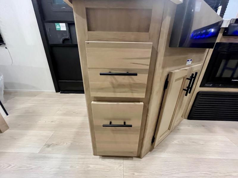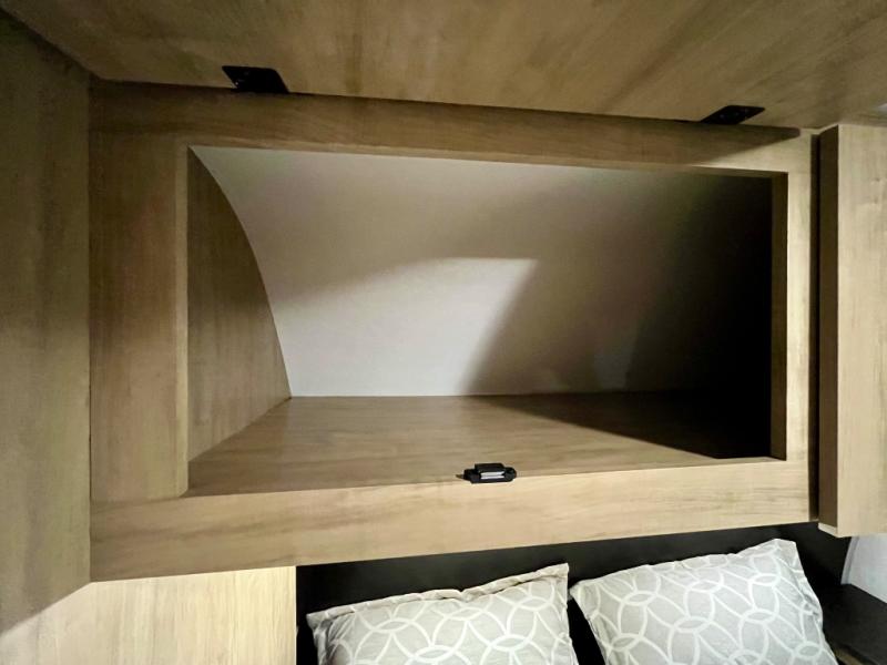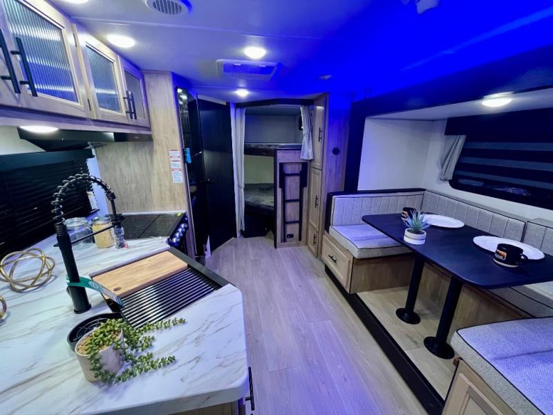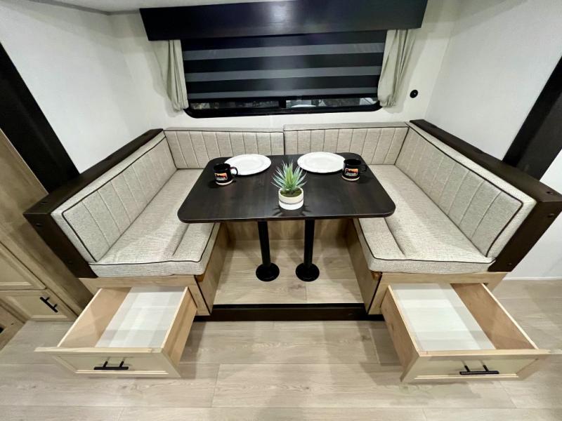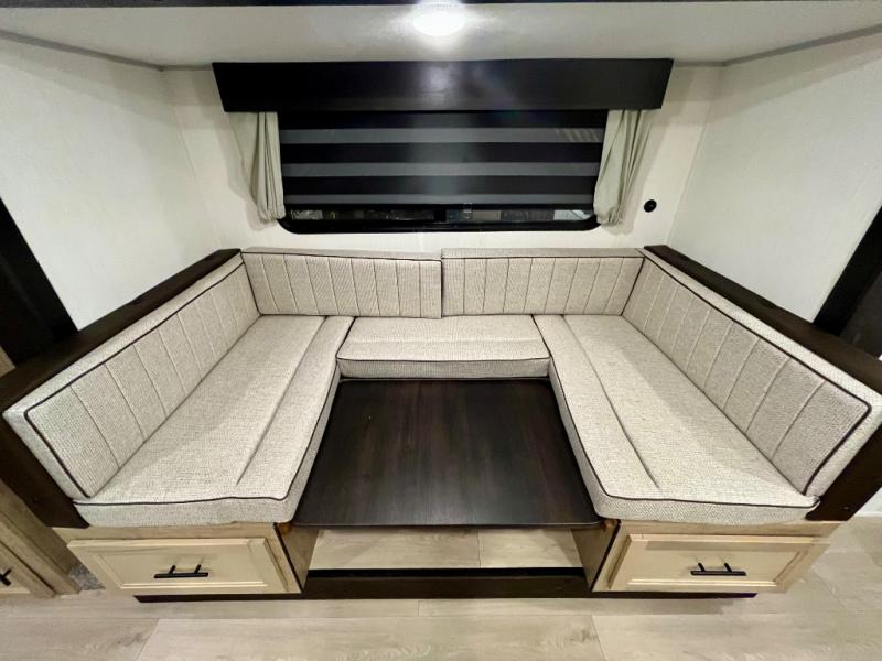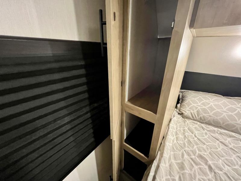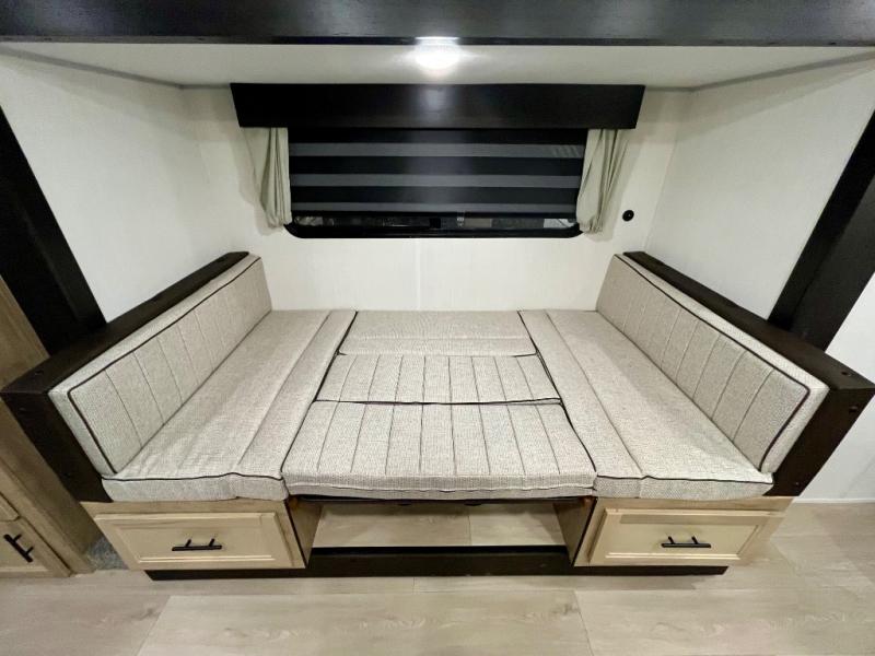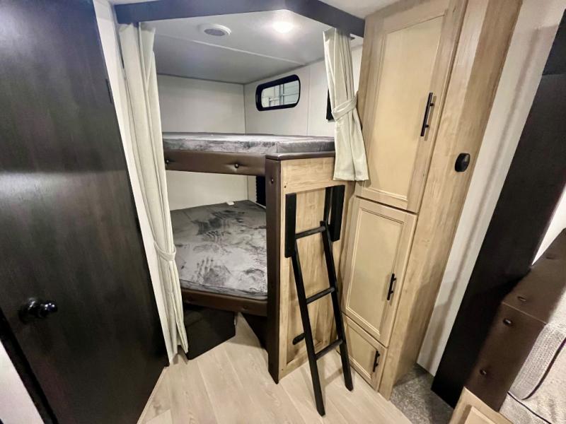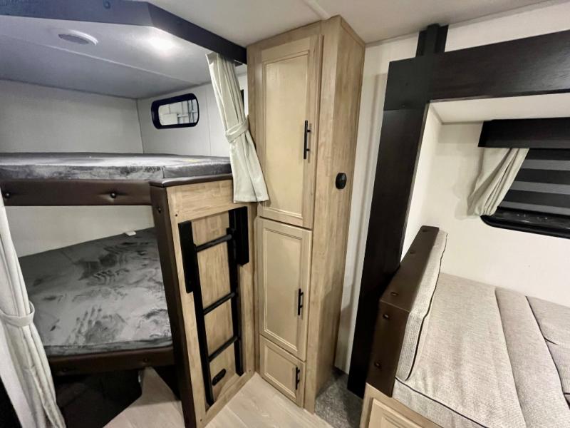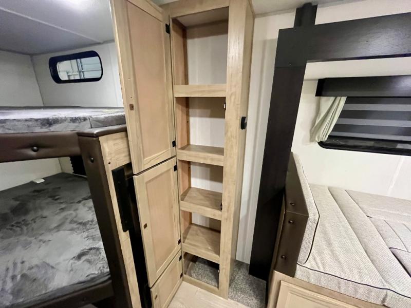 You will love the space provided in this dual entry Cherokee Grey Wolf travel trailer that has double-size bunks! The rear entry door leads right into the full bath allowing easy access from outside when you need to use the bathroom while you're enjoying the great outdoors. The large U-shaped dinette slide will not only seat everyone comfortably for a meal or a game, but since it also slides out, it opens up the interior even more to give you plenty of space for foot traffic. For all of your outdoor gear, you will find the outside storage compartments handy for stowing away your things when not in use. While the kids enjoy their bunk beds, you will enjoy a good night's rest in your RV king bed with wardrobes on either side up in the front private bedroom!
