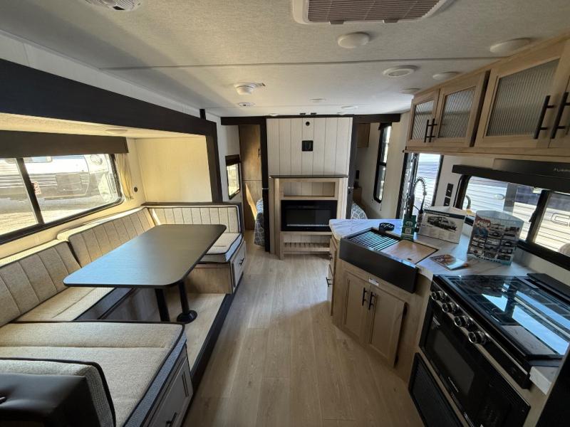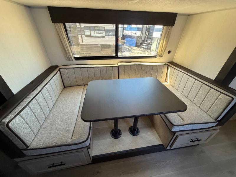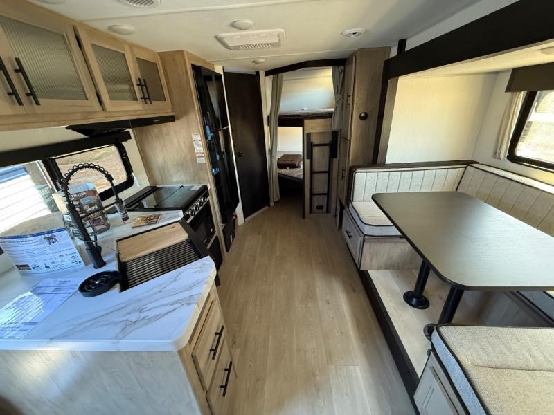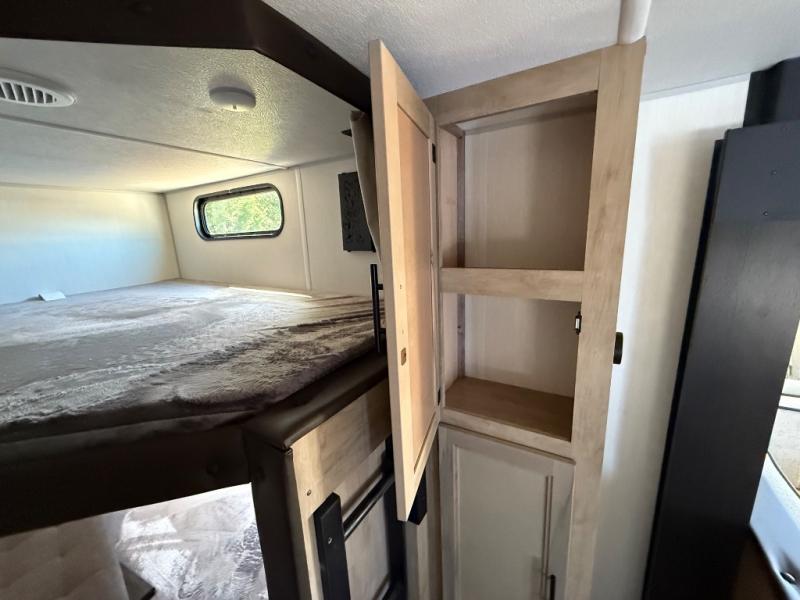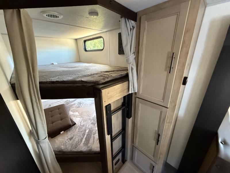 You will love the space provided in this dual entry Cherokee Grey Wolf travel trailer that has double-size bunks! The rear entry door leads right into the full bath allowing easy access from outside when you need to use the bathroom while you're enjoying the great outdoors. The large U-shaped dinette slide will not only seat everyone comfortably for a meal or a game, but since it also slides out, it opens up the interior even more to give you plenty of space for foot traffic. For all of your outdoor gear, you will find the outside storage compartments handy for stowing away your things when not in use. While the kids enjoy their bunk beds, you will enjoy a good night's rest in your RV king bed with wardrobes on either side up in the front private bedroom!