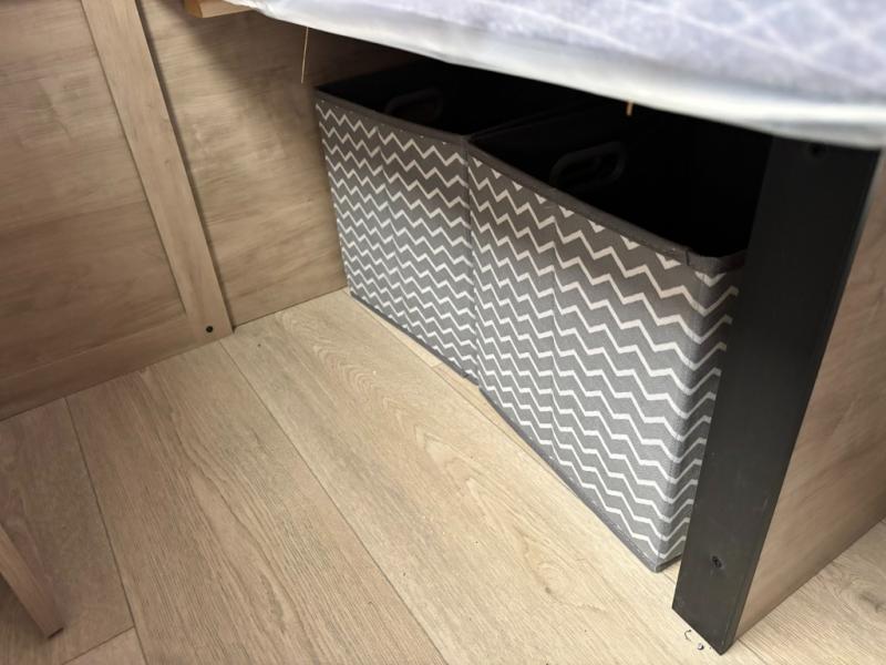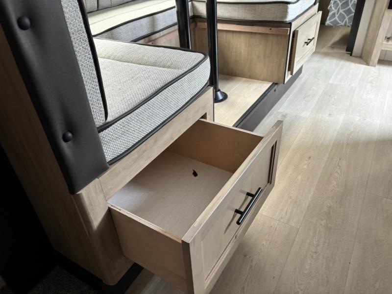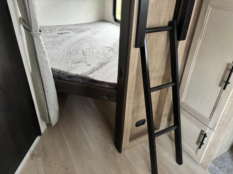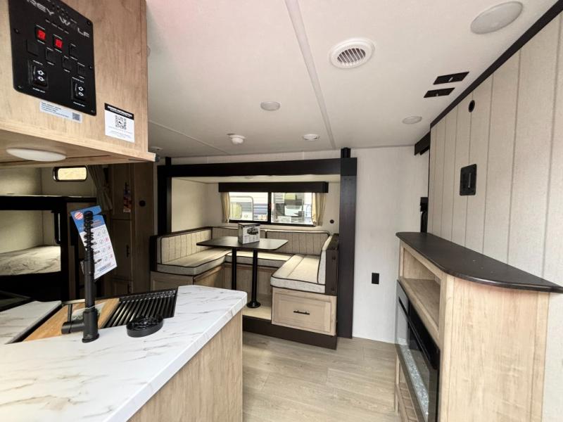 You will love the space provided in this dual entry Cherokee Grey Wolf travel trailer that has double-size bunks! The rear entry door leads right into the full bath allowing easy access from outside when you need to use the bathroom while you're enjoying the great outdoors. The large U-shaped dinette slide will not only seat everyone comfortably for a meal or a game, but since it also slides out, it opens up the interior even more to give you plenty of space for foot traffic. For all of your outdoor gear, you will find the outside storage compartments handy for stowing away your things when not in use. While the kids enjoy their bunk beds, you will enjoy a good night's rest in your RV king bed with wardrobes on either side up in the front private bedroom!