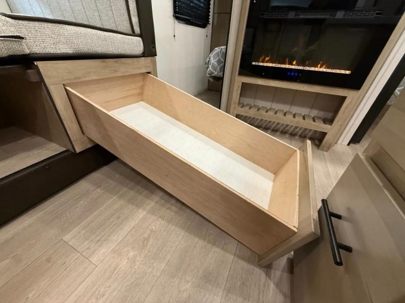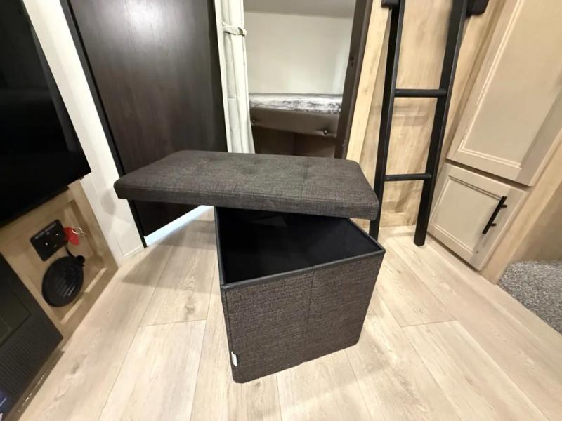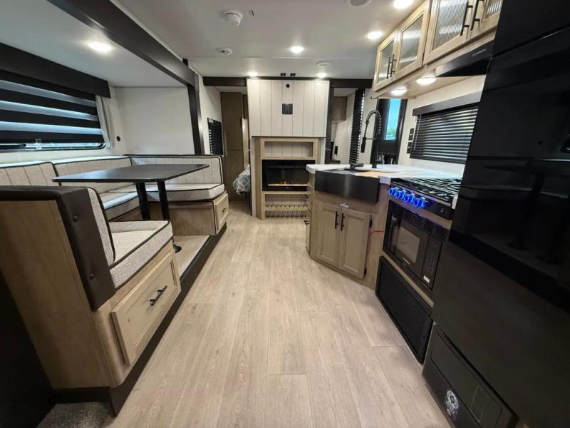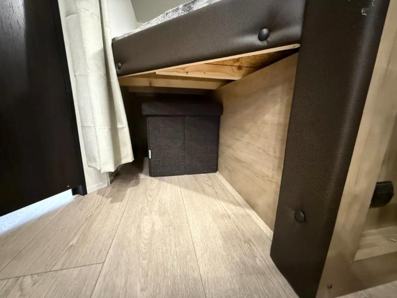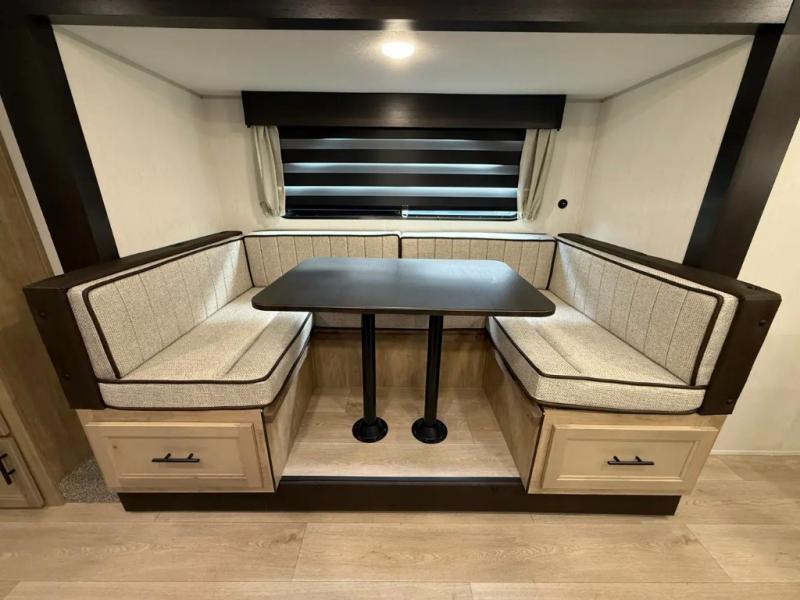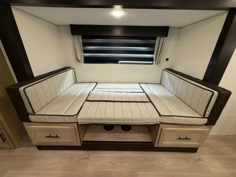 You will love the space provided in this dual entry Cherokee Grey Wolf travel trailer that has double-size bunks! The rear entry door leads right into the full bath allowing easy access from outside when you need to use the bathroom while you're enjoying the great outdoors. The large U-shaped dinette slide will not only seat everyone comfortably for a meal or a game, but since it also slides out, it opens up the interior even more to give you plenty of space for foot traffic. For all of your outdoor gear, you will find the outside storage compartments handy for stowing away your things when not in use. While the kids enjoy their bunk beds, you will enjoy a good night's rest in your RV king bed with wardrobes on either side up in the front private bedroom!