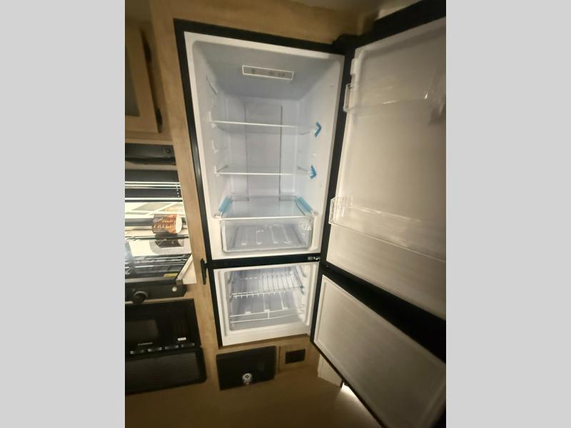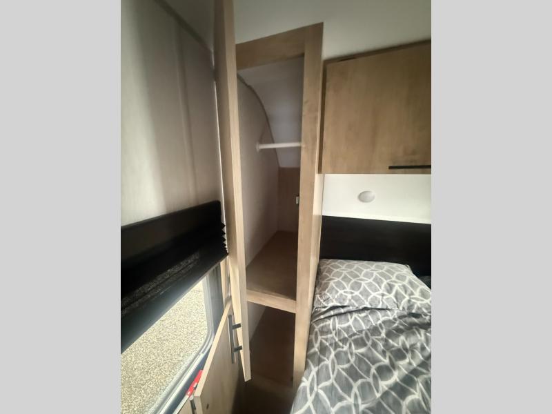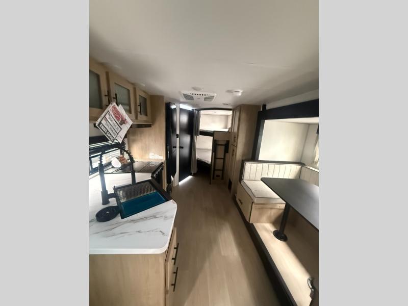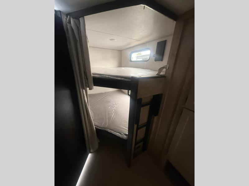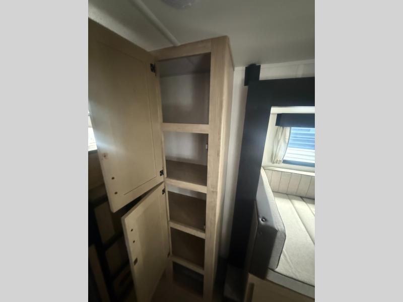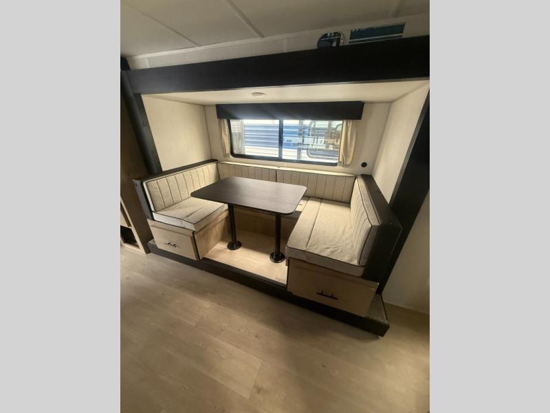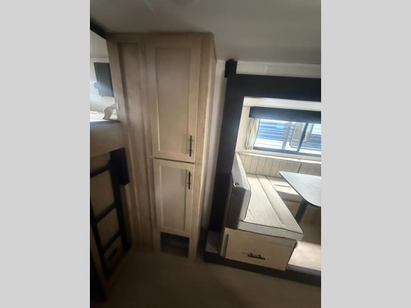 You will love the space provided in this dual entry Cherokee Grey Wolf travel trailer that has double-size bunks! The rear entry door leads right into the full bath allowing easy access from outside when you need to use the bathroom while you're enjoying the great outdoors. The large U-shaped dinette slide will not only seat everyone comfortably for a meal or a game, but since it also slides out, it opens up the interior even more to give you plenty of space for foot traffic. For all of your outdoor gear, you will find the outside storage compartments handy for stowing away your things when not in use. While the kids enjoy their bunk beds, you will enjoy a good night's rest in your RV king bed with wardrobes on either side up in the front private bedroom!