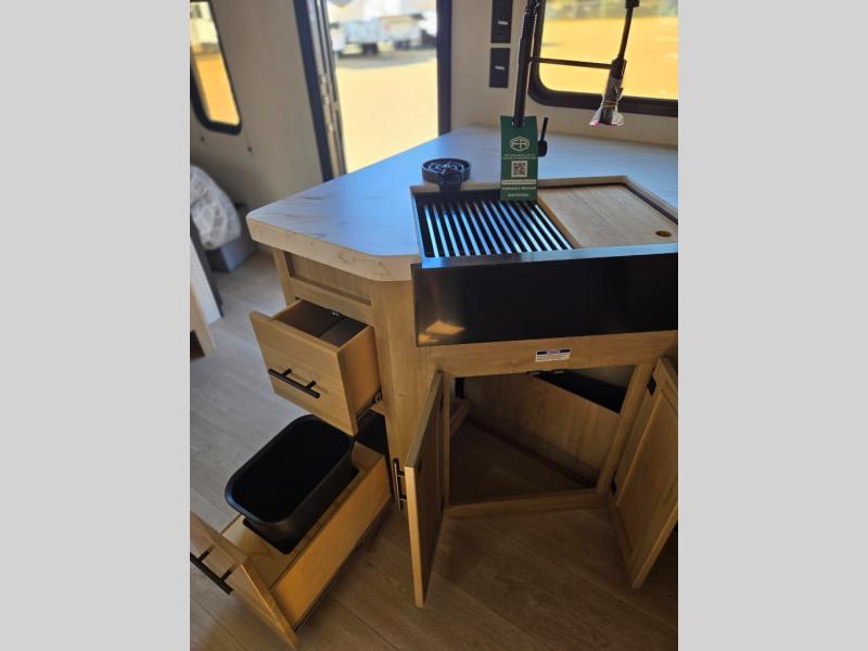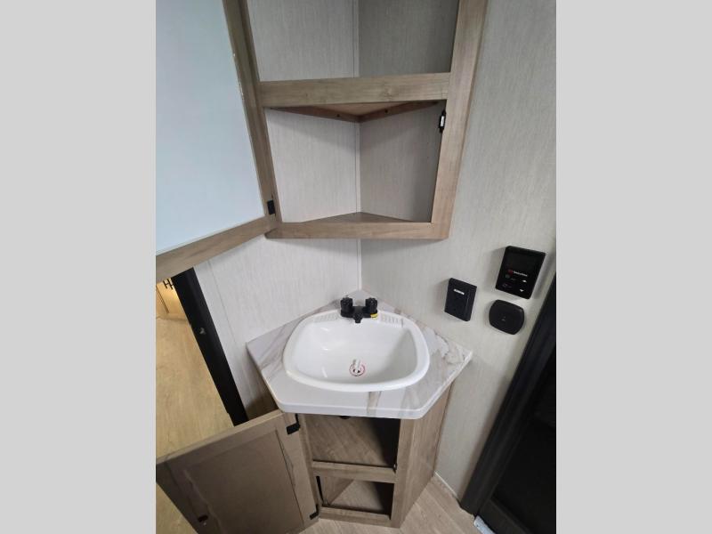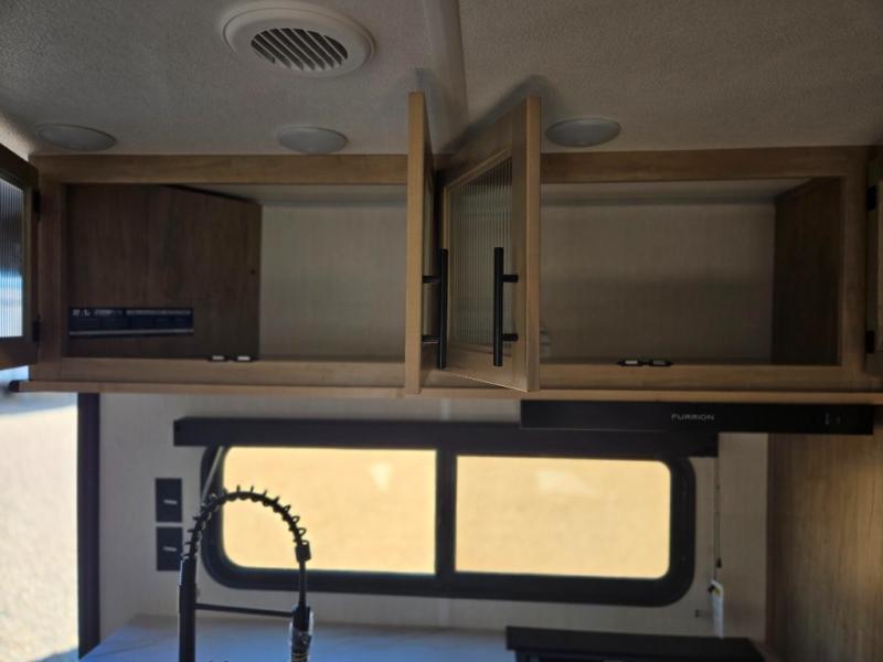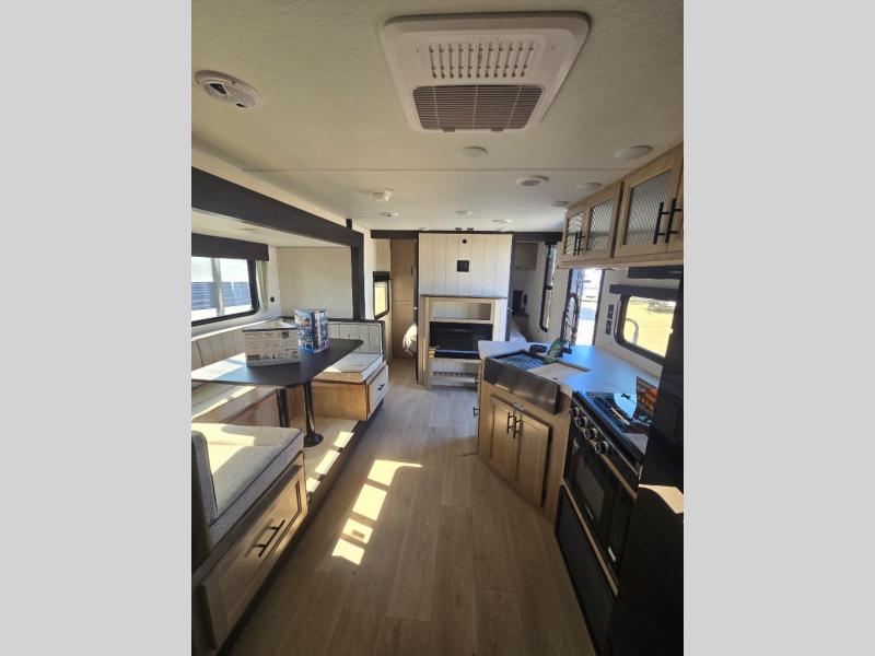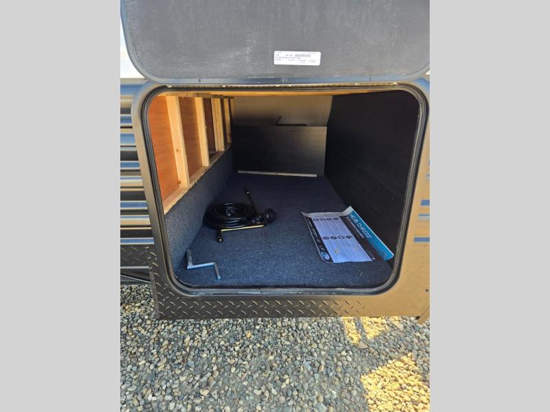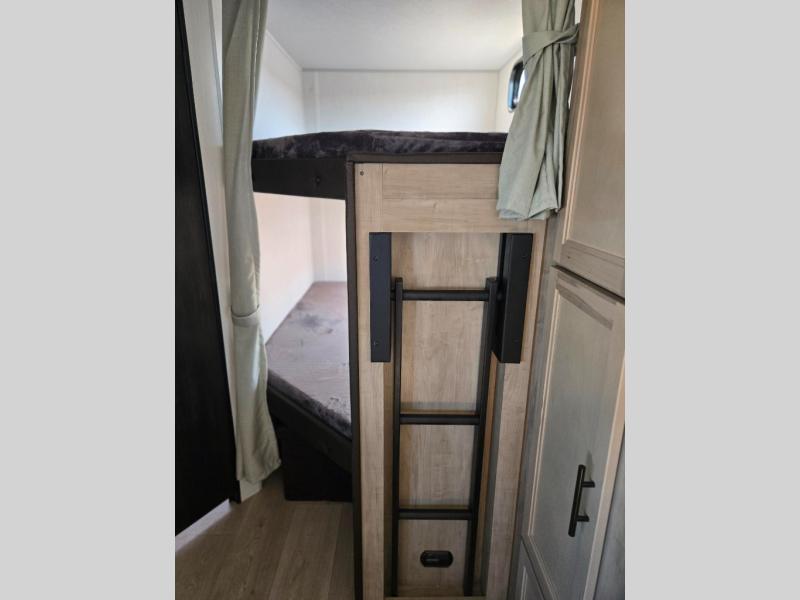 You will love the space provided in this dual entry Cherokee Grey Wolf travel trailer that has double-size bunks! The rear entry door leads right into the full bath allowing easy access from outside when you need to use the bathroom while you're enjoying the great outdoors. The large U-shaped dinette slide will not only seat everyone comfortably for a meal or a game, but since it also slides out, it opens up the interior even more to give you plenty of space for foot traffic. For all of your outdoor gear, you will find the outside storage compartments handy for stowing away your things when not in use. While the kids enjoy their bunk beds, you will enjoy a good night's rest in your RV king bed with wardrobes on either side up in the front private bedroom!
