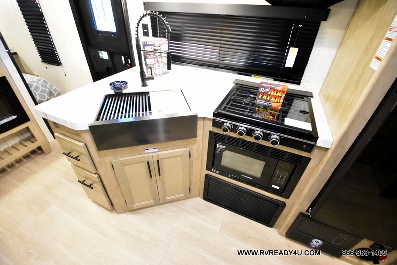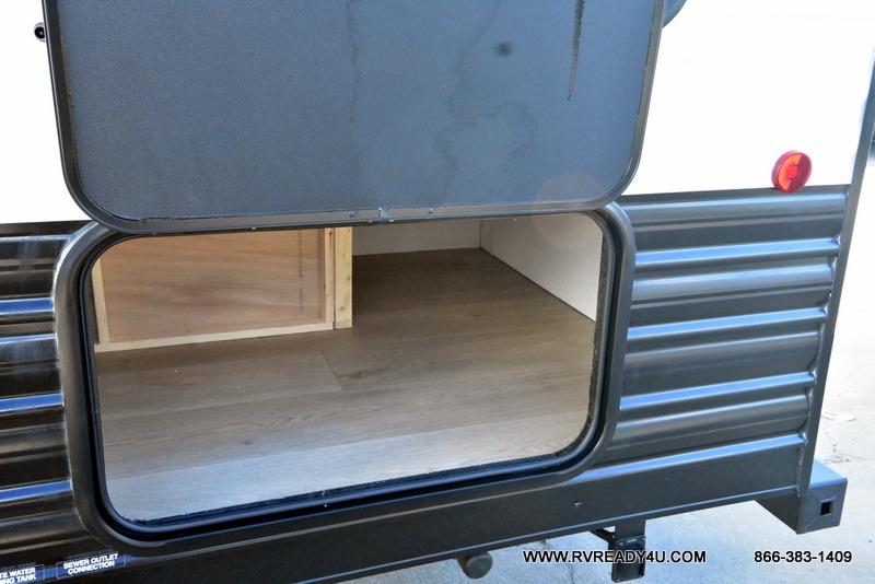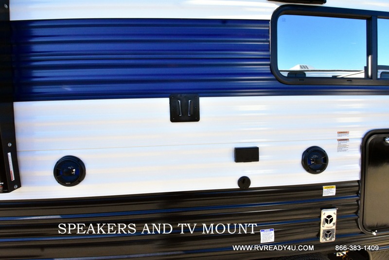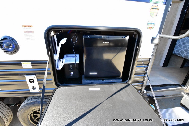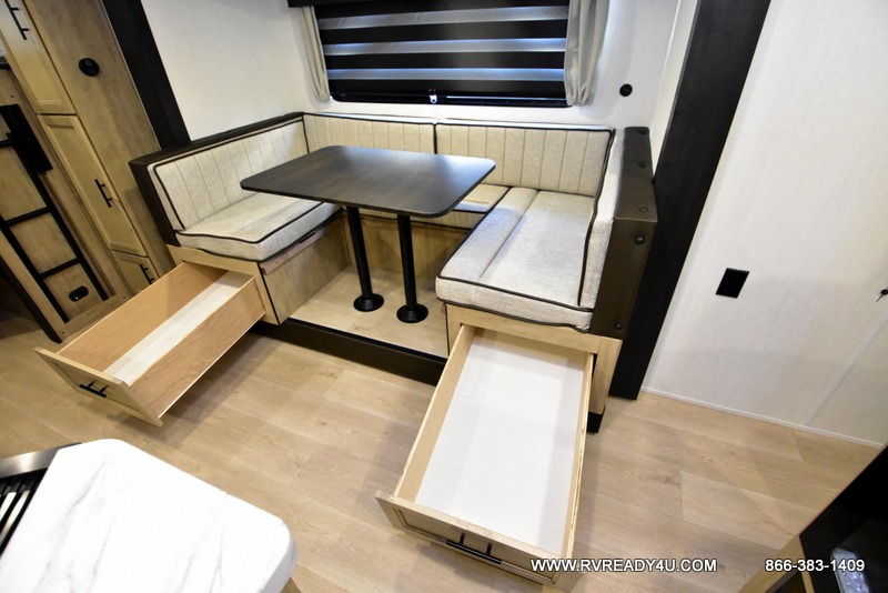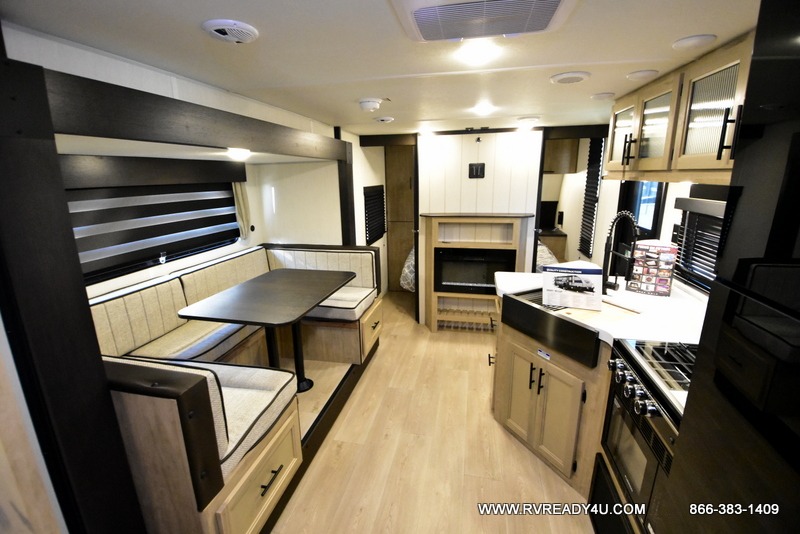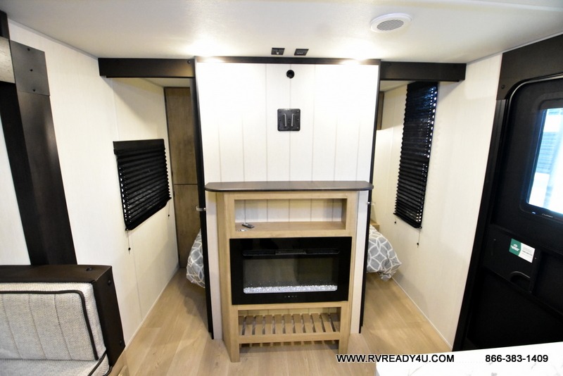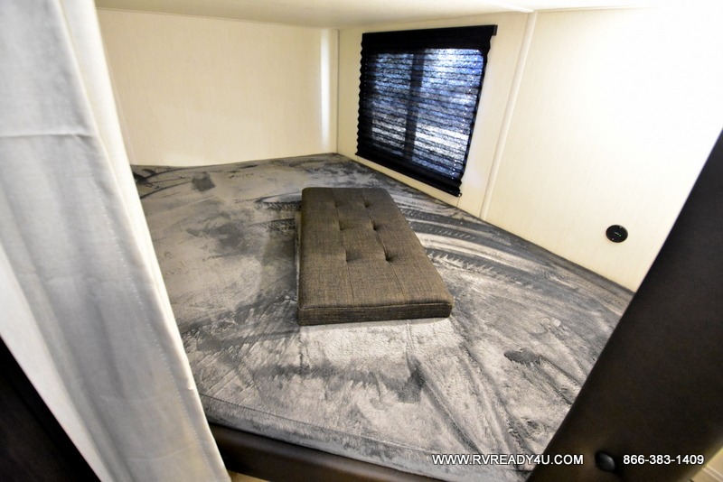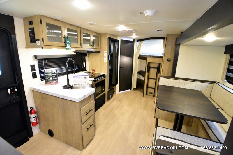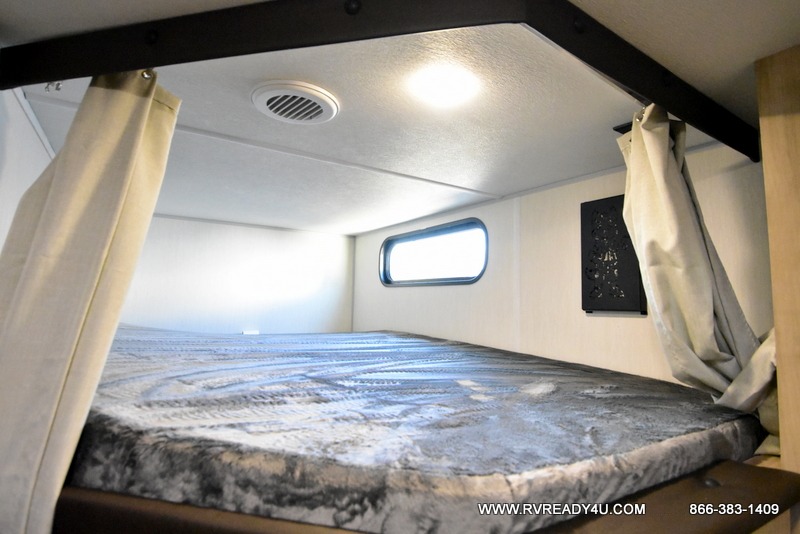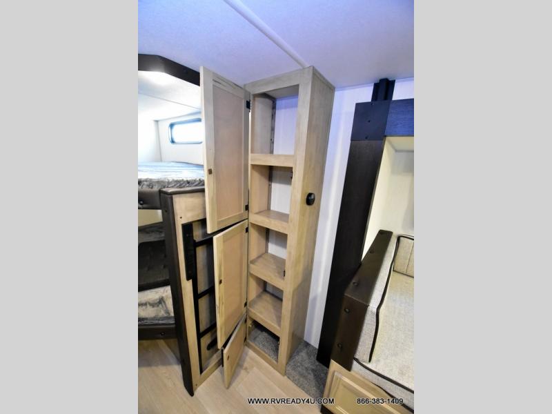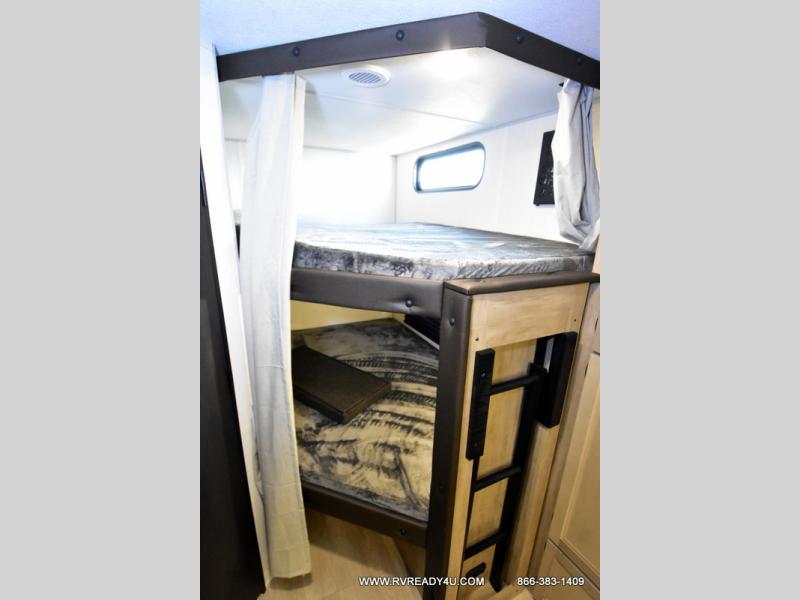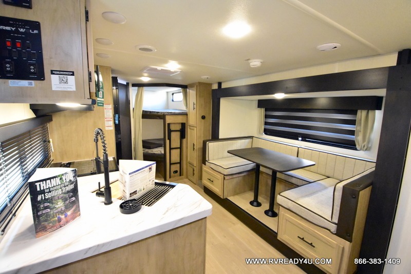 You will love the space provided in this dual entry Cherokee Grey Wolf travel trailer that has double-size bunks! The rear entry door leads right into the full bath allowing easy access from outside when you need to use the bathroom while you're enjoying the great outdoors. The large U-shaped dinette slide will not only seat everyone comfortably for a meal or a game, but since it also slides out, it opens up the interior even more to give you plenty of space for foot traffic. For all of your outdoor gear, you will find the outside storage compartments handy for stowing away your things when not in use. While the kids enjoy their bunk beds, you will enjoy a good night's rest in your RV king bed with wardrobes on either side up in the front private bedroom!