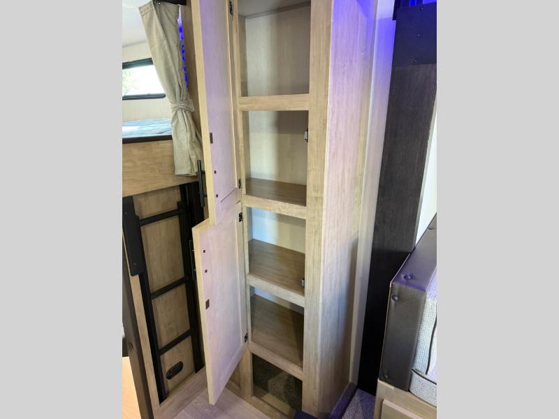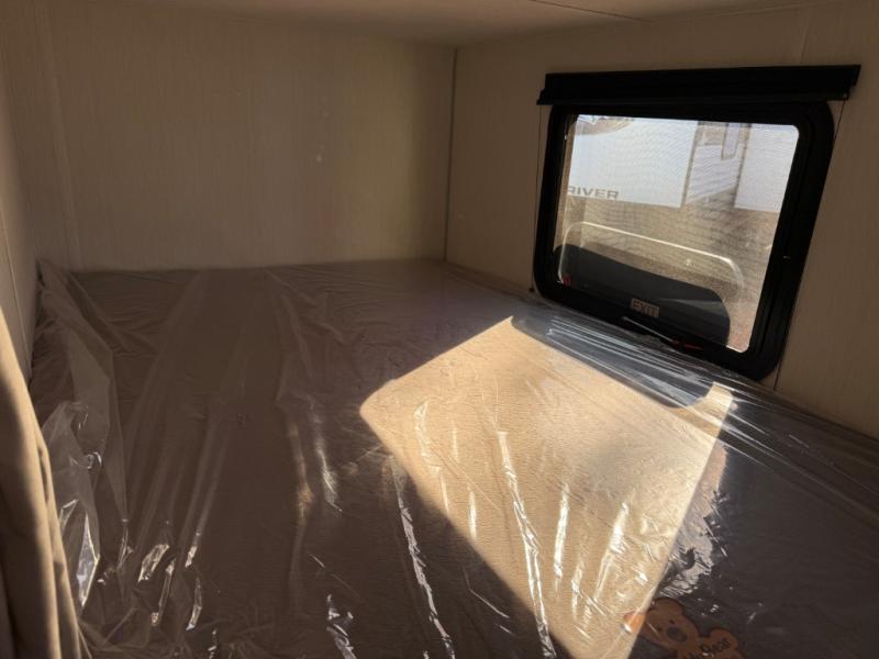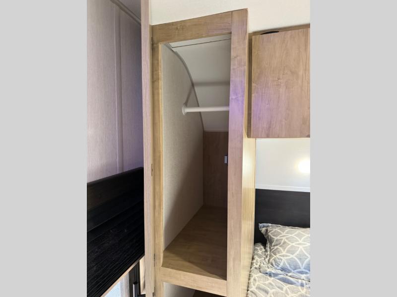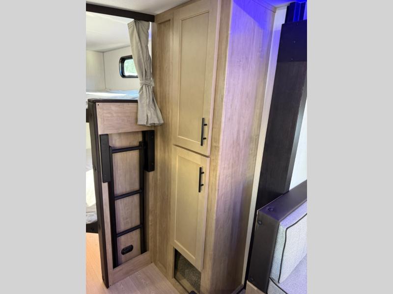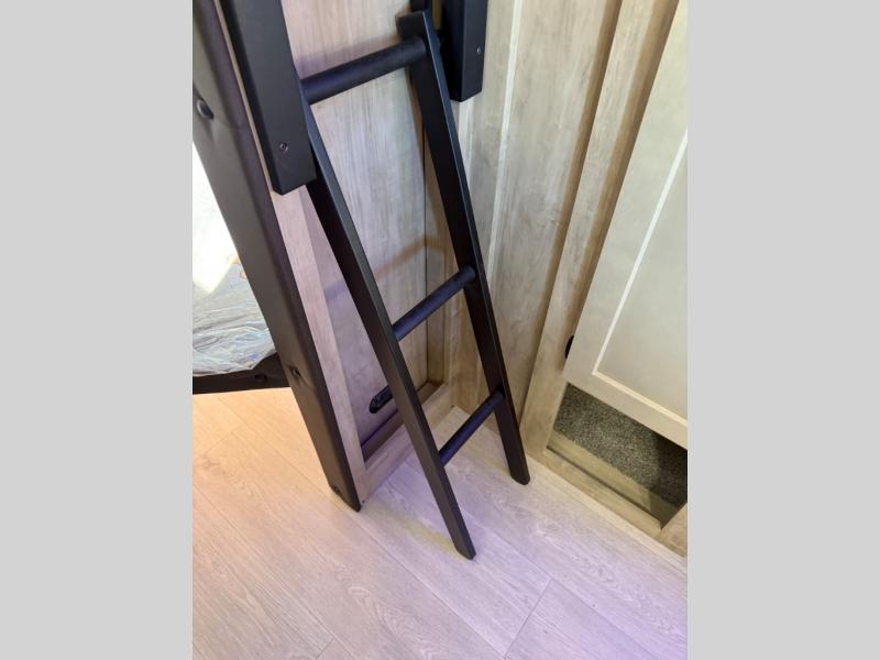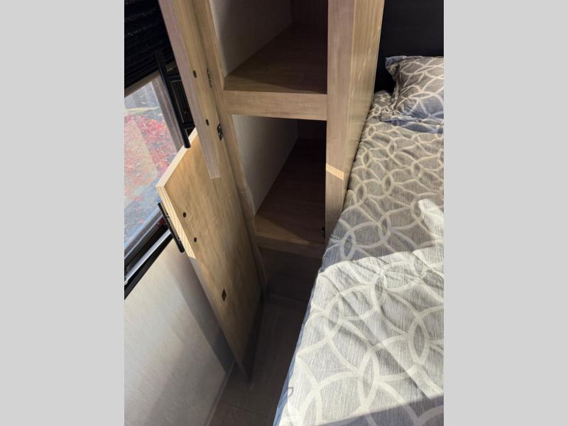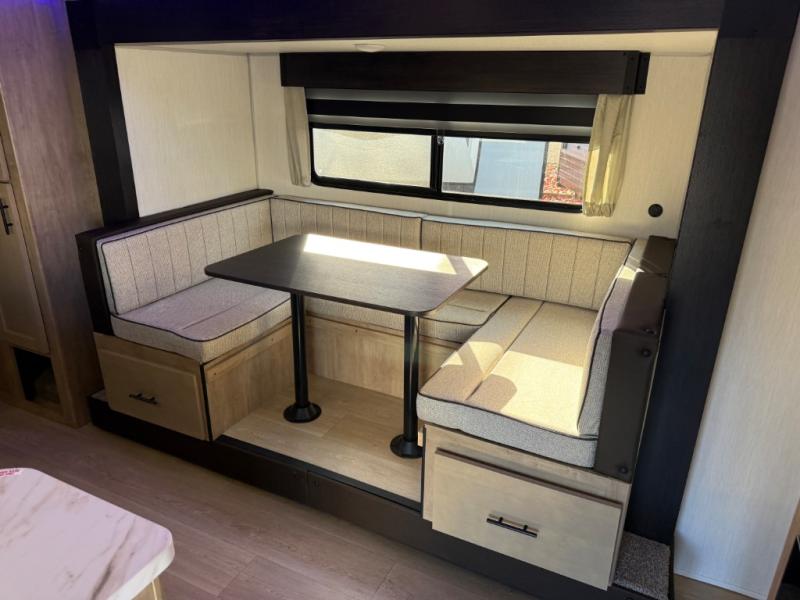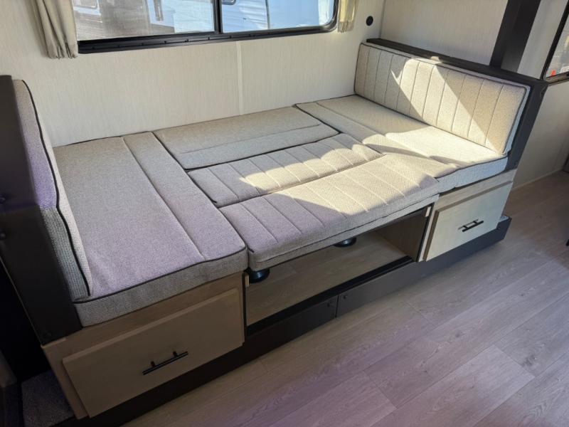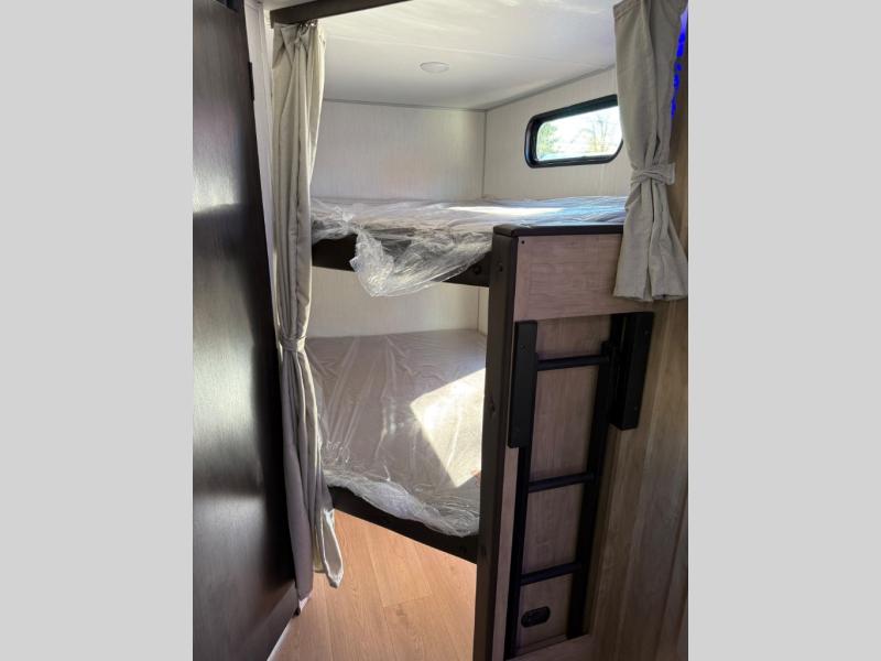 You will love the space provided in this dual entry Cherokee Grey Wolf travel trailer that has double-size bunks! The rear entry door leads right into the full bath allowing easy access from outside when you need to use the bathroom while you're enjoying the great outdoors. The large U-shaped dinette slide will not only seat everyone comfortably for a meal or a game, but since it also slides out, it opens up the interior even more to give you plenty of space for foot traffic. For all of your outdoor gear, you will find the outside storage compartments handy for stowing away your things when not in use. While the kids enjoy their bunk beds, you will enjoy a good night's rest in your RV king bed with wardrobes on either side up in the front private bedroom!