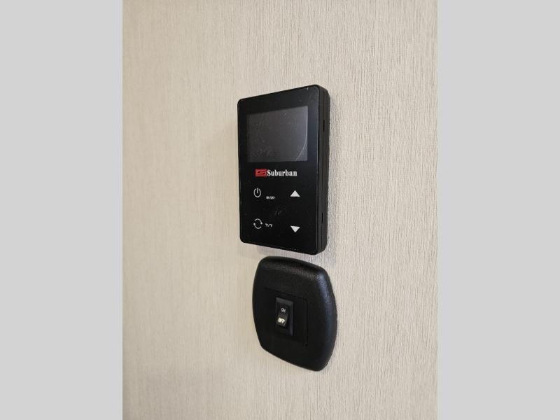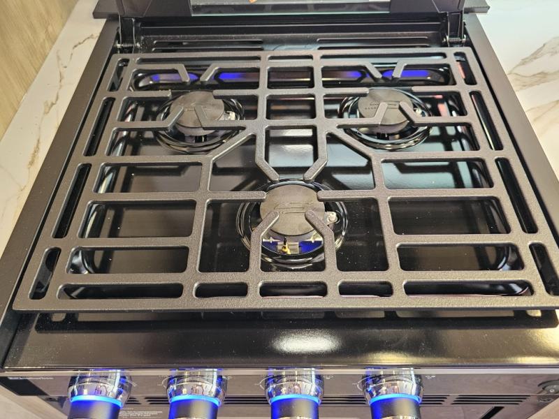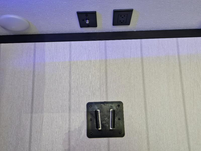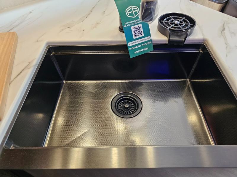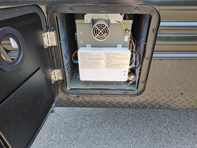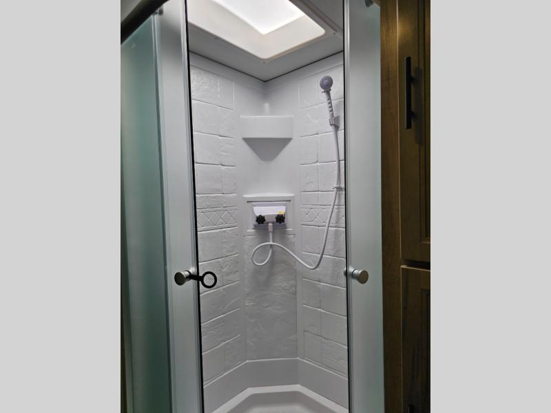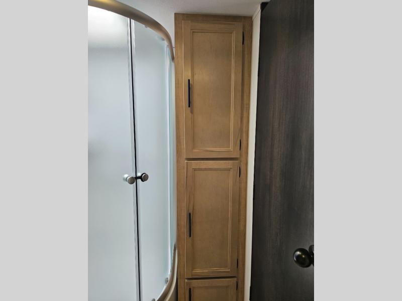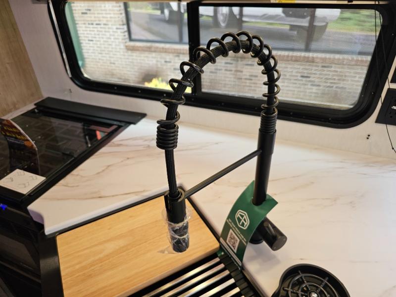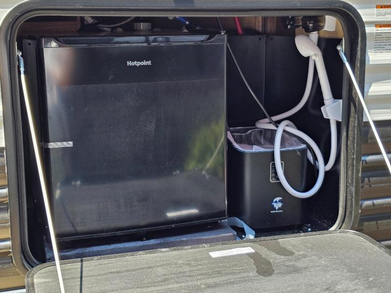 Power awning, outside shower (hot/cold), black tank flush, RV grill quick connect