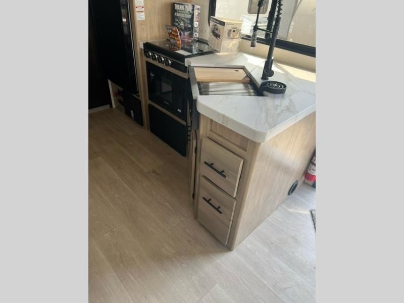 This Cherokee Grey Wolf travel trailer is perfect for your small family and will leave you planning your next outing before you are back from your current weekend away! You will find all of the comforts you need with plenty of livable space including a U-shaped dinette slide. There is also a sofa for more seating when company arrives, and there are end tables on either side to prevent spills. A spacious walk-through bath leads to a front private bedroom where you will enjoy a great night's rest on a comfortable RV king bed. You will find ample storage for clothing in the wardrobes that are above handy nightstands for your personal things.