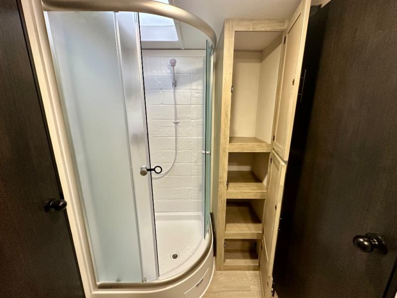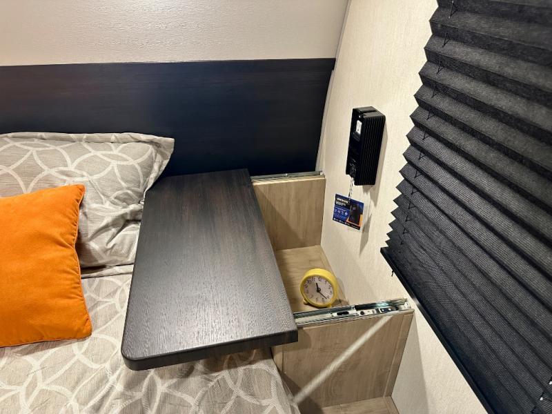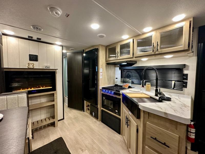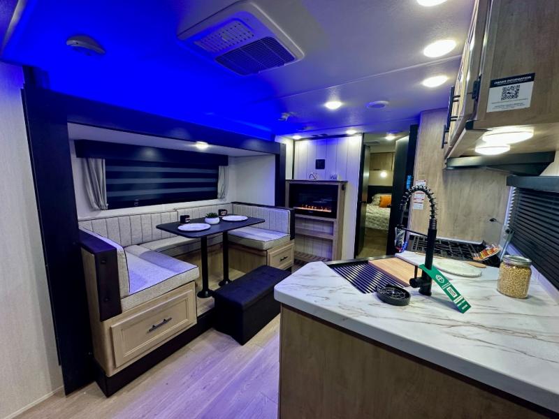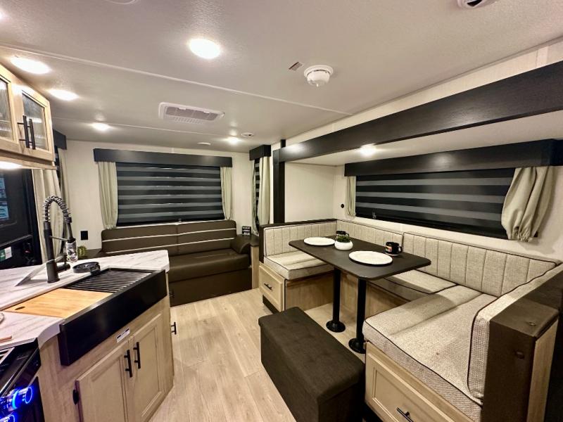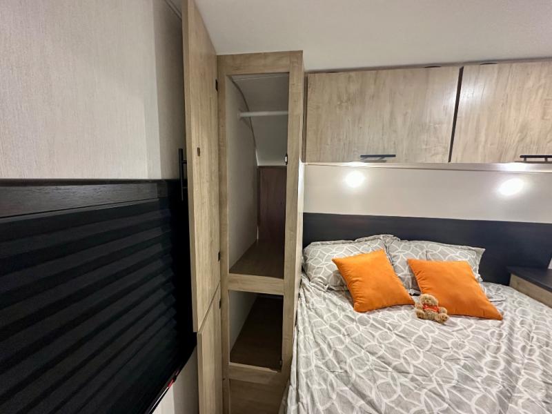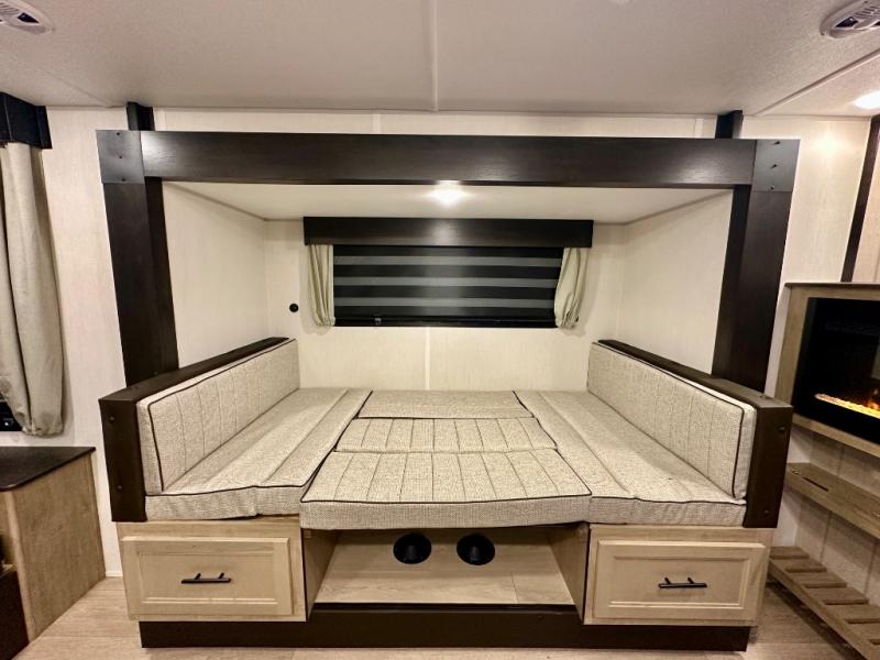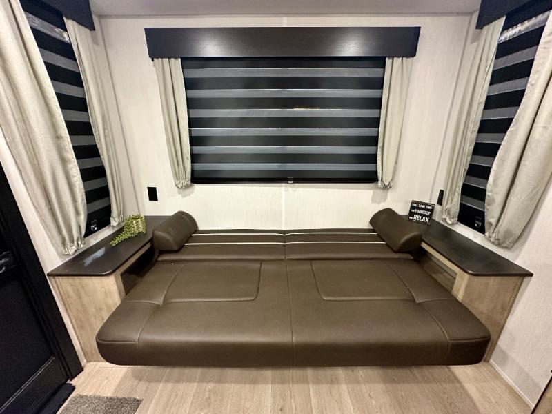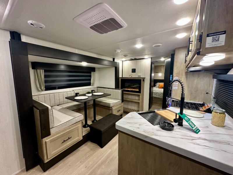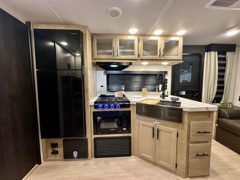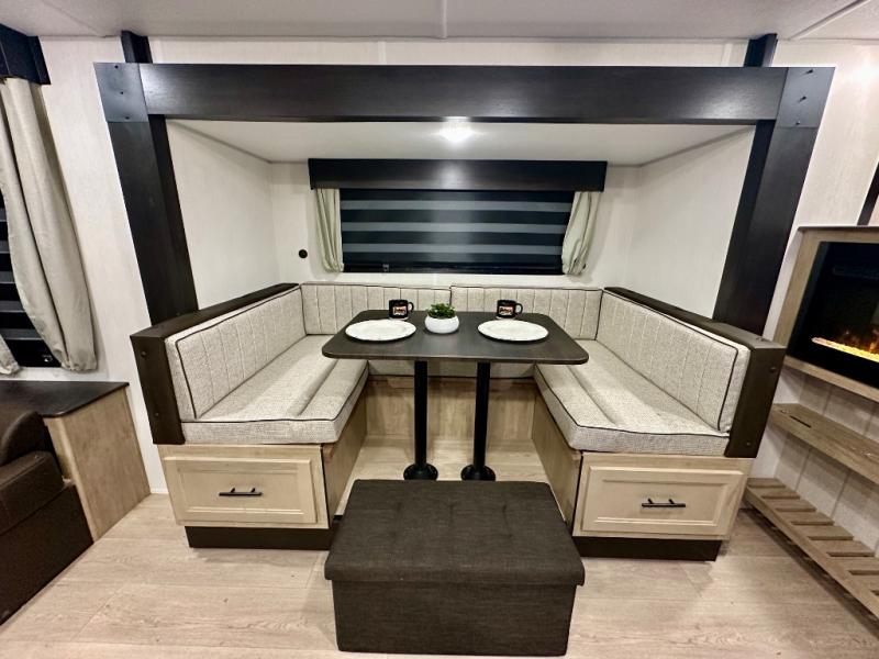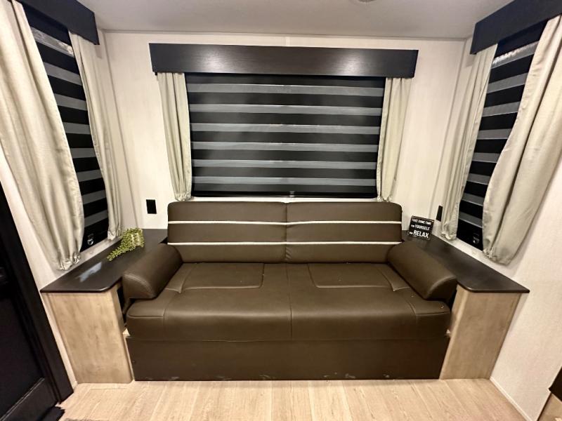 This Cherokee Grey Wolf travel trailer is perfect for your small family and will leave you planning your next outing before you are back from your current weekend away! You will find all of the comforts you need with plenty of livable space including a U-shaped dinette slide. There is also a sofa for more seating when company arrives, and there are end tables on either side to prevent spills. A spacious walk-through bath leads to a front private bedroom where you will enjoy a great night's rest on a comfortable RV king bed. You will find ample storage for clothing in the wardrobes that are above handy nightstands for your personal things. There are even lights mounted above the bed on each side which makes it easy to read a couple of chapters before drifting off to sleep.