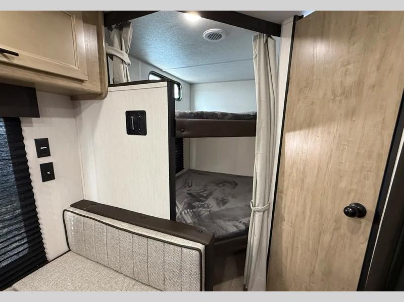 This Cherokee Grey Wolf travel trailer is perfect for your small family and will leave you planning your next outing before you are back from your current weekend away! You will find all of the comforts you need with plenty of livable space including a U-shaped dinette slide. There is also a sofa for more seating when company arrives, and there are end tables on either side to prevent spills. A spacious walk-through bath leads to a front private bedroom where you will enjoy a great night's rest on a comfortable RV king bed. You will find ample storage for clothing in the wardrobes that are above handy nightstands for your personal things.
