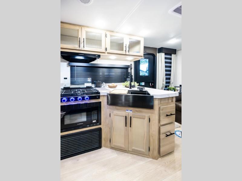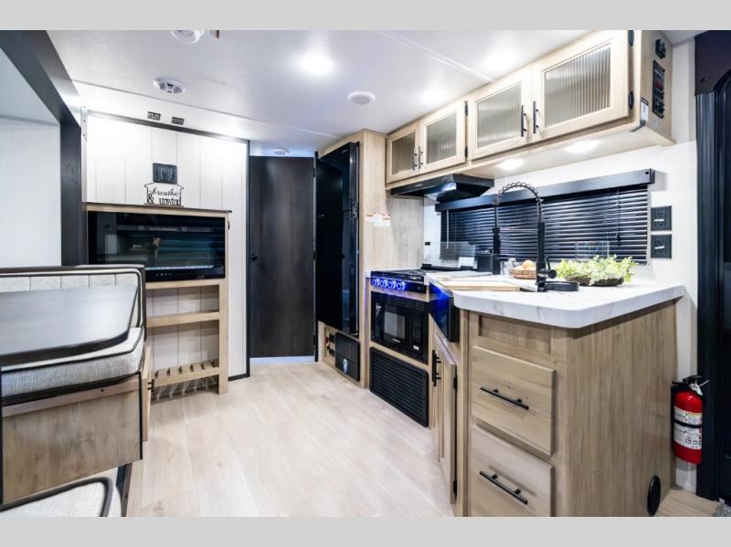 This Cherokee Grey Wolf travel trailer is perfect for your small family and will leave you planning your next outing before you are back from your current weekend away! You will find all of the comforts you need with plenty of livable space including a U-shaped dinette slide. There is also a sofa for more seating when company arrives, and there are end tables on either side to prevent spills. A spacious walk-through bath leads to a front private bedroom where you will enjoy a great night's rest on a comfortable RV king bed. You will find ample storage for clothing in the wardrobes that are above handy nightstands for your personal things.