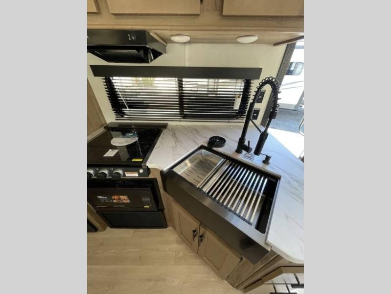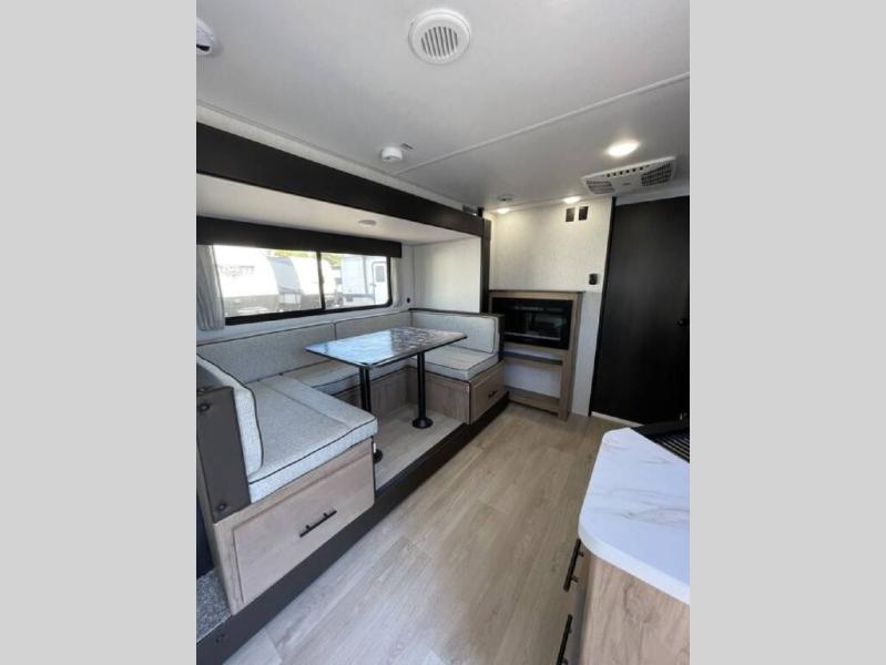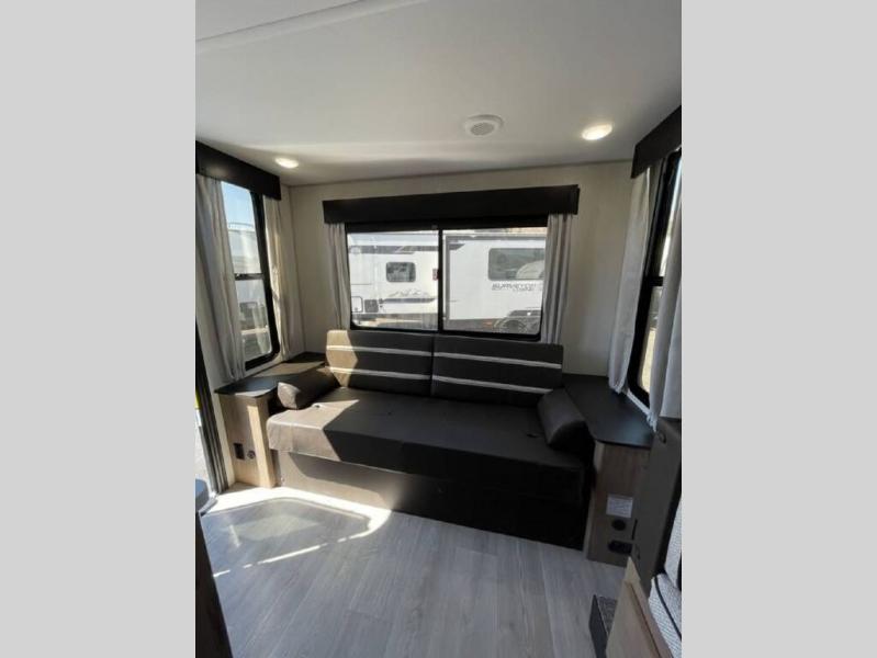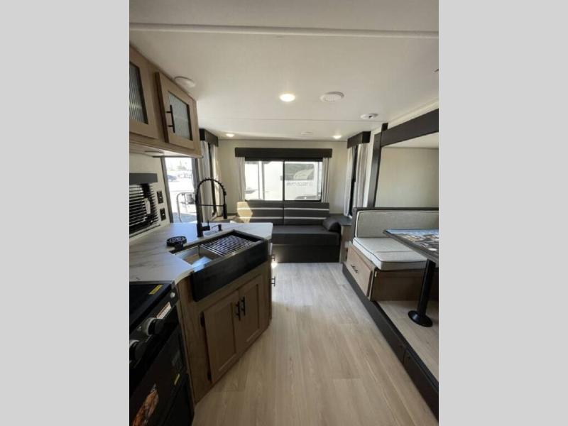 This Cherokee Grey Wolf travel trailer is perfect for your small family and will leave you planning your next outing before you are back from your current weekend away! You will find all of the comforts you need with plenty of livable space including a U-shaped dinette slide. There is also a sofa for more seating when company arrives, and there are end tables on either side to prevent spills. A spacious walk-through bath leads to a front private bedroom where you will enjoy a great night's rest on a comfortable RV king bed. You will find ample storage for clothing in the wardrobes that are above handy nightstands for your personal things.