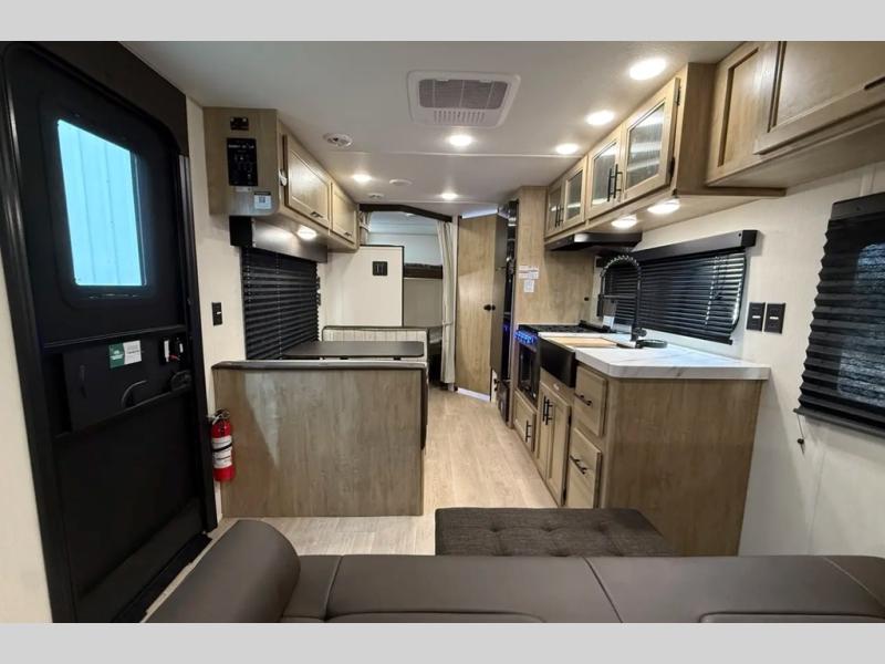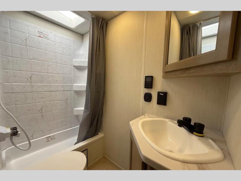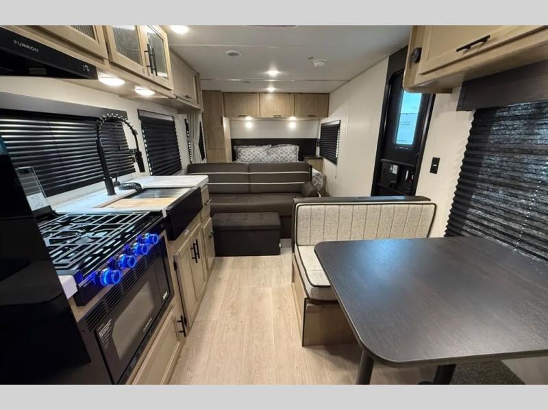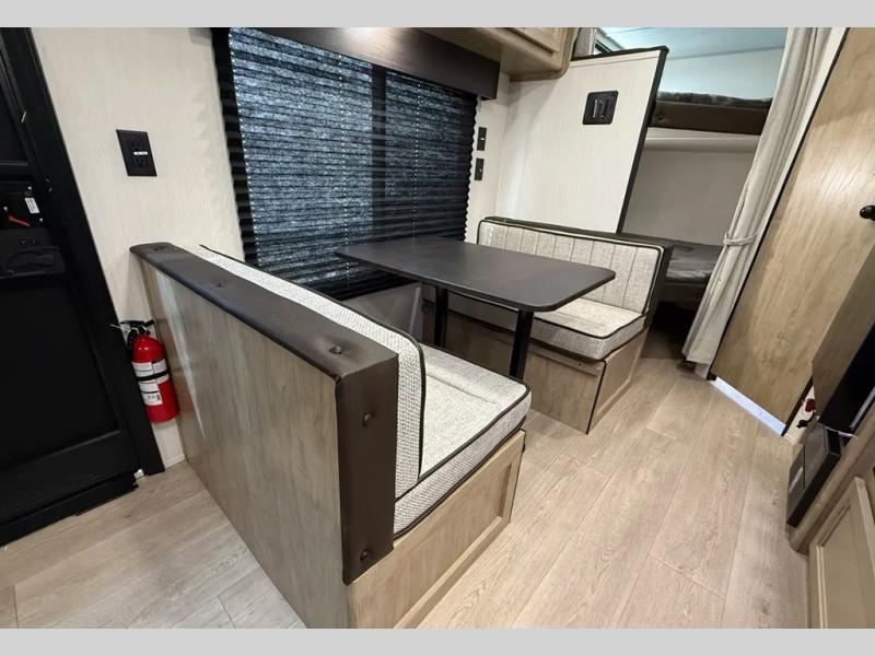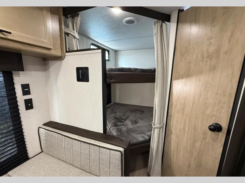 This Cherokee Grey Wolf travel trailer is perfect for your small family and will leave you planning your next outing before you are back from your current weekend away! You will find all of the comforts you need with plenty of livable space including a U-shaped dinette slide. There is also a sofa for more seating when company arrives, and there are end tables on either side to prevent spills. A spacious walk-through bath leads to a front private bedroom where you will enjoy a great night's rest on a comfortable RV king bed. You will find ample storage for clothing in the wardrobes that are above handy nightstands for your personal things.