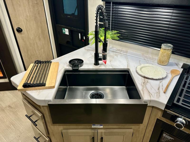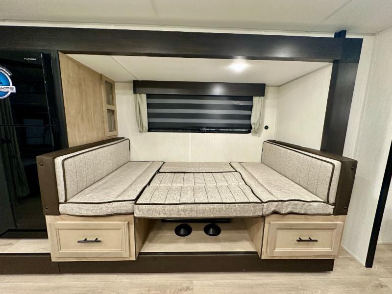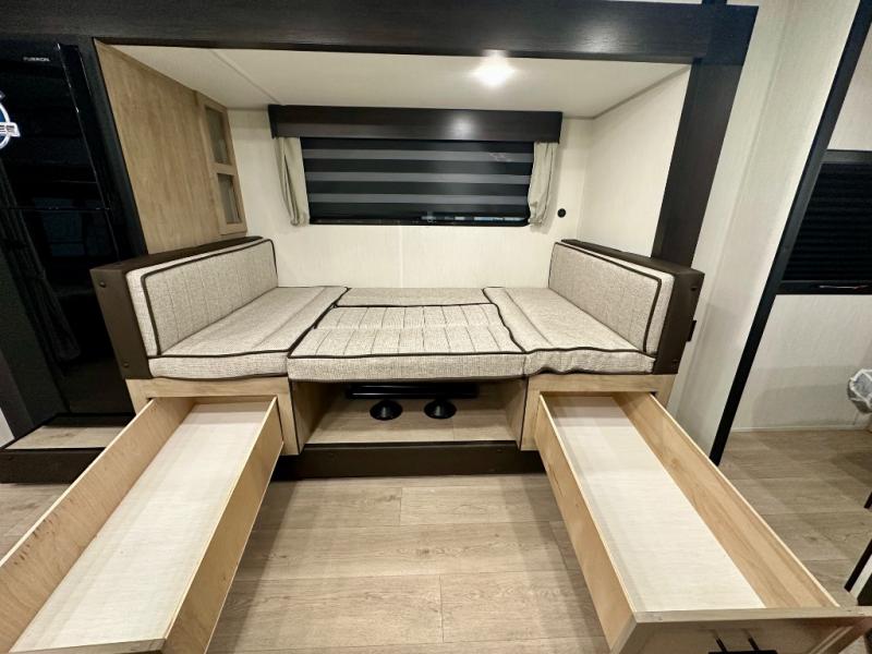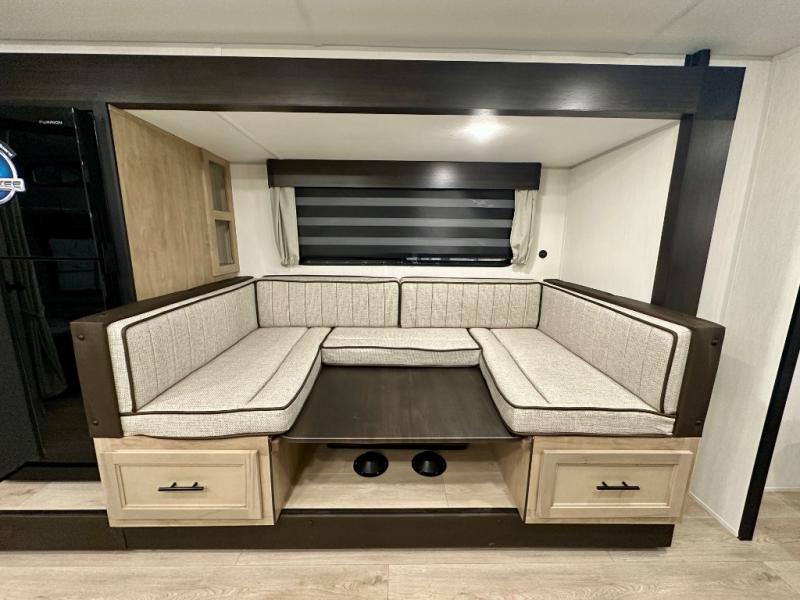 Enjoy time at the campground in this spacious travel trailer with a front private bedroom and double-size bunks for guests! The full interior kitchen and outside kitchen will let you make meals each day, and everyone can dine around the U-shaped dinette or under the 15' awning outside! This unit also includes ample storage space, including hidden shelves behind the fireplace and outside storage!
