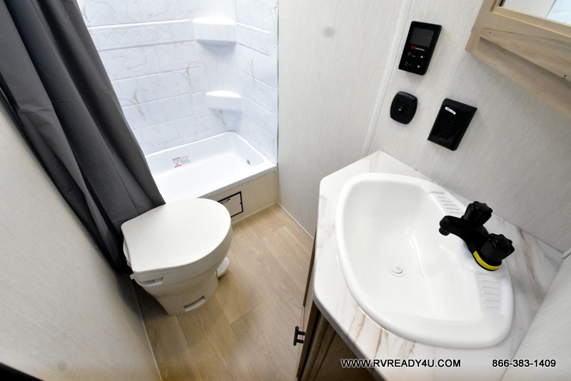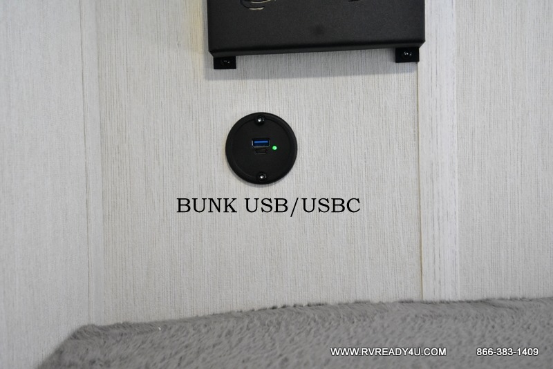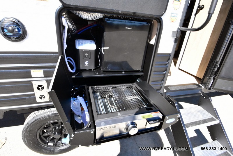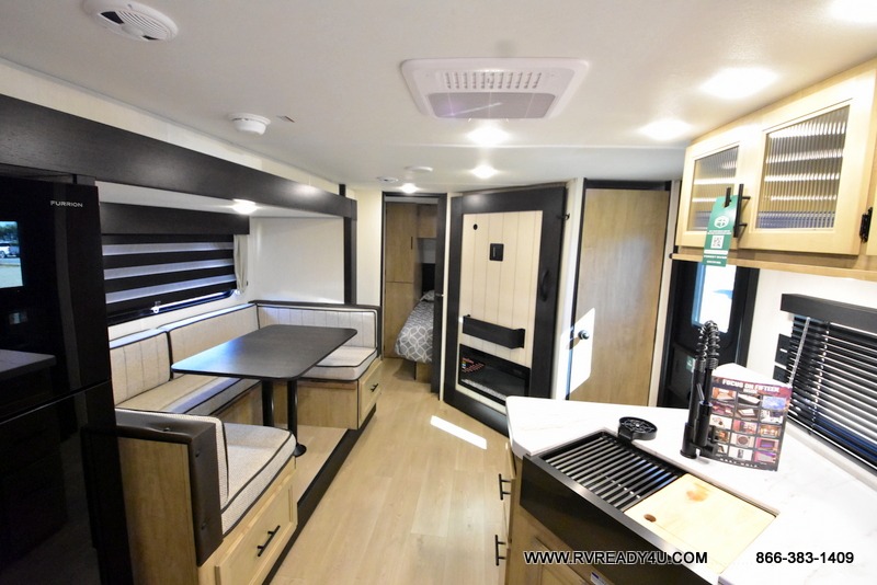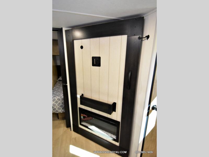 Enjoy time at the campground in this spacious travel trailer with a front private bedroom and double-size bunks for guests! The full interior kitchen and outside kitchen will let you make meals each day, and everyone can dine around the U-shaped dinette or under the 15' awning outside! This unit also includes ample storage space, including hidden shelves behind the fireplace and outside storage!