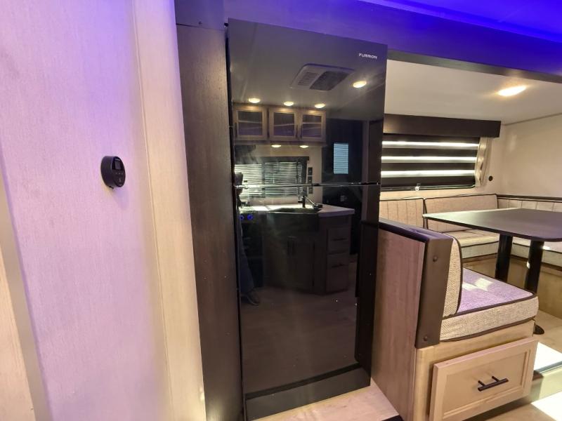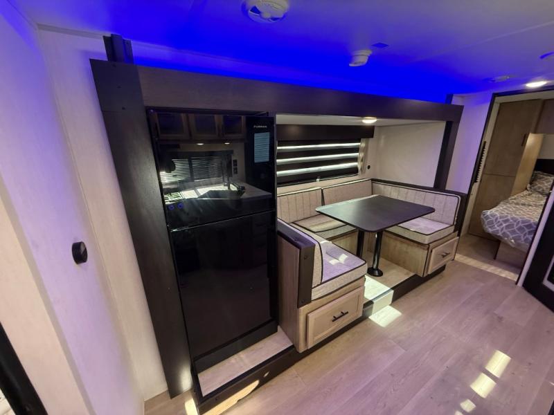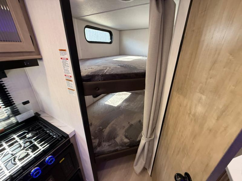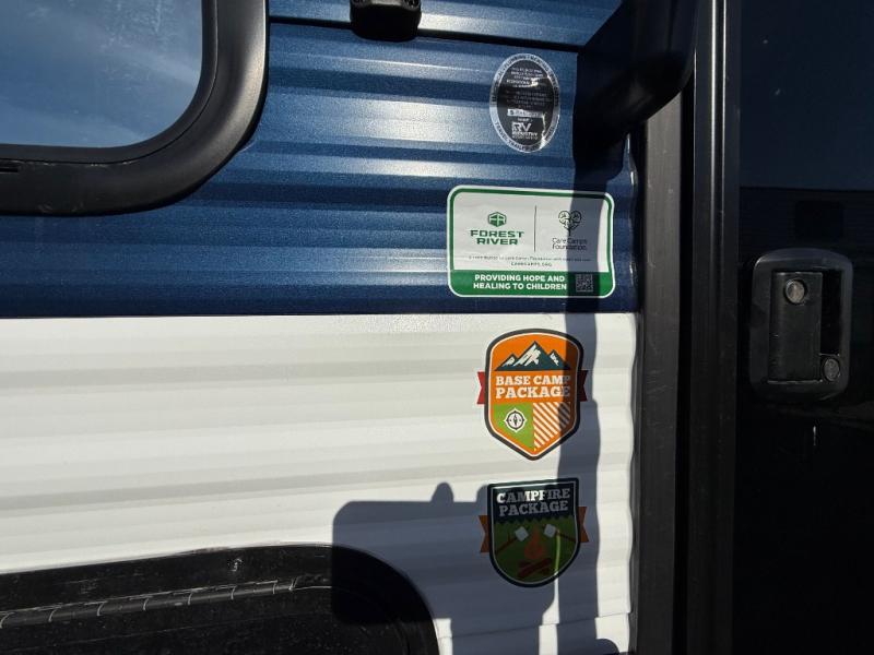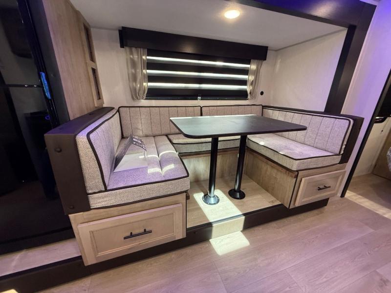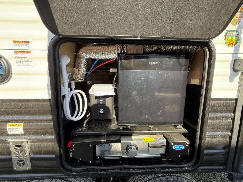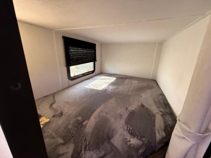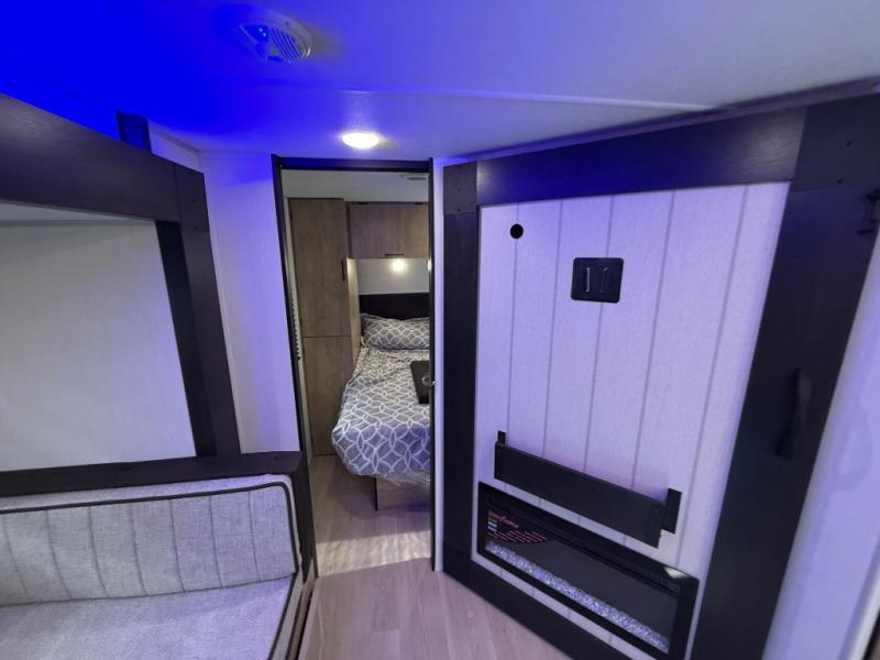 Enjoy time at the campground in this spacious travel trailer with a front private bedroom and double-size bunks for guests! The full interior kitchen and outside kitchen will let you make meals each day, and everyone can dine around the U-shaped dinette or under the 15' awning outside! This unit also includes ample storage space, including hidden shelves behind the fireplace and outside storage!