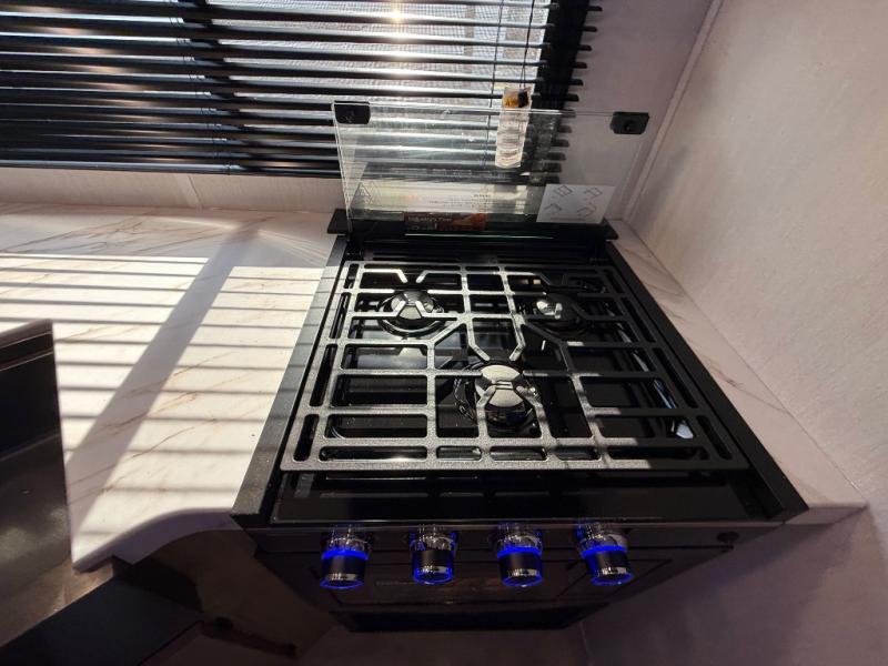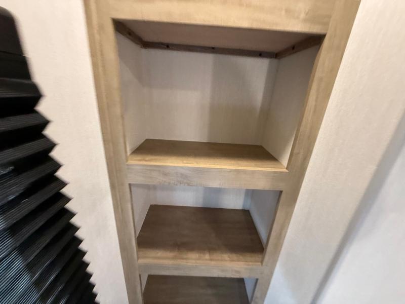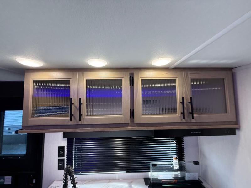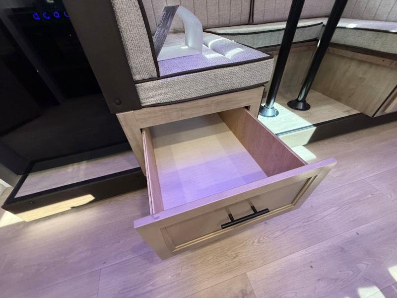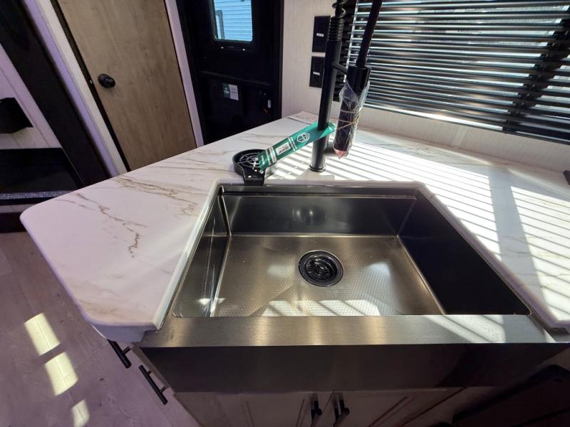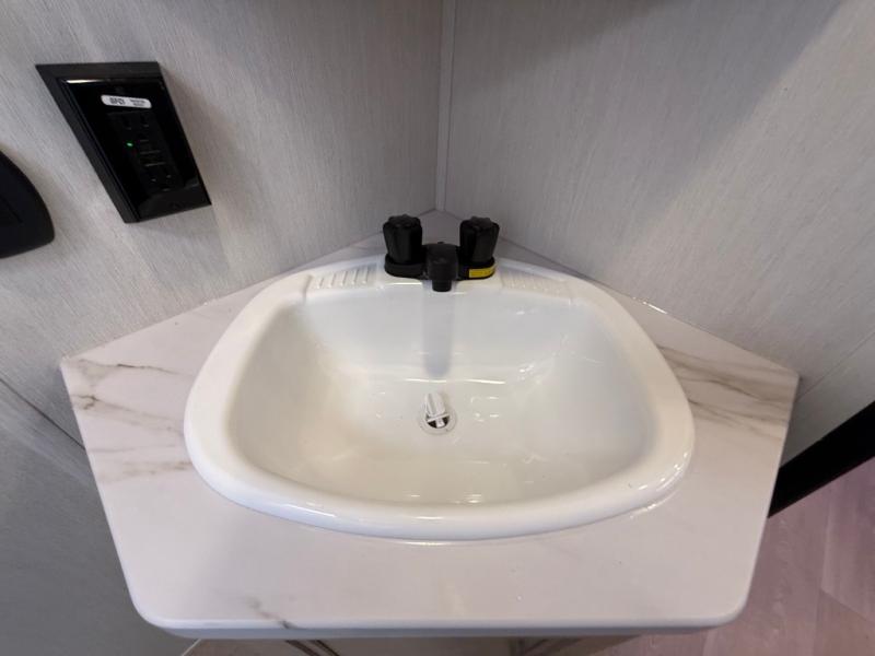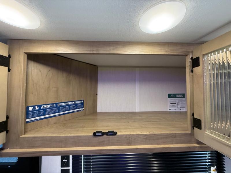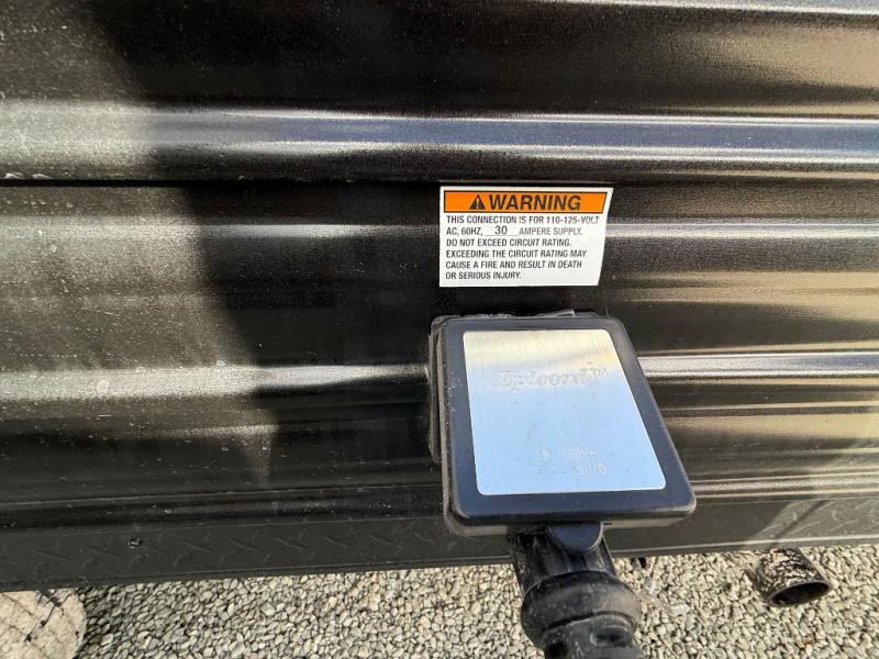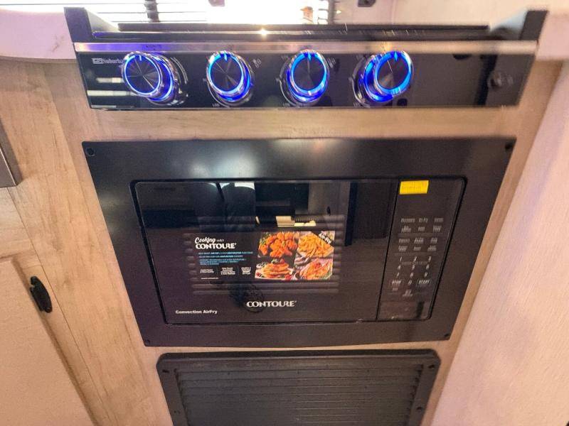 Enjoy time at the campground in this spacious travel trailer with a front private bedroom and double-size bunks for guests! The full interior kitchen and outside kitchen will let you make meals each day, and everyone can dine around the U-shaped dinette or under the 15' awning outside! This unit also includes ample storage space, including hidden shelves behind the fireplace and outside storage!