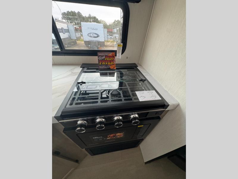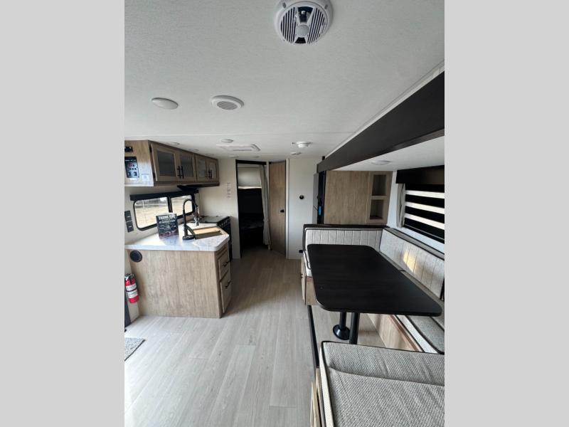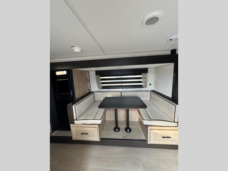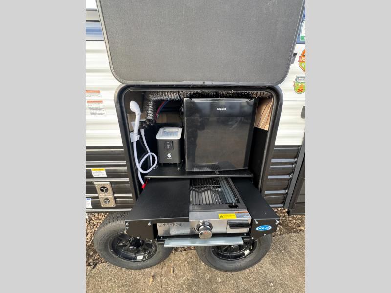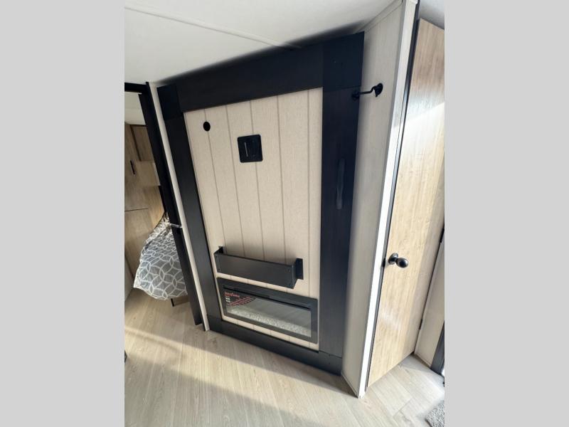 Enjoy time at the campground in this spacious travel trailer with a front private bedroom and double-size bunks for guests! The full interior kitchen and outside kitchen will let you make meals each day, and everyone can dine around the U-shaped dinette or under the 15' awning outside! This unit also includes ample storage space, including hidden shelves behind the fireplace and outside storage!