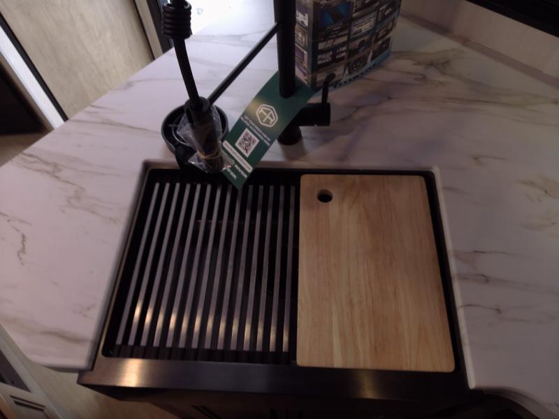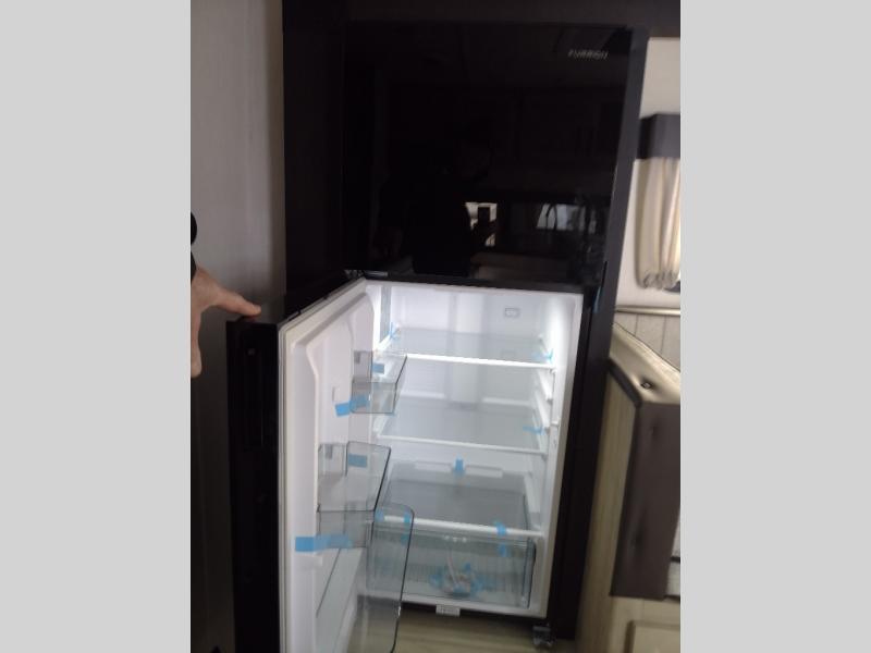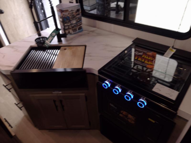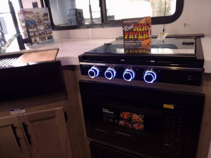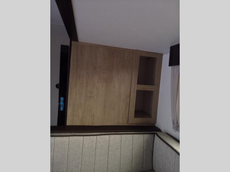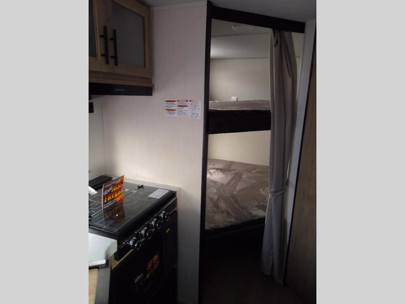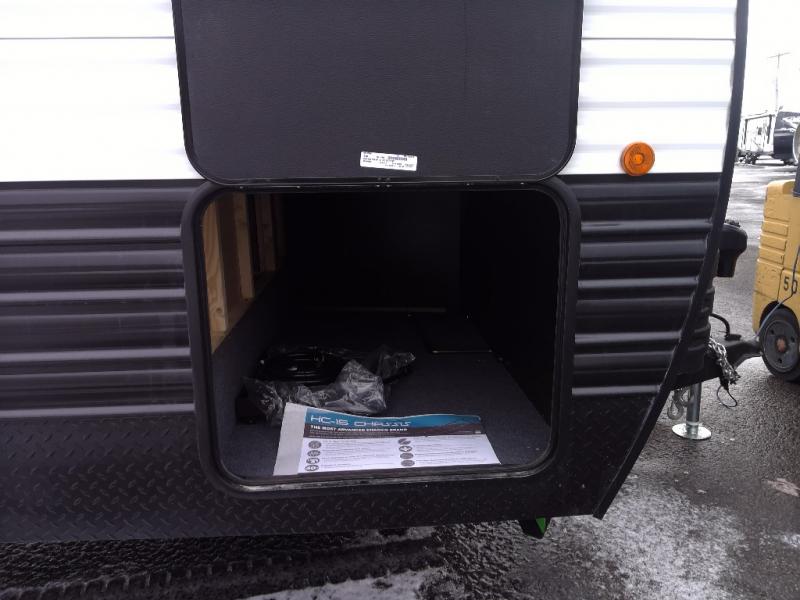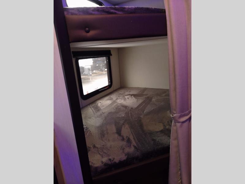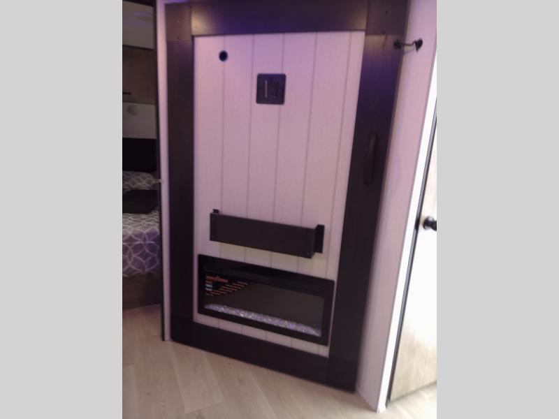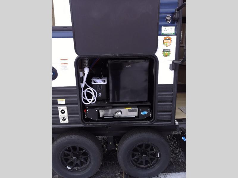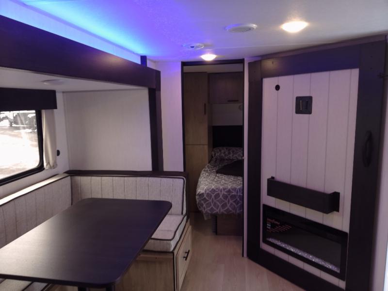 Enjoy time at the campground in this spacious travel trailer with a front private bedroom and double-size bunks for guests! The full interior kitchen and outside kitchen will let you make meals each day, and everyone can dine around the U-shaped dinette or under the 15' awning outside! This unit also includes ample storage space, including hidden shelves behind the fireplace and outside storage!