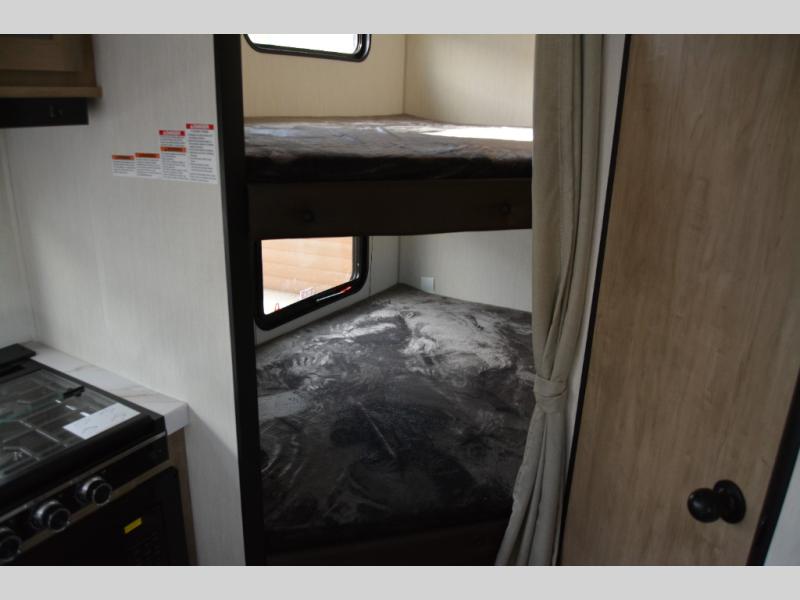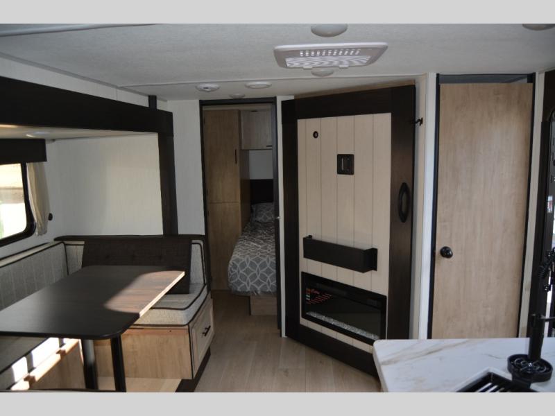 Enjoy time at the campground in this spacious travel trailer with a front private bedroom and double-size bunks for guests! The full interior kitchen and outside kitchen will let you make meals each day, and everyone can dine around the U-shaped dinette or under the 15' awning outside! This unit also includes ample storage space, including hidden shelves behind the fireplace and outside storage!