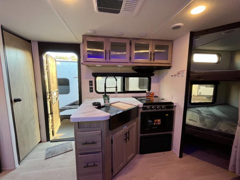 Enjoy time at the campground in this spacious travel trailer with a front private bedroom and double-size bunks for guests! The full interior kitchen and outside kitchen will let you make meals each day, and everyone can dine around the U-shaped dinette or under the 15' awning outside! This unit also includes ample storage space, including hidden shelves behind the fireplace and outside storage!