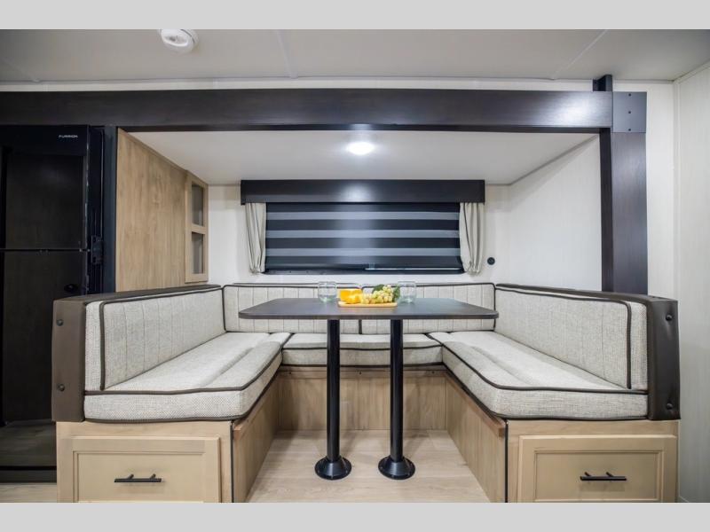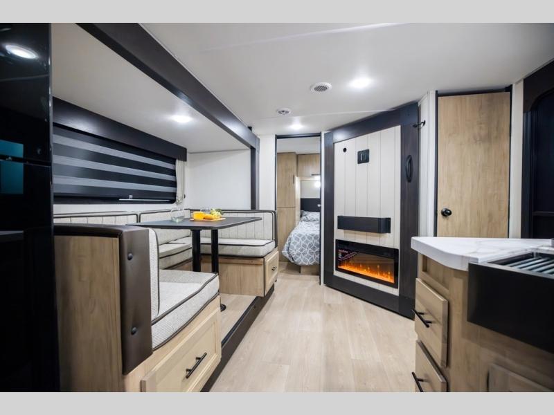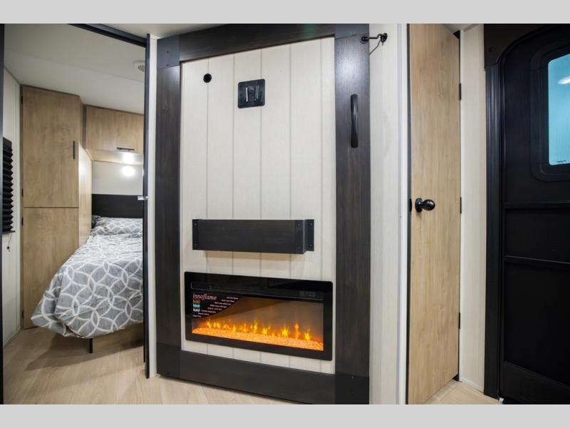 Enjoy time at the campground in this spacious travel trailer with a front private bedroom and double-size bunks for guests! The full interior kitchen and outside kitchen will let you make meals each day, and everyone can dine around the U-shaped dinette or under the 15' awning outside! This unit also includes ample storage space, including hidden shelves behind the fireplace and outside storage!