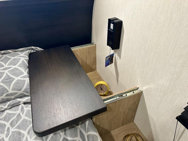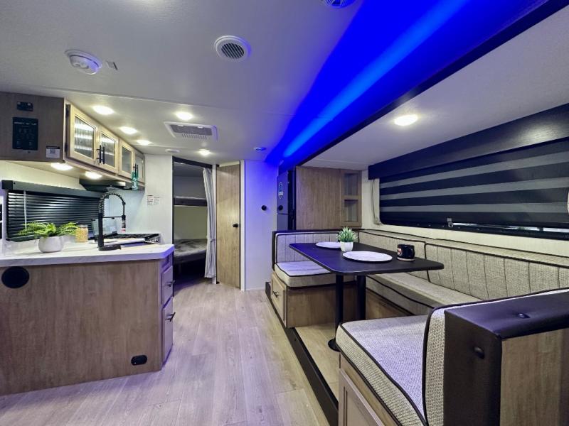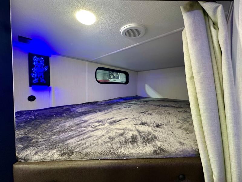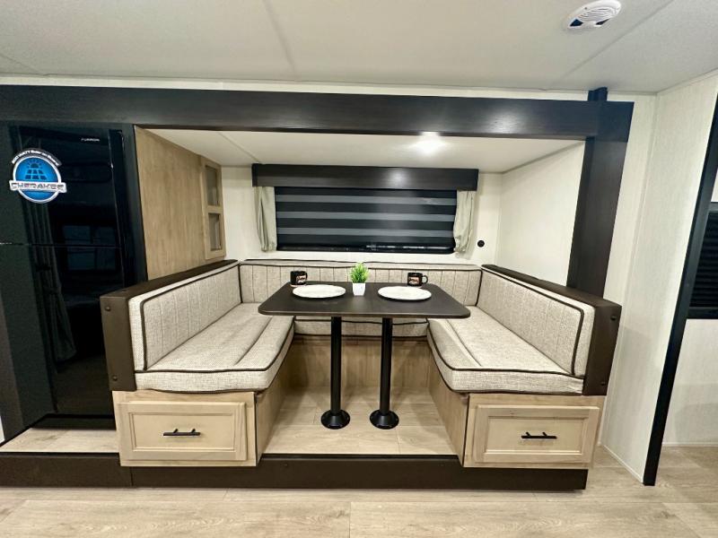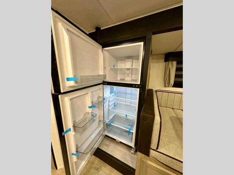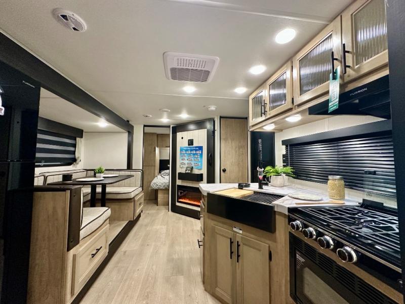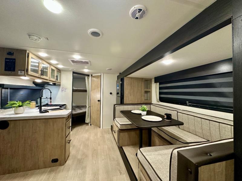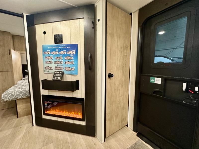 Enjoy time at the campground in this spacious travel trailer with a front private bedroom and double-size bunks for guests! The full interior kitchen and outside kitchen will let you make meals each day, and everyone can dine around the U-shaped dinette or under the 15' awning outside! This unit also includes ample storage space, including hidden shelves behind the fireplace and outside storage!