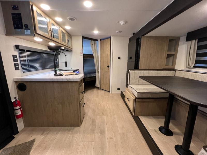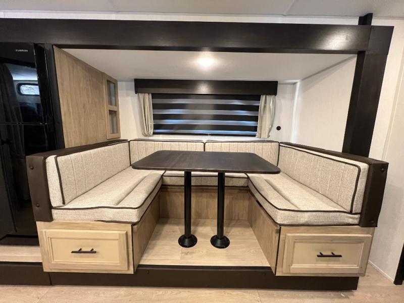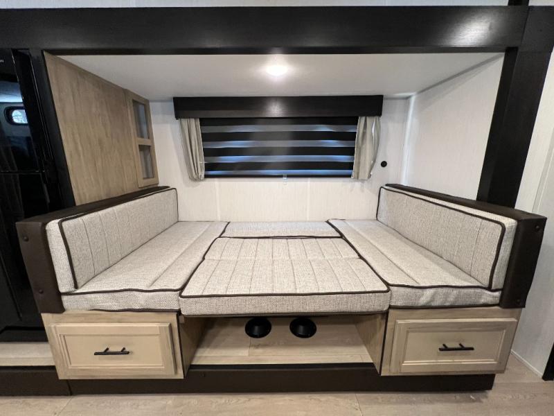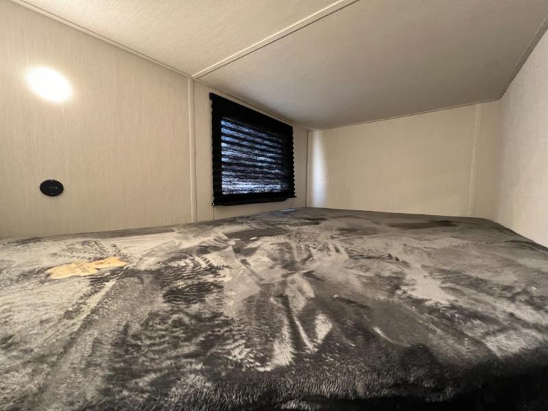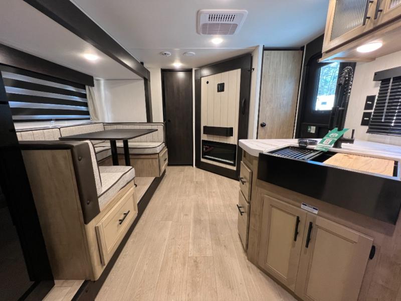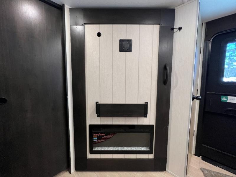 Enjoy time at the campground in this spacious travel trailer with a front private bedroom and double-size bunks for guests! The full interior kitchen and outside kitchen will let you make meals each day, and everyone can dine around the U-shaped dinette or under the 15' awning outside! This unit also includes ample storage space, including hidden shelves behind the fireplace and outside storage!