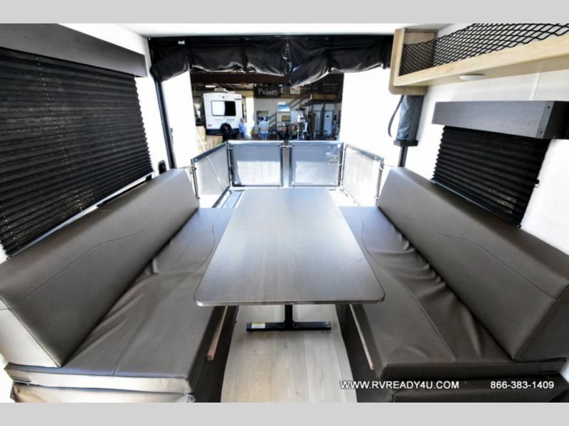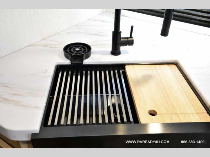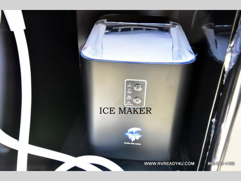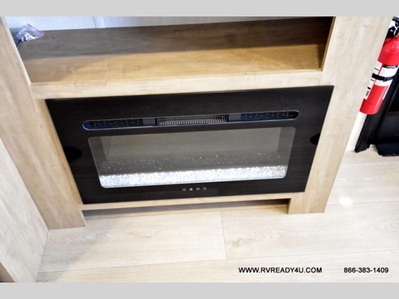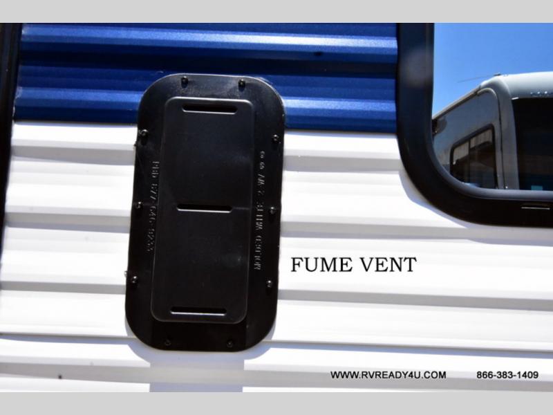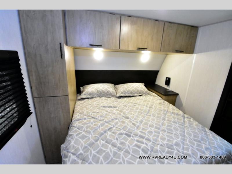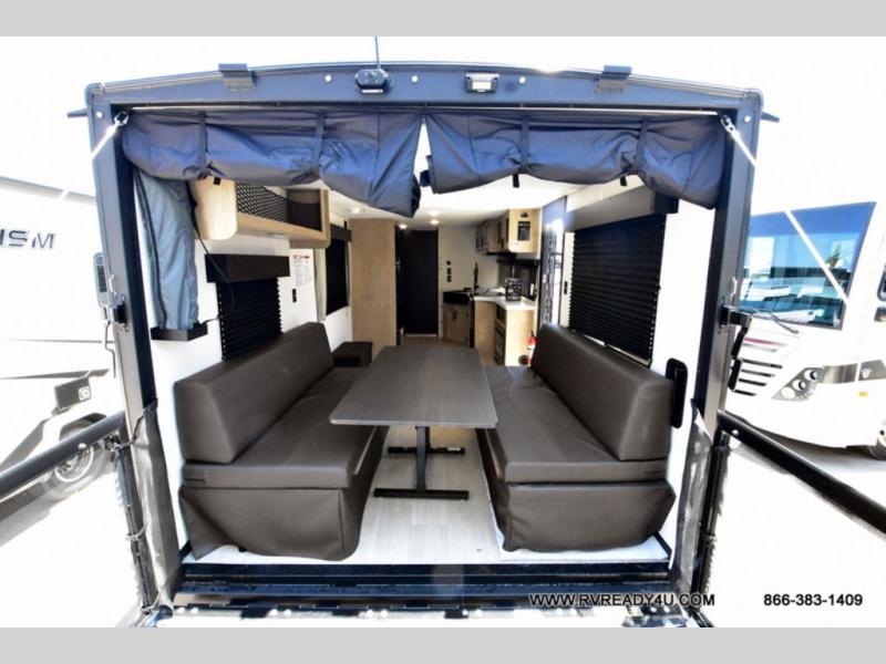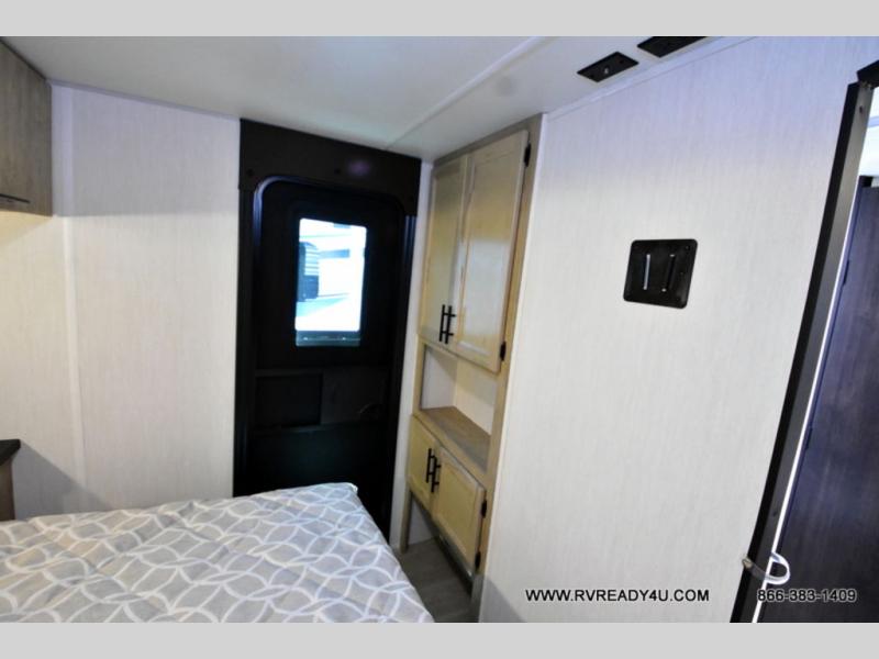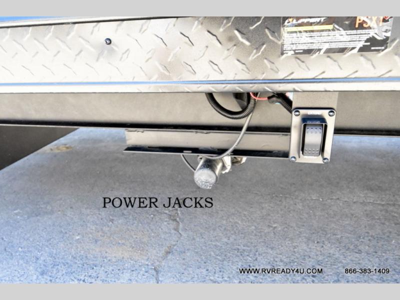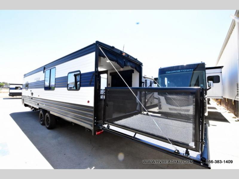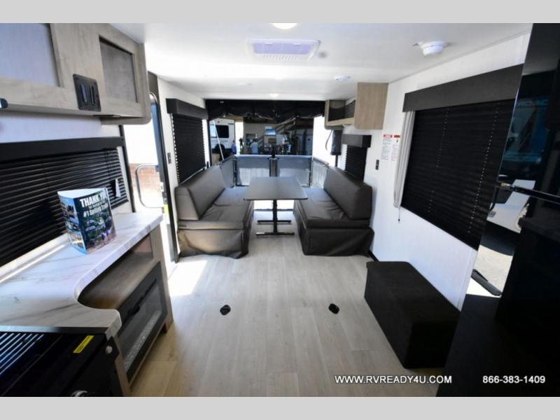This dual entry toy hauler will allow you to enter in through the main living area or the front master bedroom for convenience! There is a walk-through bath that will be easily accessible for everyone, and there is plenty of storage space for personal belongings. Head to the full kitchen to prepare a home cooked meal, or head outdoors to enjoy the mini kitchen. There is also an outside TV mount if you brought a TV along, and a 15' power awning to provide shade. You can easily unload your toys using the ramp door, then relax on the fold-down sofas with a removable table.
