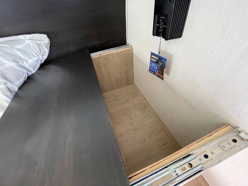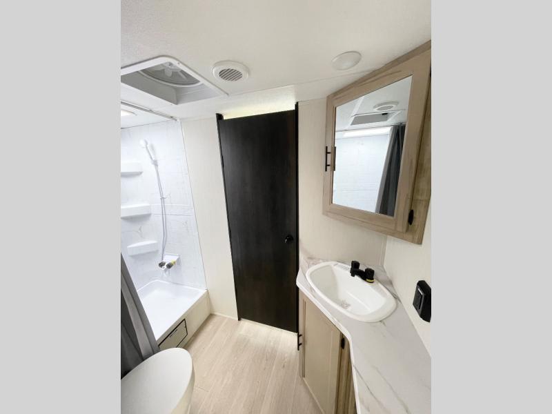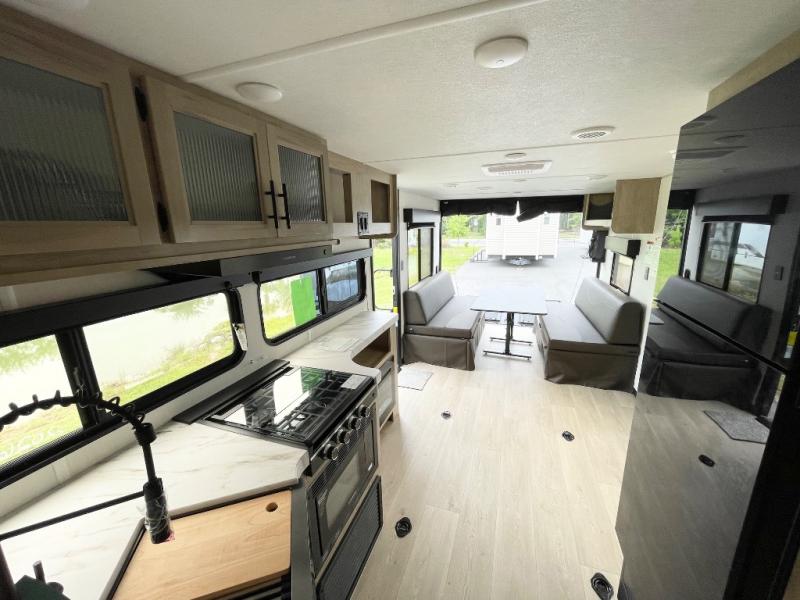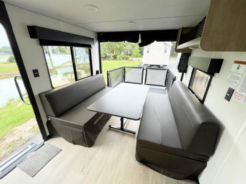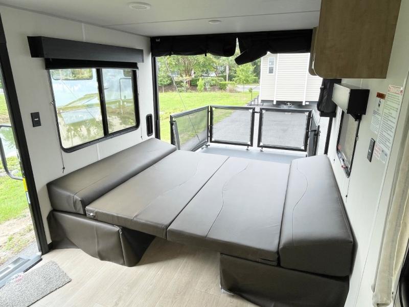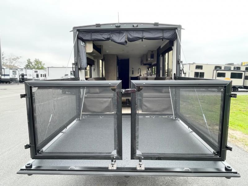 This dual entry toy hauler will allow you to enter in through the main living area or the front master bedroom for convenience! There is a walk-through bath that will be easily accessible for everyone, and there is plenty of storage space for personal belongings. Head to the full kitchen to prepare a home cooked meal, or head outdoors to enjoy the mini kitchen. There is also an outside TV mount if you brought a TV along, and a 15' power awning to provide shade. You can easily unload your toys using the ramp door, then relax on the fold-down sofas with a removable table.