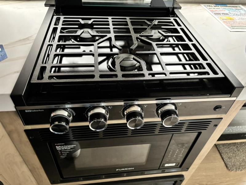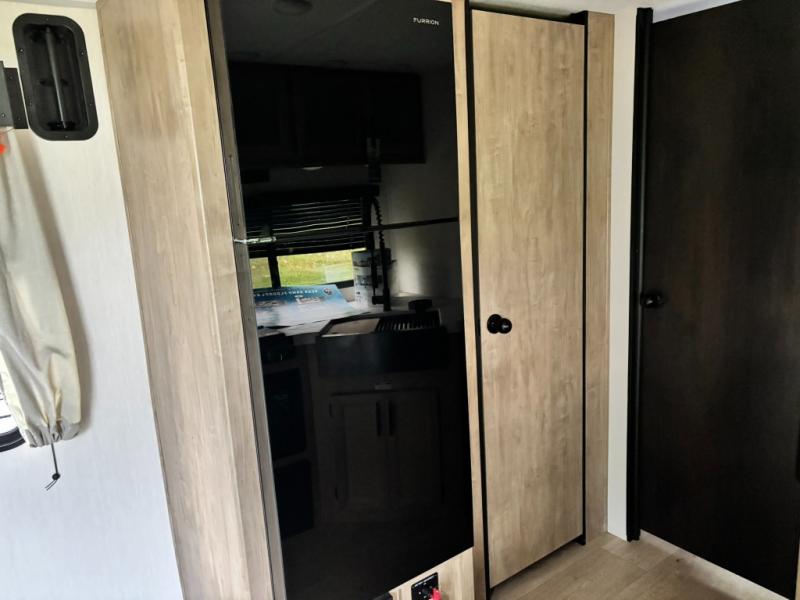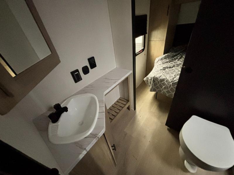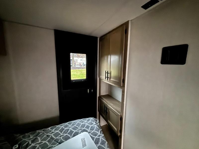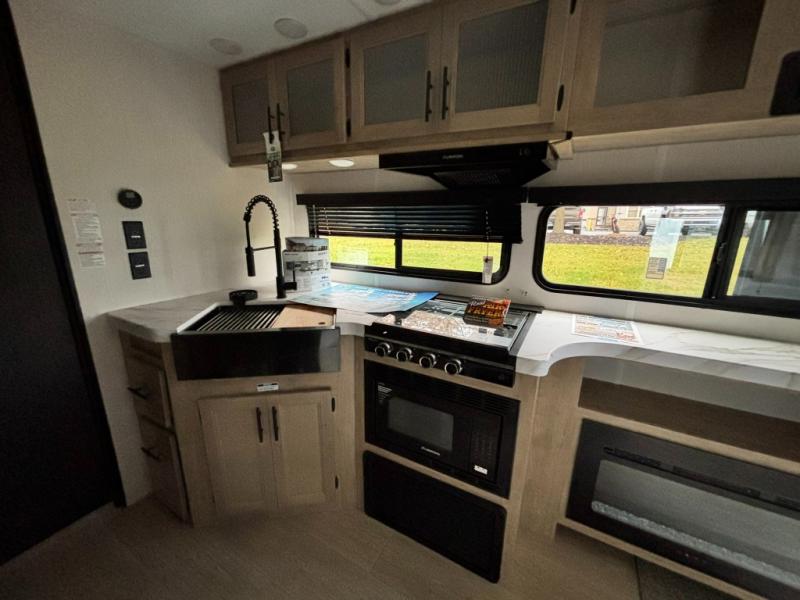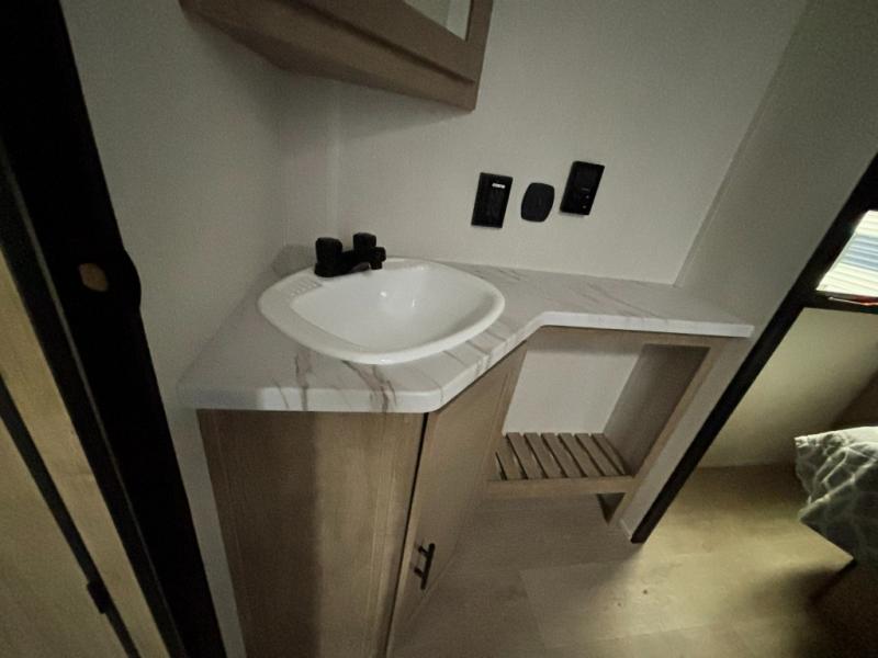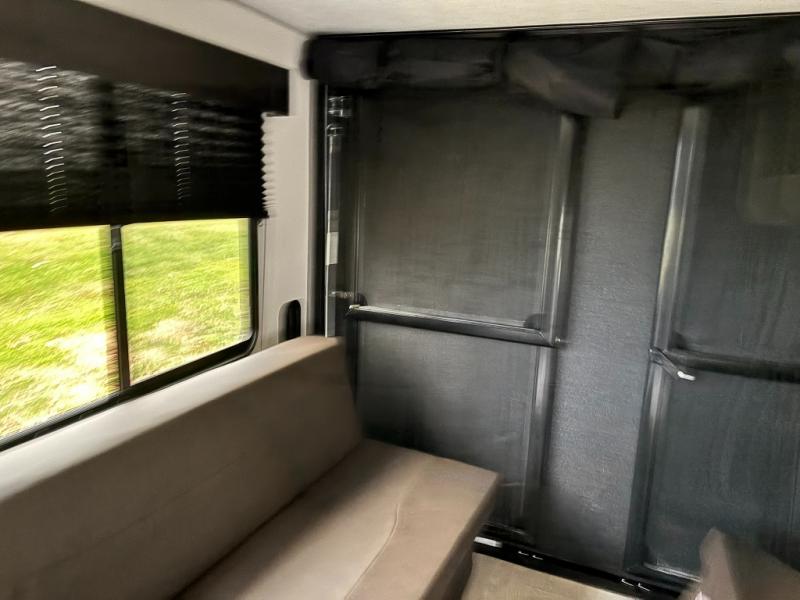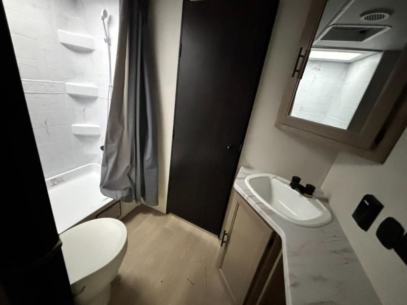 This dual entry toy hauler will allow you to enter in through the main living area or the front master bedroom for convenience! There is a walk-through bath that will be easily accessible for everyone, and there is plenty of storage space for personal belongings. Head to the full kitchen to prepare a home cooked meal, or head outdoors to enjoy the mini kitchen. There is also an outside TV mount if you brought a TV along, and a 15' power awning to provide shade. You can easily unload your toys using the ramp door, then relax on the fold-down sofas with a removable table.