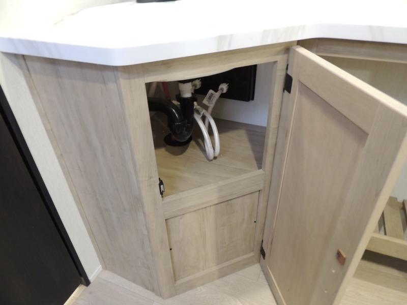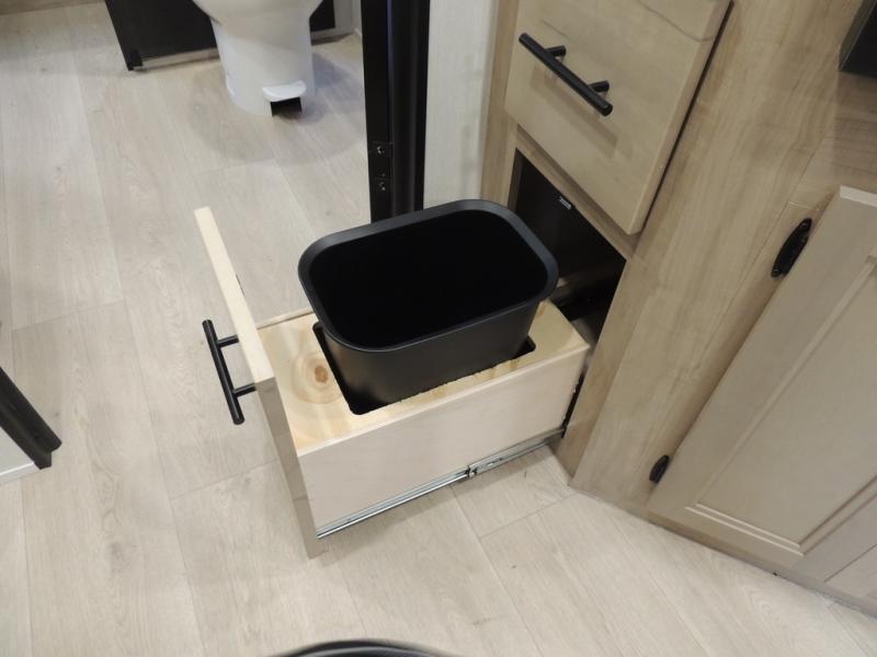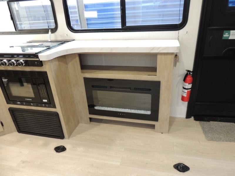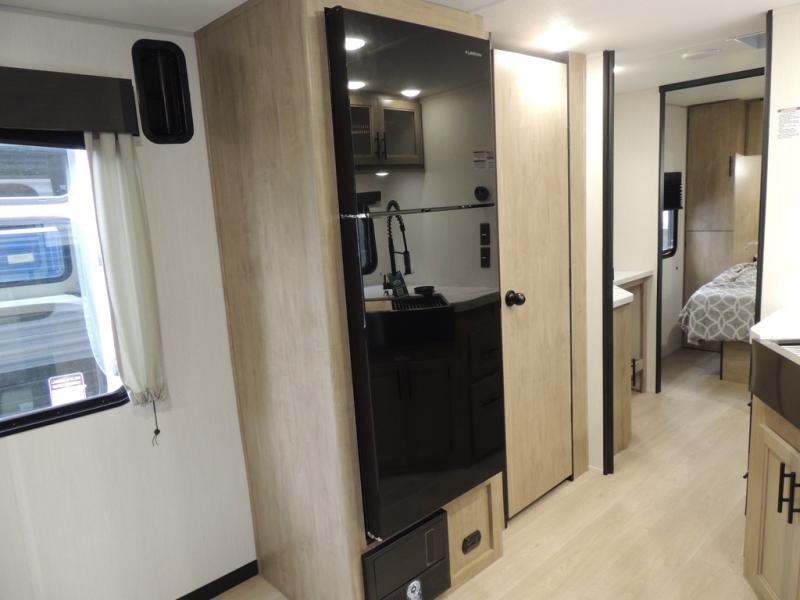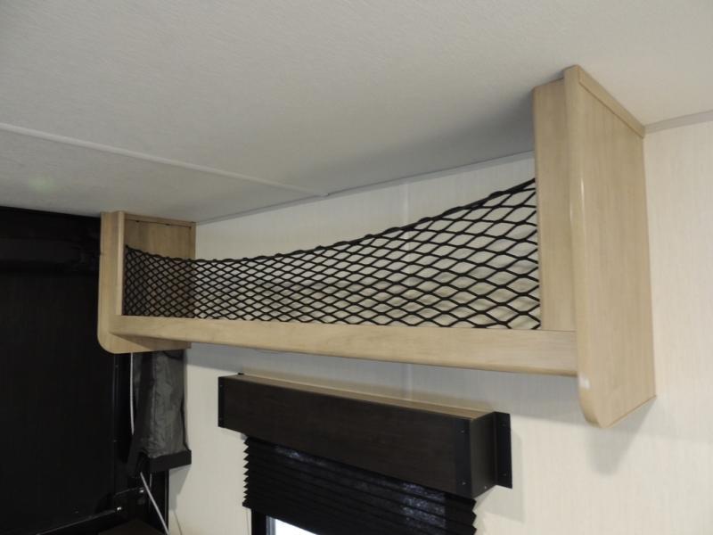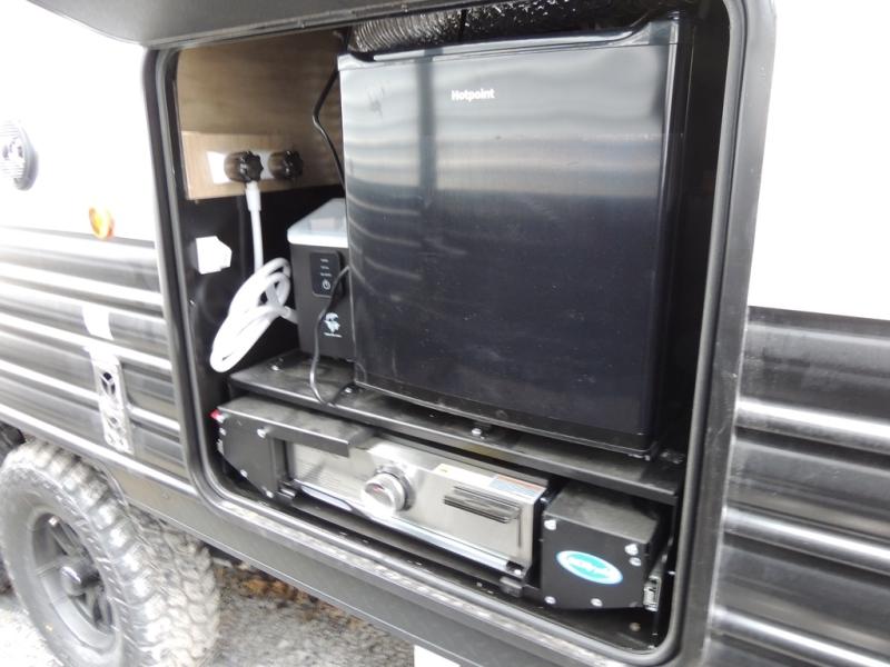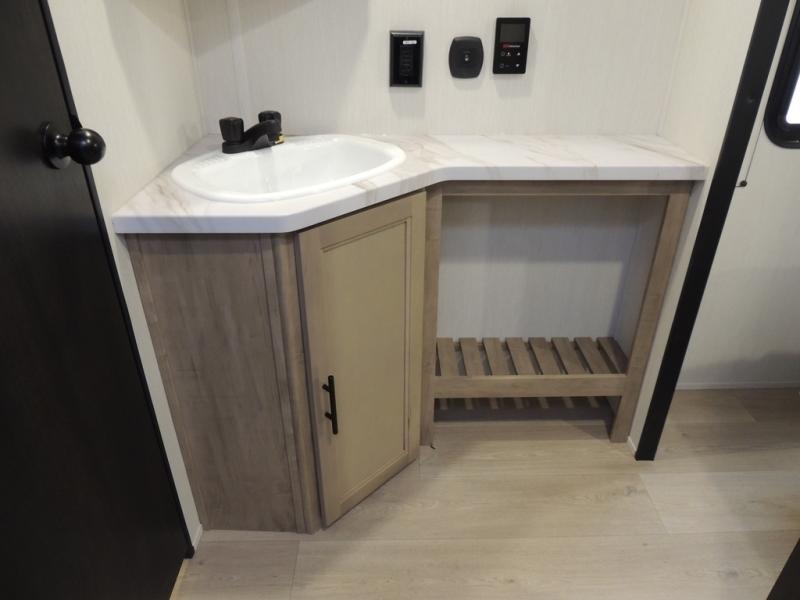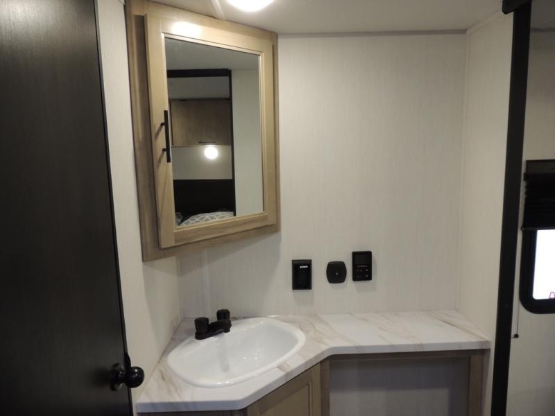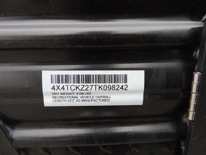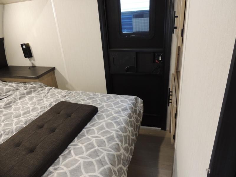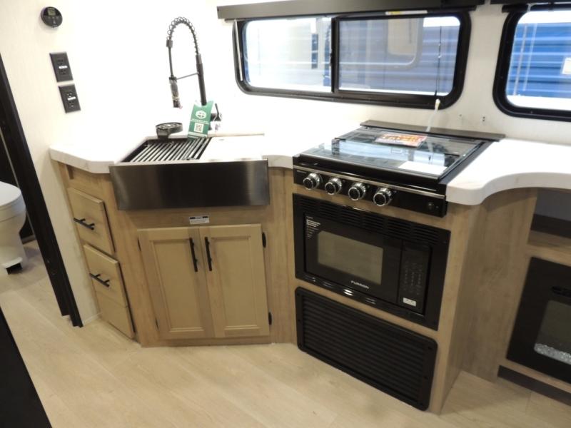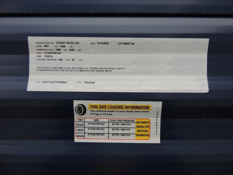 This dual entry toy hauler will allow you to enter in through the main living area or the front master bedroom for convenience! There is a walk-through bath that will be easily accessible for everyone, and there is plenty of storage space for personal belongings. Head to the full kitchen to prepare a home cooked meal, or head outdoors to enjoy the mini kitchen. There is also an outside TV mount if you brought a TV along, and a 15' awning to provide shade. You can easily unload your toys using the ramp door, then relax on the fold-down sofas with a removable table.