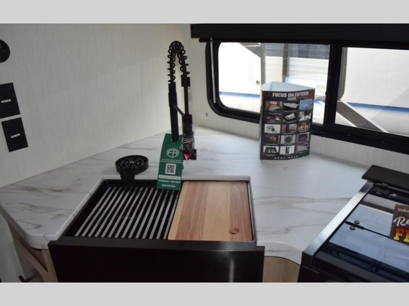 This dual entry toy hauler will allow you to enter in through the main living area or the front master bedroom for convenience! There is a walk-through bath that will be easily accessible for everyone, and there is plenty of storage space for personal belongings. Head to the full kitchen to prepare a home cooked meal, or head outdoors to enjoy the mini kitchen. There is also an outside TV mount if you brought a TV along, and a 15' awning to provide shade. You can easily unload your toys using the ramp door, then relax on the fold-down sofas with a removable table.