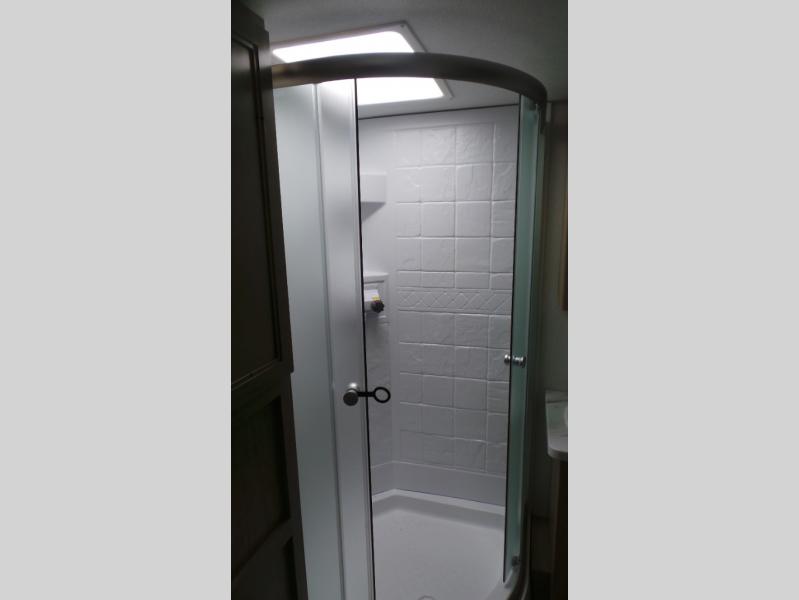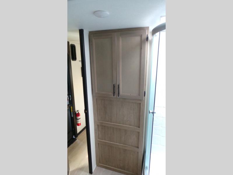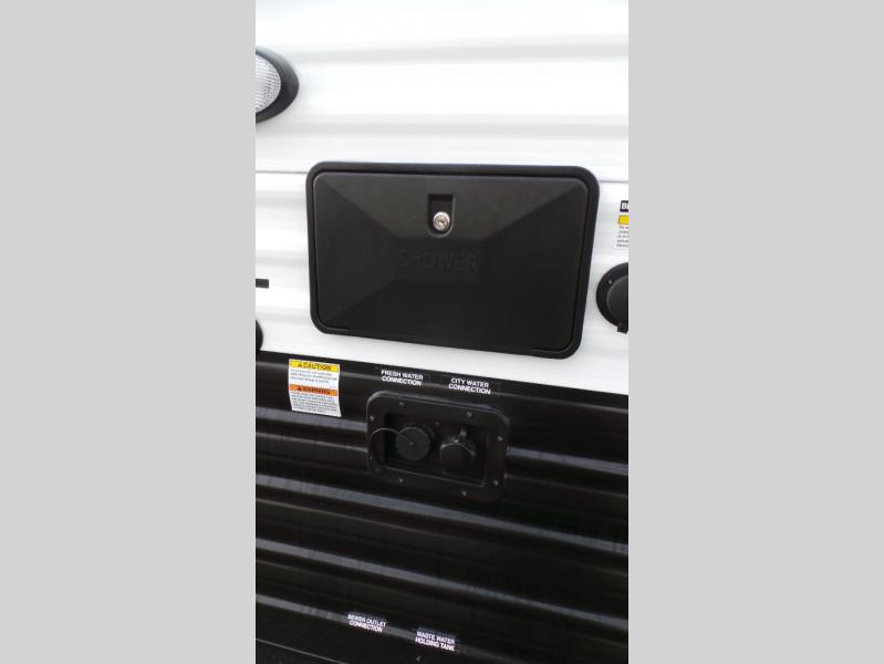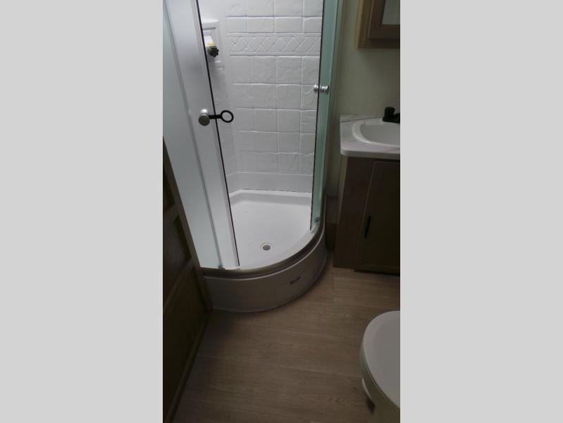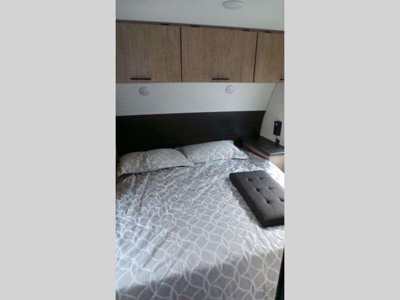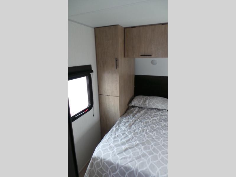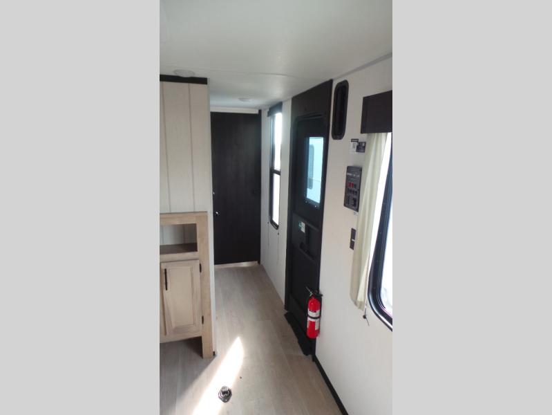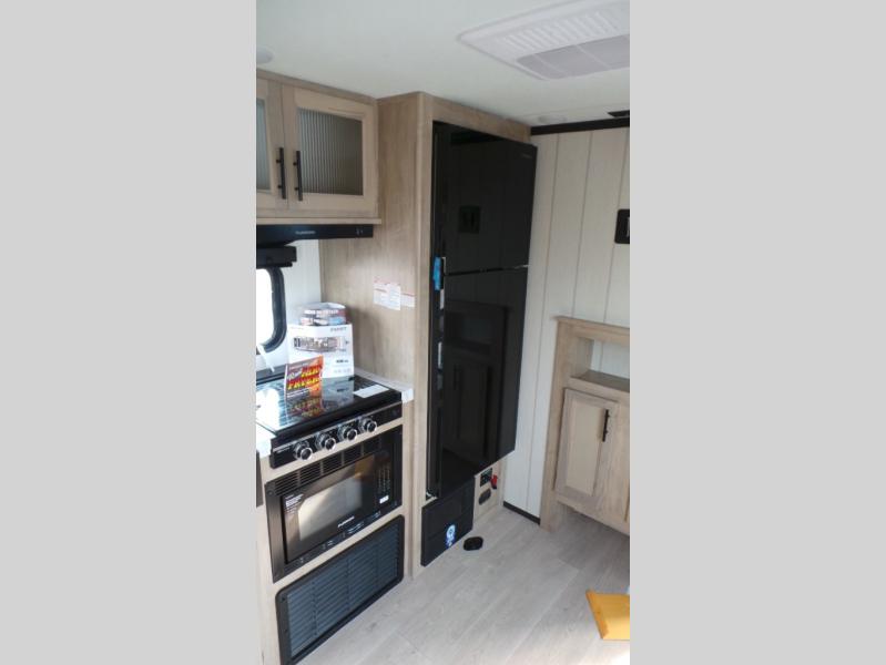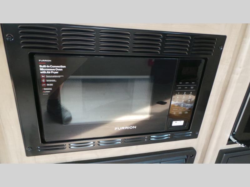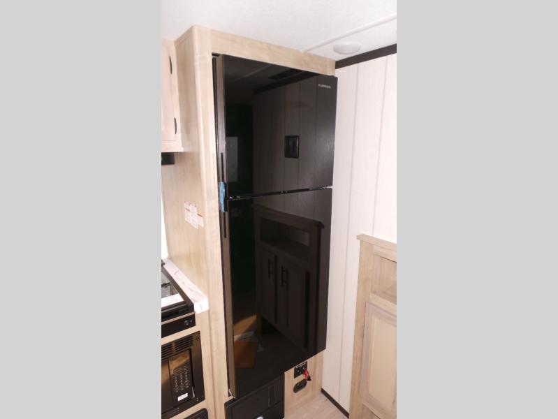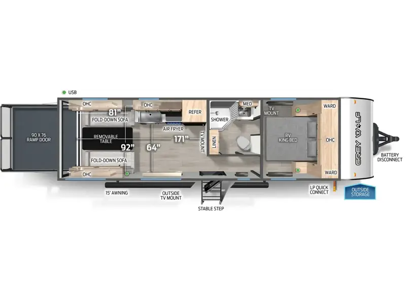The Grey Wolf Toy Hauler by Forest River is the perfect RV for outdoor enthusiasts. The spacious garage can accommodate your toys, while the outdoor kitchen, shower, and patio area provide the ultimate outdoor living experience. Inside, you'll find a luxurious bedroom with a walk-around queen bed and a well-appointed bathroom. The modern kitchen, with its black stainless steel farm sink and sink cover, is perfect for cooking and entertaining.