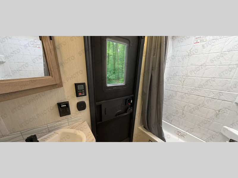 This Cherokee Grey Wolf travel trailer has some of the best accommodations for your group! First of all, it provides you with two entry doors so that everyone can come and go as they please. And before you even reach the interior, you will find that this trailer has an outdoor kitchen all ready for your summertime picnics. Once you do finally make your way to the interior, you'll find that the fireplace creates a beautiful living space next to the sofa and U-shaped dinette. You will also appreciate having a large pantry so that you can stock up on the food your family loves. The double-size bunks have a ladder for easy climbing, and the private bedroom has an RV king bed for easy relaxing.