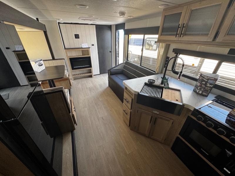 This Cherokee Grey Wolf travel trailer has some of the best accommodations for your group! First of all, it provides you with two entry doors so that everyone can come and go as they please. And before you even reach the interior, you will find that this trailer has an outdoor kitchen all ready for your summertime picnics. Once you do finally make your way to the interior, you'll find that the fireplace creates a beautiful living space next to the sofa and U-shaped dinette. You will also appreciate having a large pantry so that you can stock up on the food your family loves. The double-size bunks have a ladder for easy climbing, and the private bedroom has an RV king bed for easy relaxing.