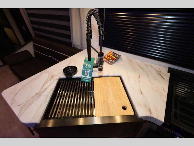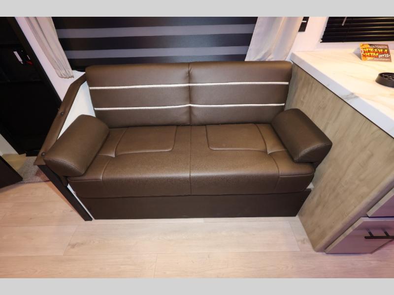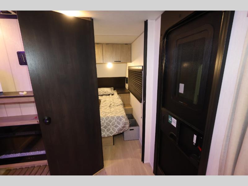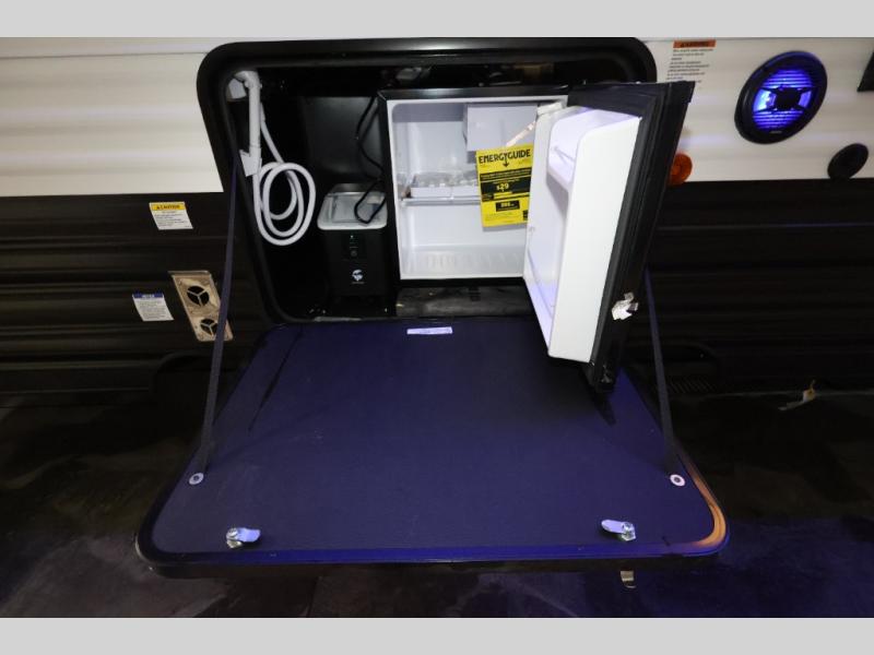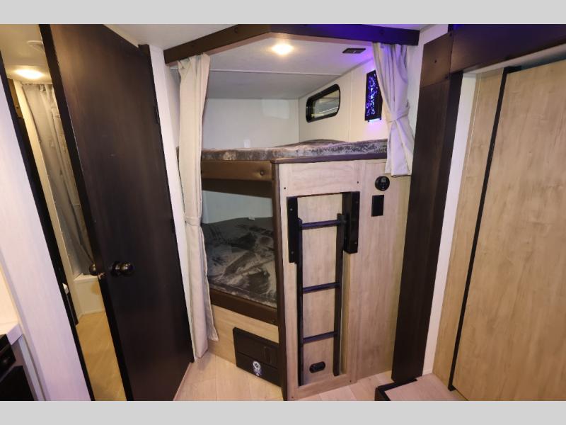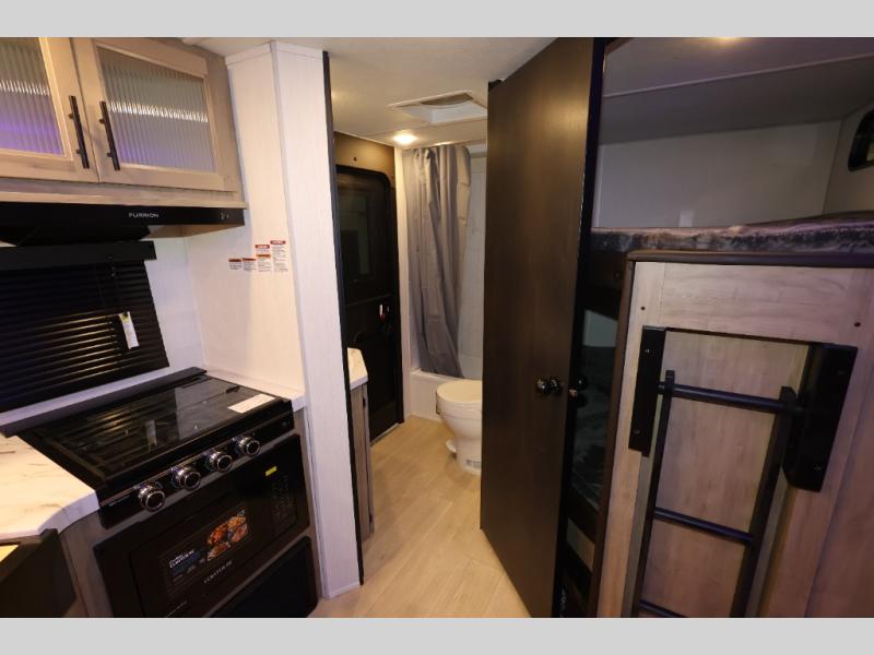 This Cherokee Grey Wolf travel trailer has some of the best accommodations for your group! First of all, it provides you with two entry doors so that everyone can come and go as they please. And before you even reach the interior, you will find that this trailer has an outdoor kitchen all ready for your summertime picnics. Once you do finally make your way to the interior, you'll find that the fireplace creates a beautiful living space next to the sofa and U-shaped dinette. You will also appreciate having a large pantry so that you can stock up on the food your family loves. The double-size bunks have a ladder for easy climbing, and the private bedroom has an RV king bed for easy relaxing.