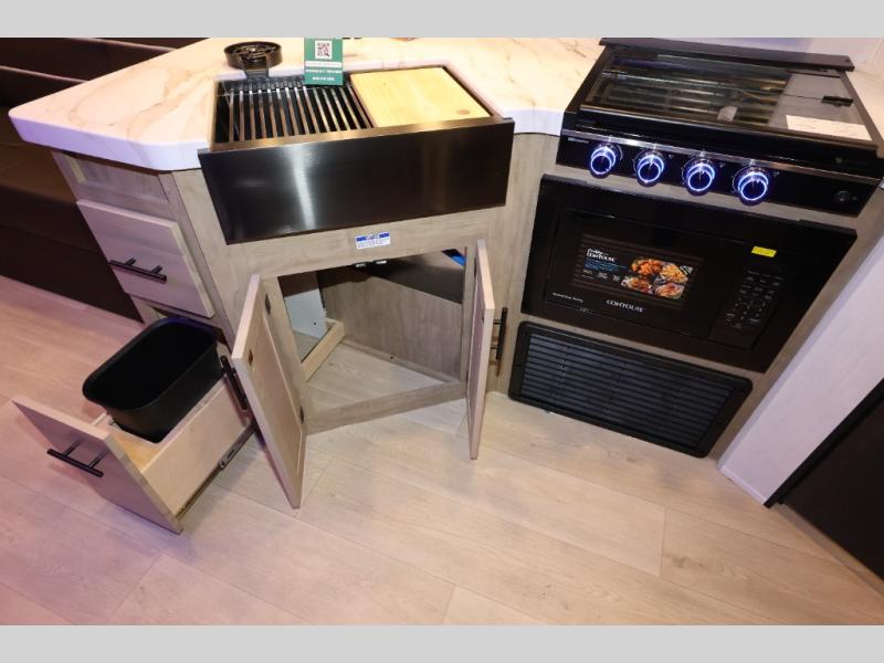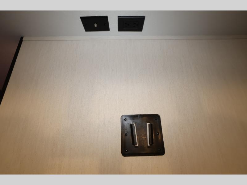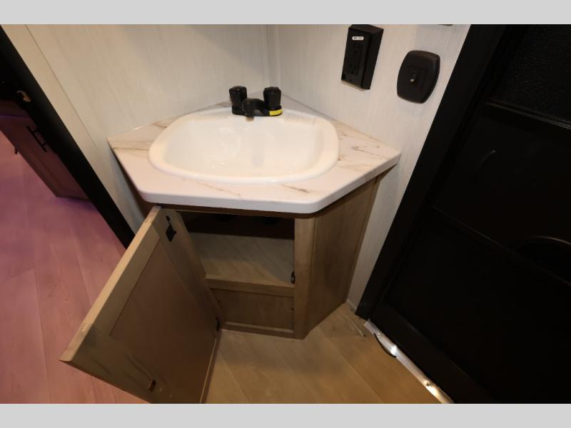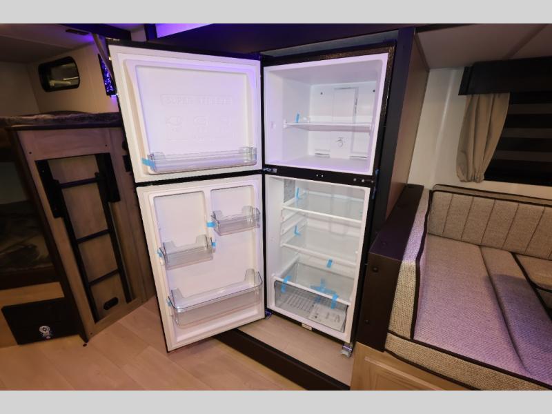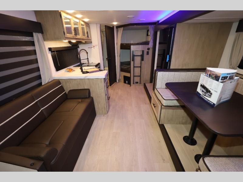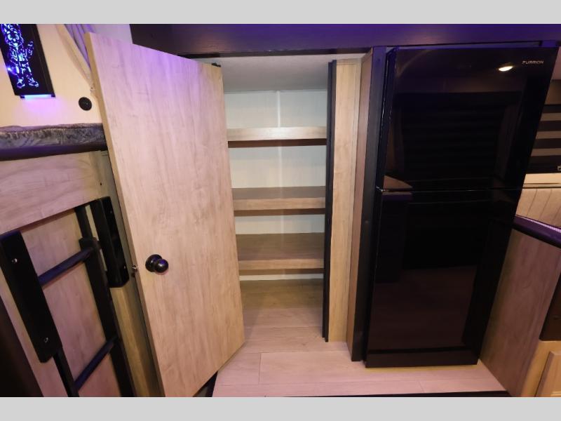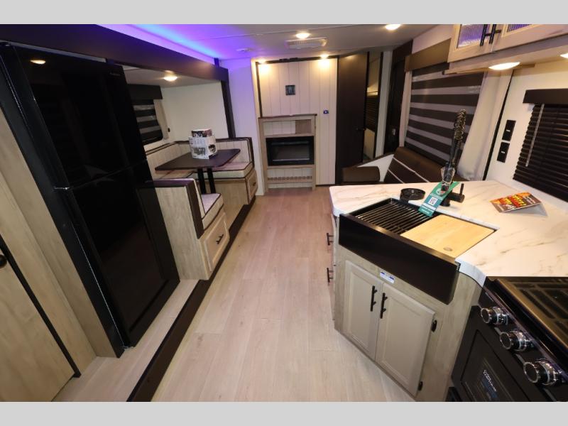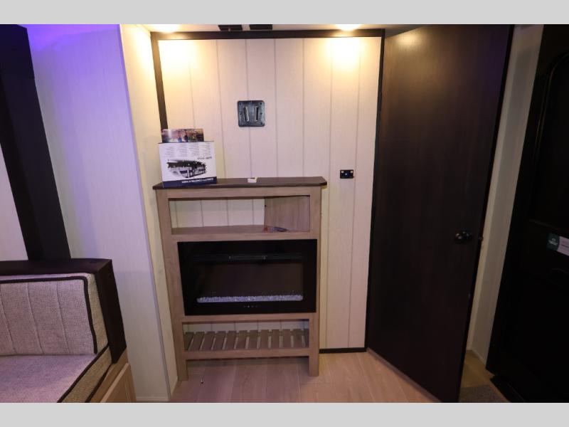 This Cherokee Grey Wolf travel trailer has some of the best accommodations for your group! First of all, it provides you with two entry doors so that everyone can come and go as they please. And before you even reach the interior, you will find that this trailer has an outdoor kitchen all ready for your summertime picnics. Once you do finally make your way to the interior, you'll find that the fireplace creates a beautiful living space next to the sofa and U-shaped dinette. You will also appreciate having a large pantry so that you can stock up on the food your family loves. The double-size bunks have a ladder for easy climbing, and the private bedroom has an RV king bed for easy relaxing.