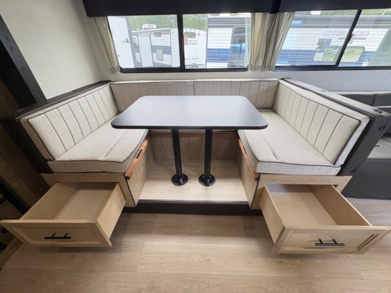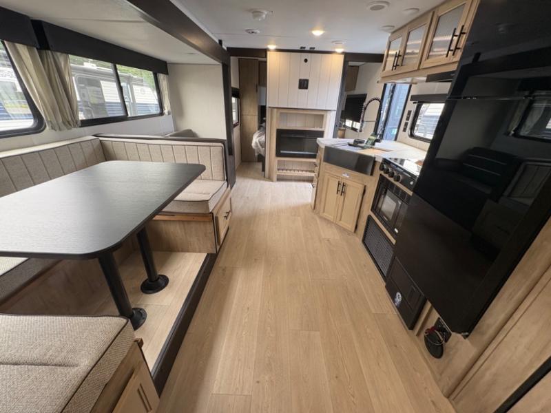 Come on inside this Cherokee Grey Wolf travel trailer and experience the convenience of a smooth flow of traffic in and out with two entry doors. The rear door leads into a full bath which is great for accessibility. Once inside, you will notice the large U-shaped dinette and the sofa which sit on the slide and create a spacious footprint for moving about, as well as great places to play games and socialize with your friends and family. A walk-in pantry provides plenty of storage allowing you to stock up on your favorite snacks and dry goods for your family adventure. At night, there is sleeping space for everyone between the double-size bunks and the RV king bed, plus the furniture.