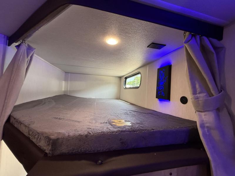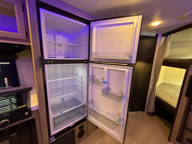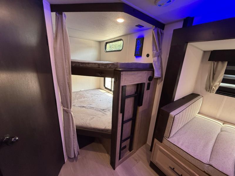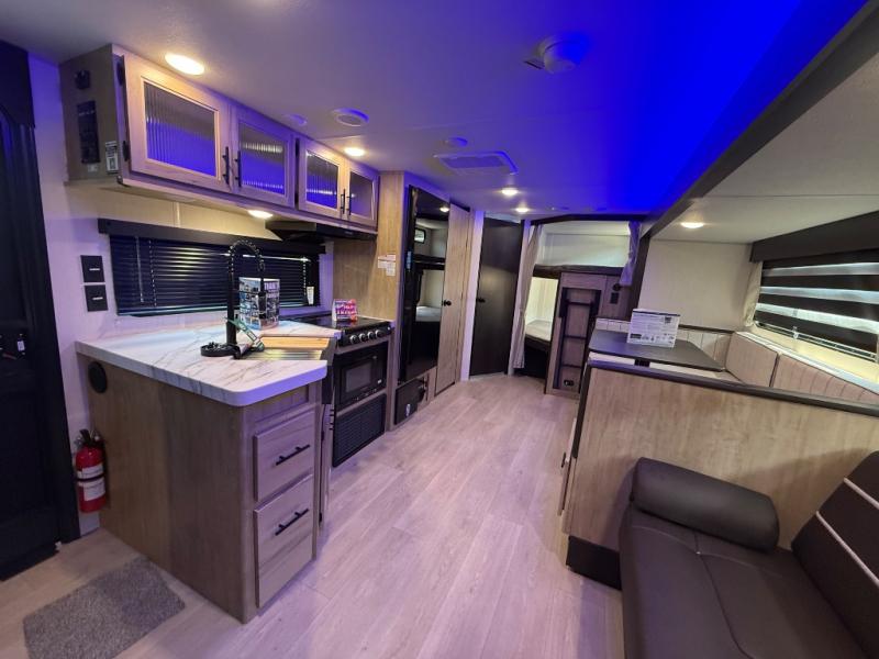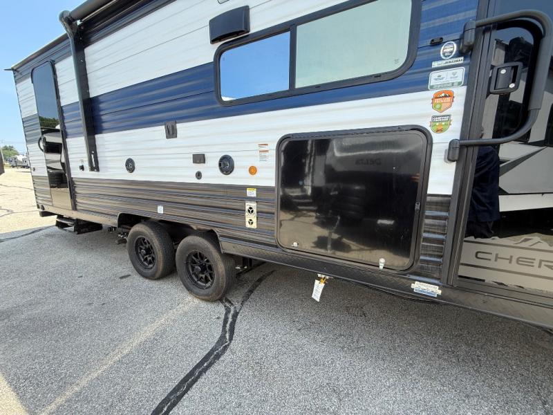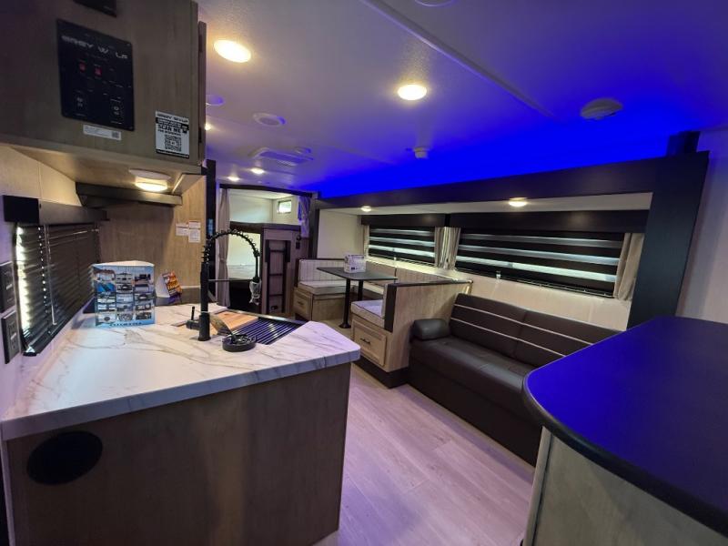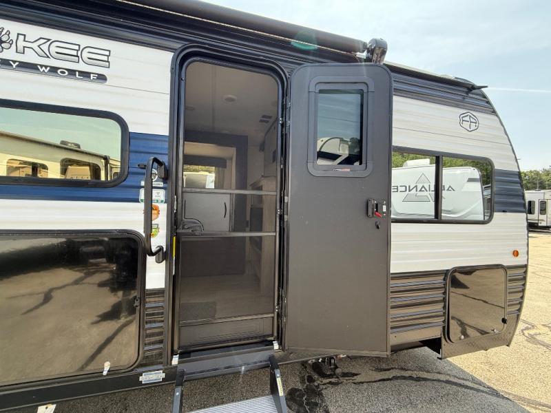 Come on inside this Cherokee Grey Wolf travel trailer and experience the convenience of a smooth flow of traffic in and out with two entry doors. The rear door leads into a full bath which is great for accessibility. Once inside, you will notice the large U-shaped dinette and the sofa which sit on the slide and create a spacious footprint for moving about, as well as great places to play games and socialize with your friends and family. A walk-in pantry provides plenty of storage allowing you to stock up on your favorite snacks and dry goods for your family adventure. At night, there is sleeping space for everyone between the double-size bunks and the RV king bed, plus the furniture.