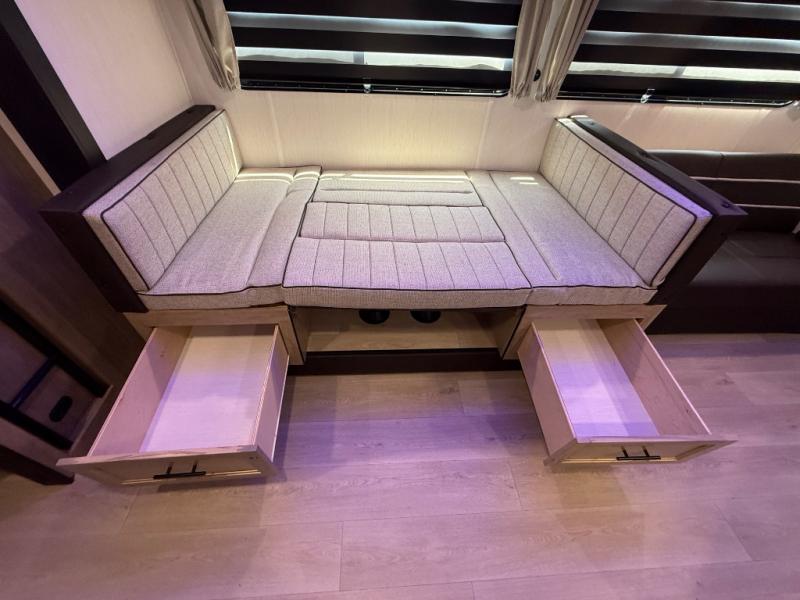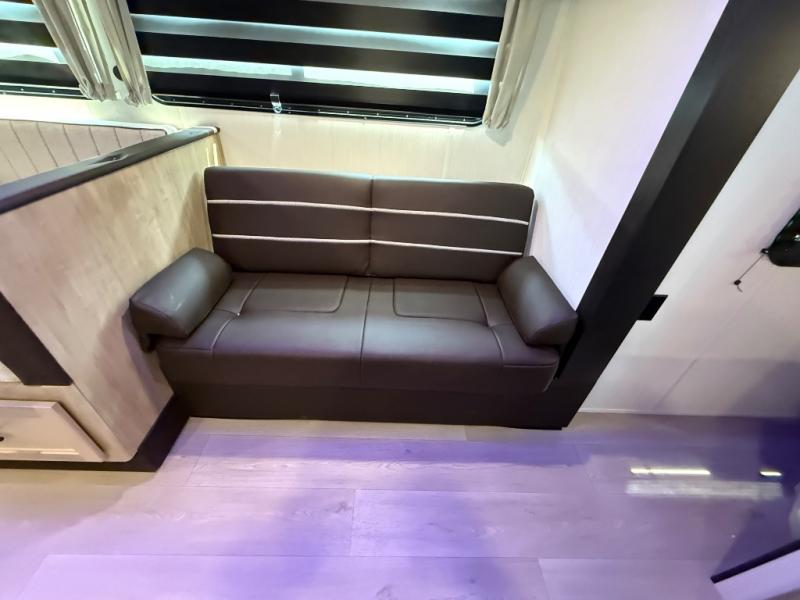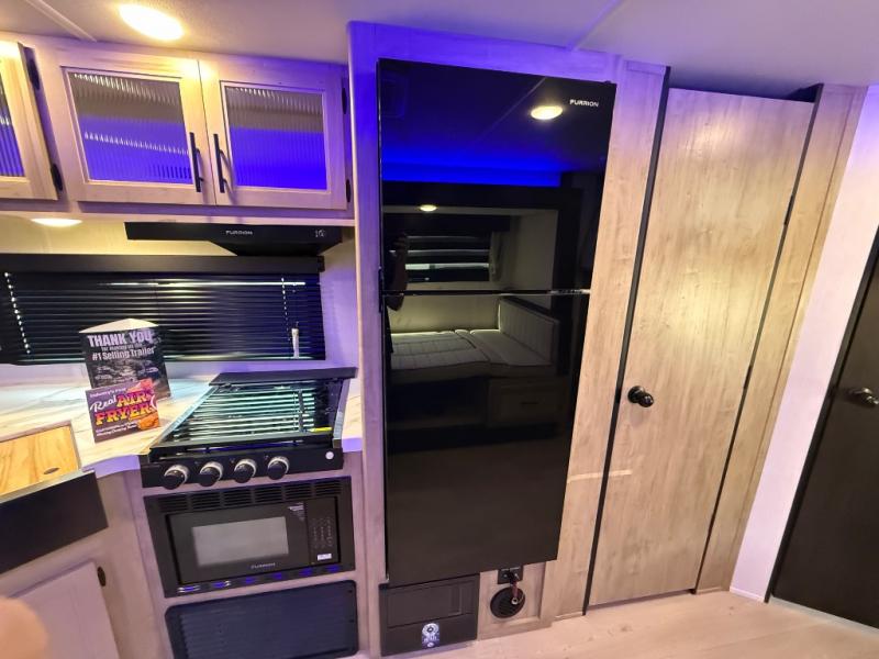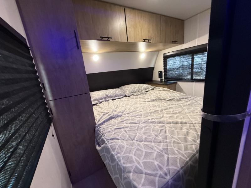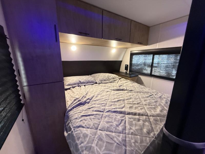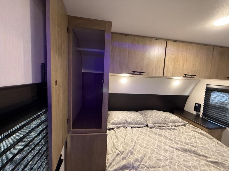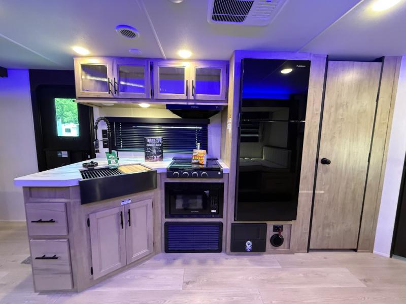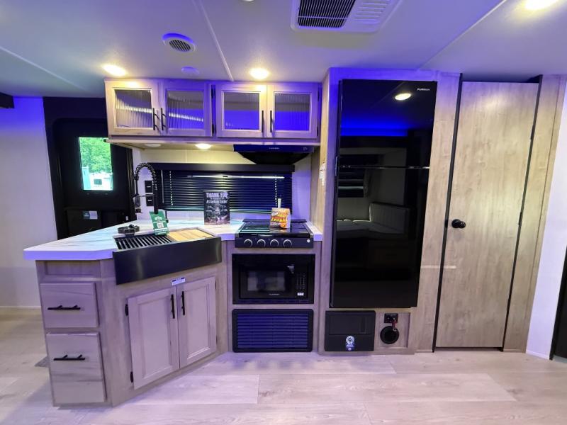 Come on inside this Cherokee Grey Wolf travel trailer and experience the convenience of a smooth flow of traffic in and out with two entry doors. The rear door leads into a full bath which is great for accessibility. Once inside, you will notice the large U-shaped dinette and the sofa which sit on the slide and create a spacious footprint for moving about, as well as great places to play games and socialize with your friends and family. A walk-in pantry provides plenty of storage allowing you to stock up on your favorite snacks and dry goods for your family adventure. At night, there is sleeping space for everyone between the double-size bunks and the RV king bed, plus the furniture.