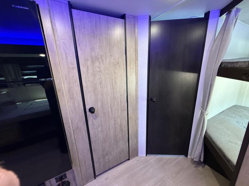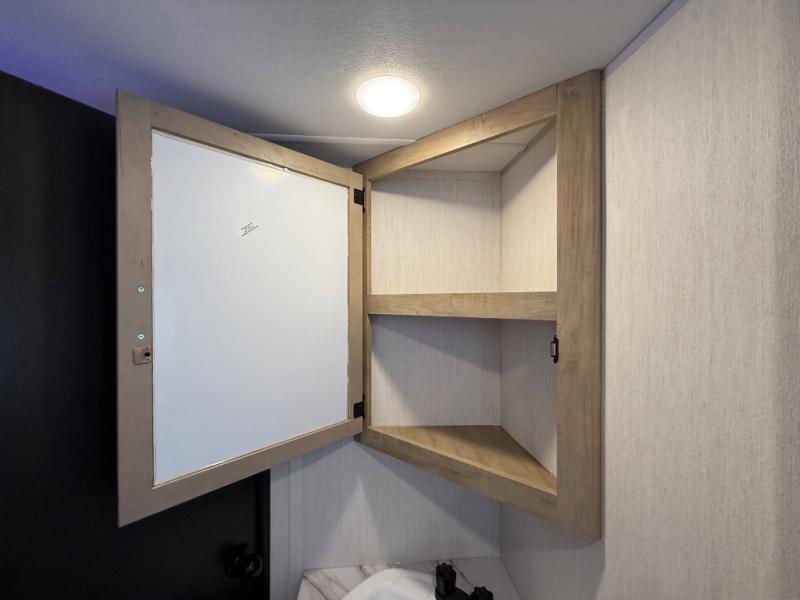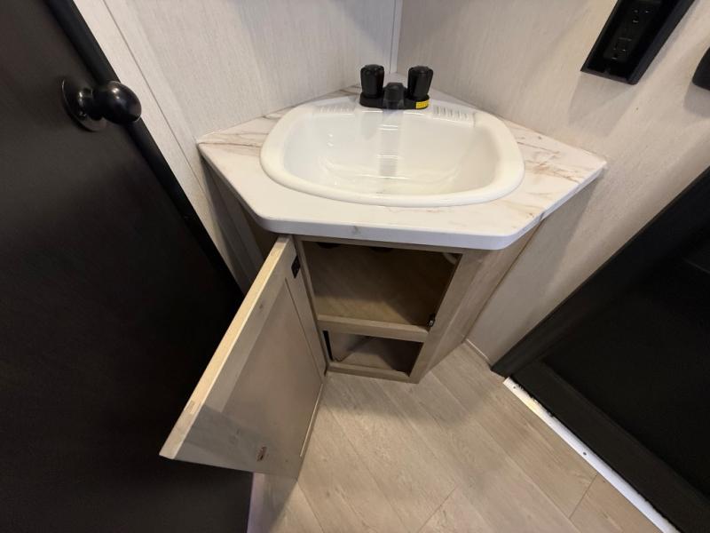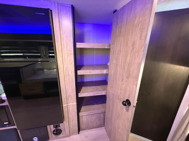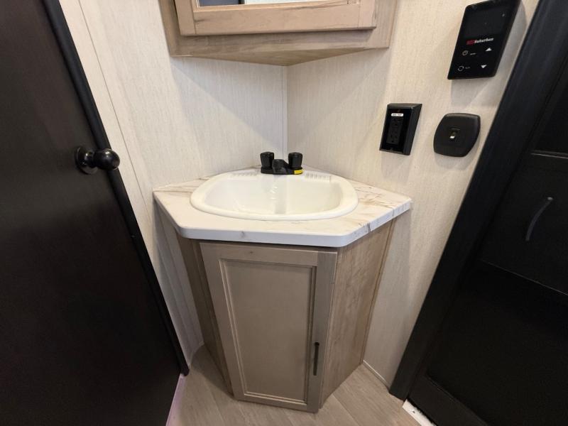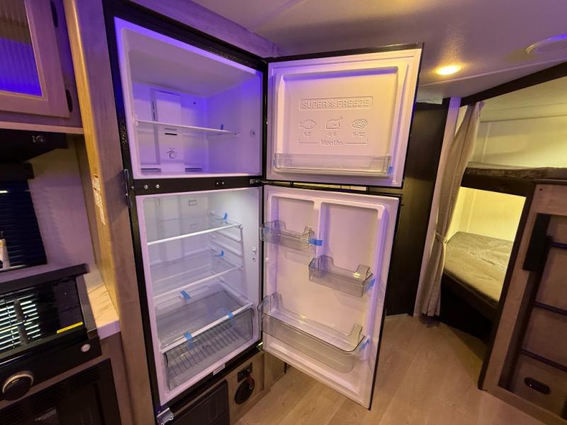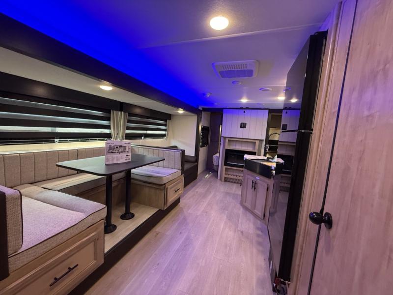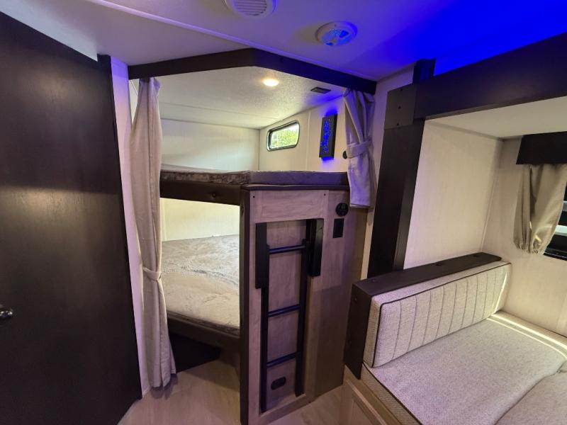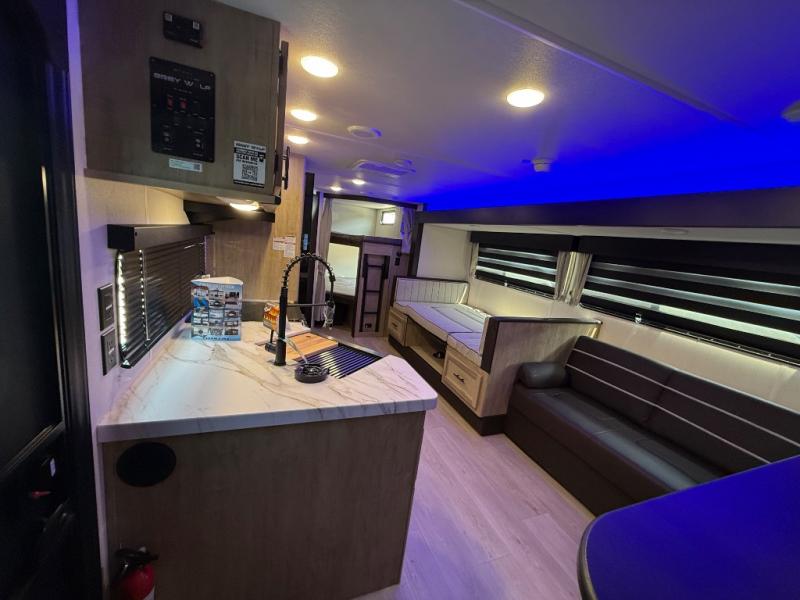 Come on inside this Cherokee Grey Wolf travel trailer and experience the convenience of a smooth flow of traffic in and out with two entry doors. The rear door leads into a full bath which is great for accessibility. Once inside, you will notice the large U-shaped dinette and the sofa which sit on the slide and create a spacious footprint for moving about, as well as great places to play games and socialize with your friends and family. A walk-in pantry provides plenty of storage allowing you to stock up on your favorite snacks and dry goods for your family adventure. At night, there is sleeping space for everyone between the double-size bunks and the RV king bed, plus the furniture.