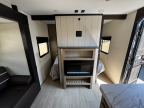 Come on inside this Cherokee Grey Wolf travel trailer and experience the convenience of a smooth flow of traffic in and out with two entry doors. The rear door leads into a full bath which is great for accessibility. Once inside, you will notice the large U-shaped dinette and the sofa which sit on the slide and create a spacious footprint for moving about, as well as great places to play games and socialize with your friends and family. A walk-in pantry provides plenty of storage allowing you to stock up on your favorite snacks and dry goods for your family adventure. At night, there is sleeping space for everyone between the double-size bunks and the RV king bed, plus the furniture.