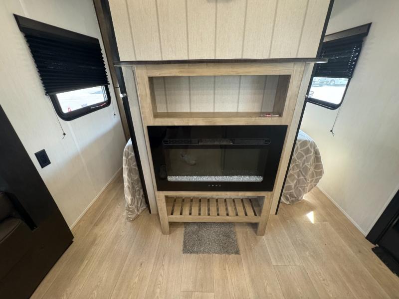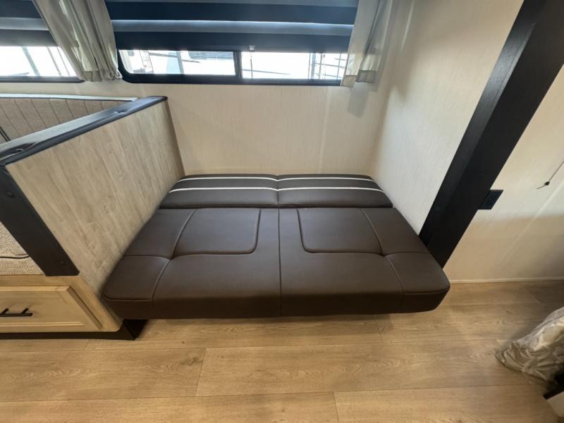 Come on inside this Cherokee Grey Wolf travel trailer and experience the convenience of a smooth flow of traffic in and out with two entry doors. The rear door leads into a full bath which is great for accessibility. Once inside, you will notice the large U-shaped dinette and the sofa which sit on the slide and create a spacious footprint for moving about, as well as great places to play games and socialize with your friends and family. A walk-in pantry provides plenty of storage allowing you to stock up on your favorite snacks and dry goods for your family adventure. At night, there is sleeping space for everyone between the double-size bunks and the RV king bed, plus the furniture.