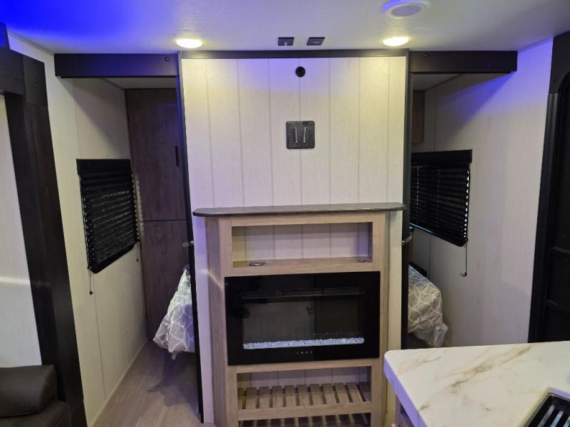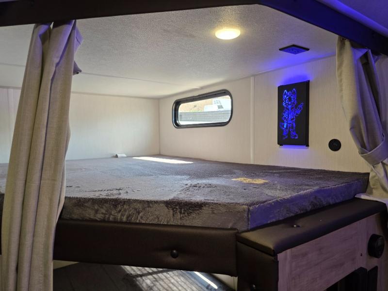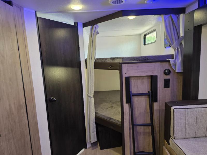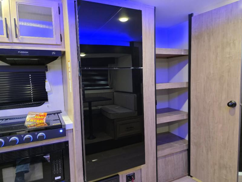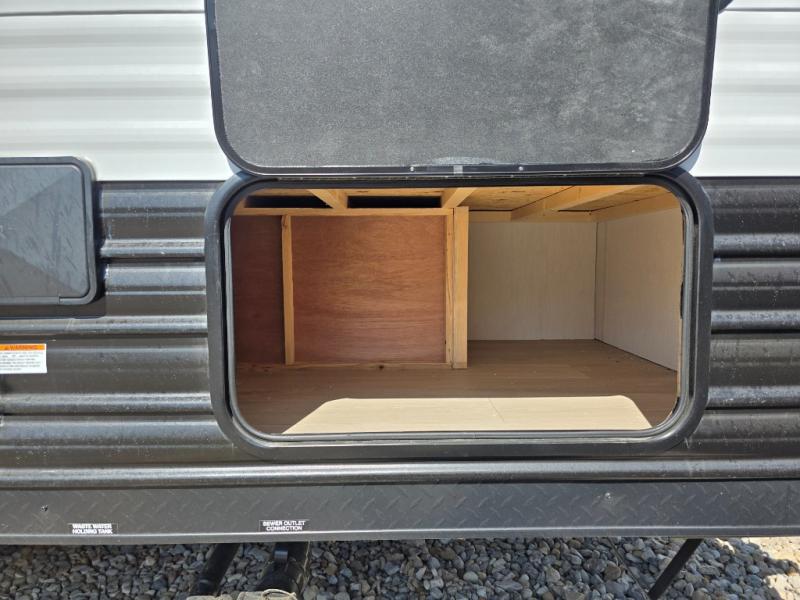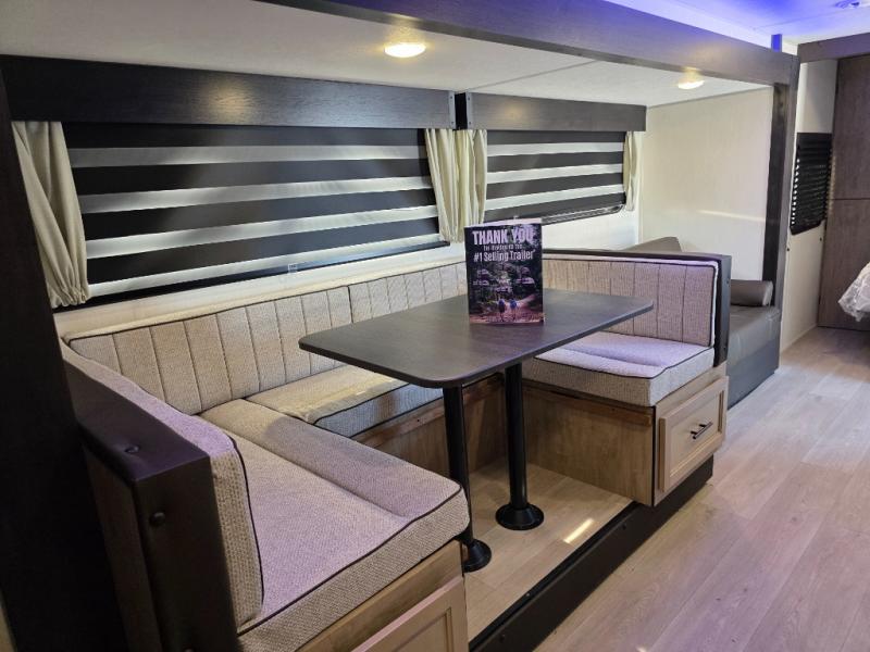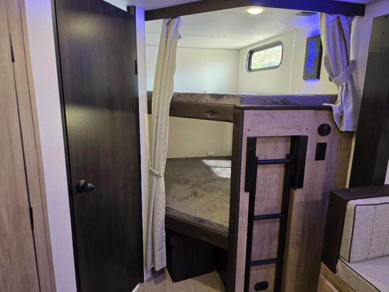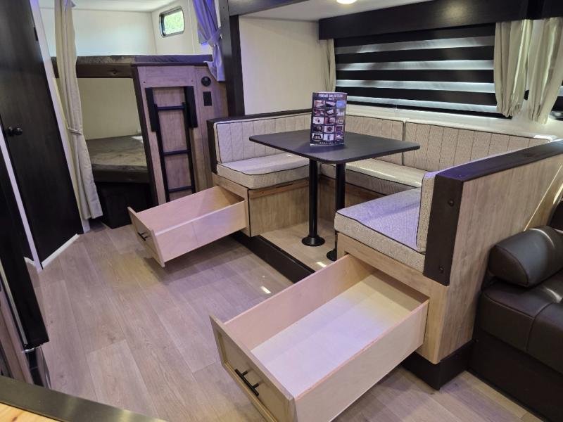 Come on inside this Cherokee Grey Wolf travel trailer and experience the convenience of a smooth flow of traffic in and out with two entry doors. The rear door leads into a full bath which is great for accessibility. Once inside, you will notice the large U-shaped dinette and the sofa which sit on the slide and create a spacious footprint for moving about, as well as great places to play games and socialize with your friends and family. A walk-in pantry provides plenty of storage allowing you to stock up on your favorite snacks and dry goods for your family adventure. At night, there is sleeping space for everyone between the double-size bunks and the RV king bed, plus the furniture.