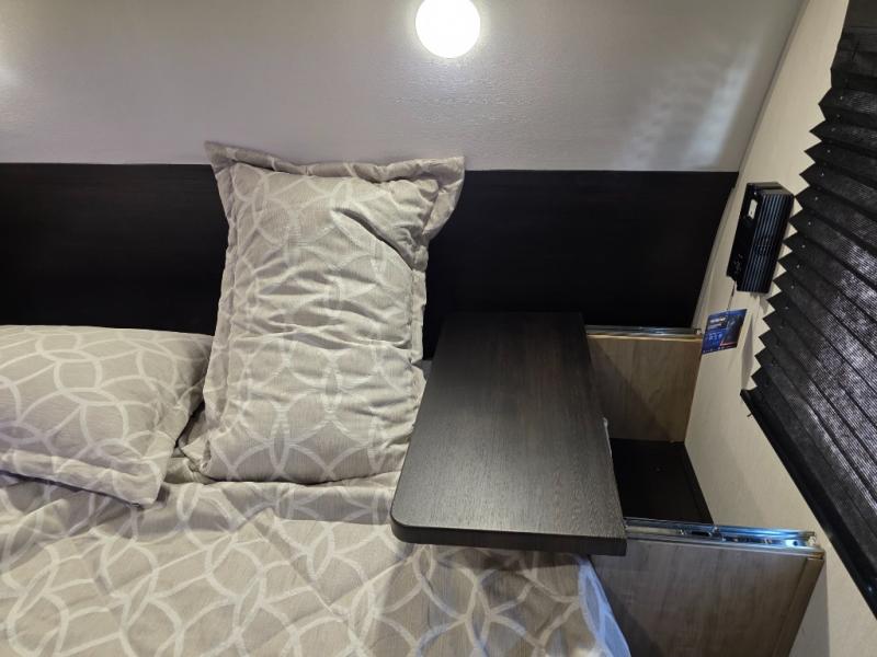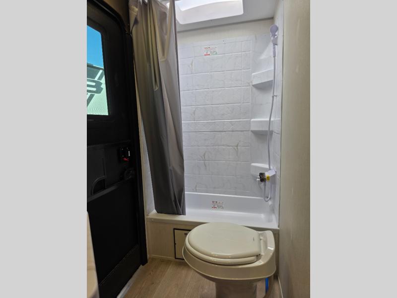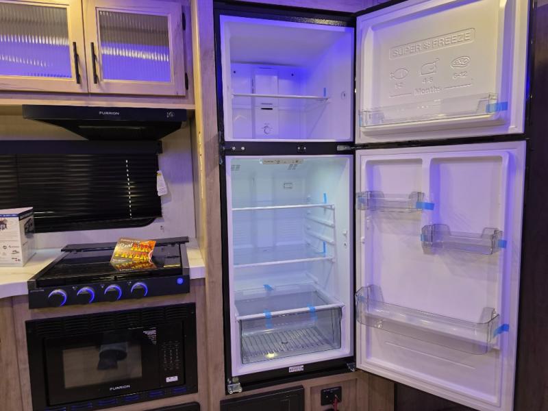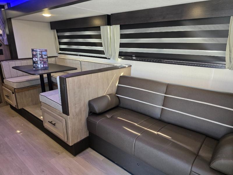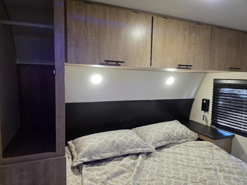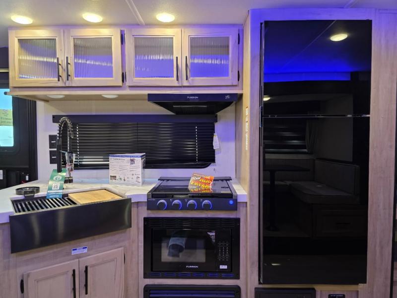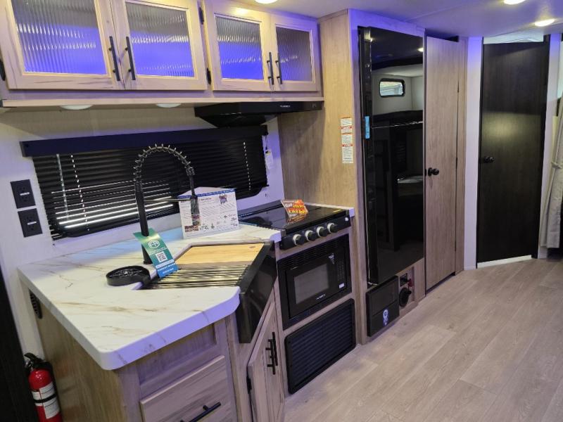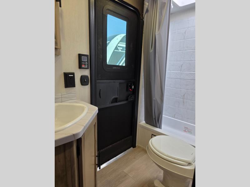 Come on inside this Cherokee Grey Wolf travel trailer and experience the convenience of a smooth flow of traffic in and out with two entry doors. The rear door leads into a full bath which is great for accessibility. Once inside, you will notice the large U-shaped dinette and the sofa which sit on the slide and create a spacious footprint for moving about, as well as great places to play games and socialize with your friends and family. A walk-in pantry provides plenty of storage allowing you to stock up on your favorite snacks and dry goods for your family adventure. At night, there is sleeping space for everyone between the double-size bunks and the RV king bed, plus the furniture.