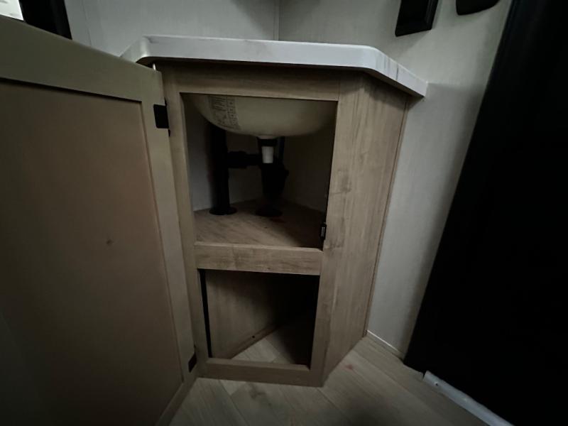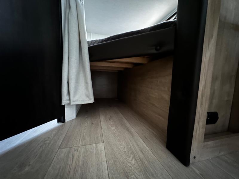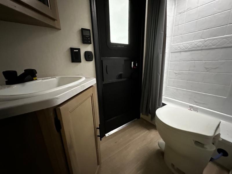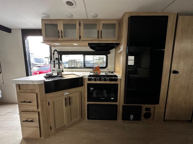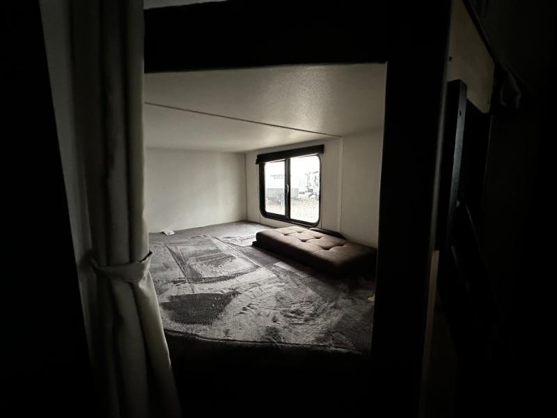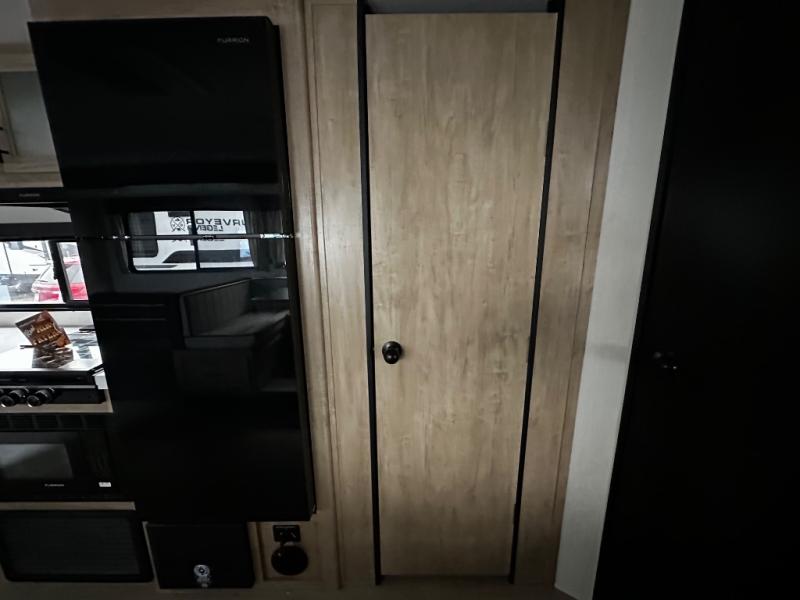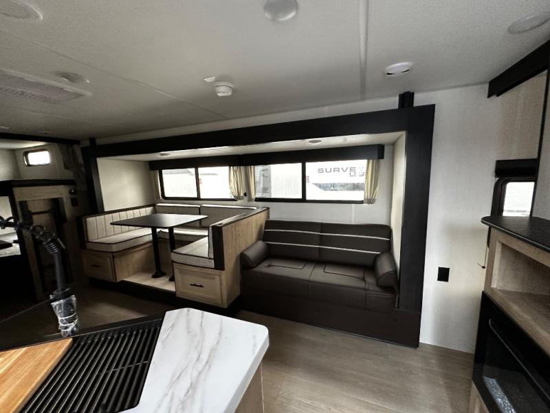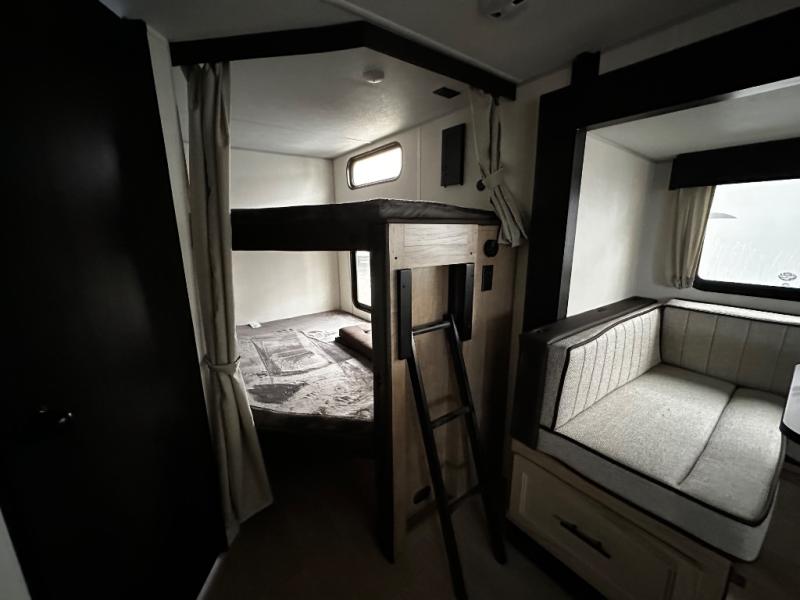 Come on inside this Cherokee Grey Wolf travel trailer and experience the convenience of a smooth flow of traffic in and out with two entry doors. The rear door leads into a full bath which is great for accessibility. Once inside, you will notice the large U-shaped dinette and the sofa which sit on the slide and create a spacious footprint for moving about, as well as great places to play games and socialize with your friends and family. A walk-in pantry provides plenty of storage allowing you to stock up on your favorite snacks and dry goods for your family adventure. At night, there is sleeping space for everyone between the double-size bunks and the RV king bed, plus the furniture.