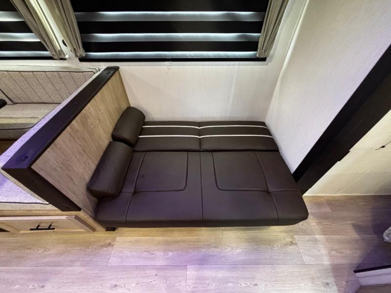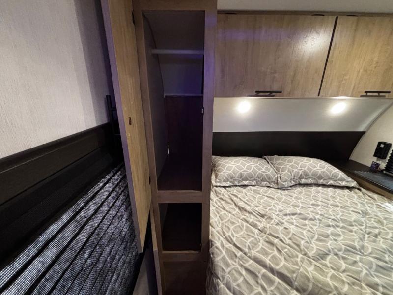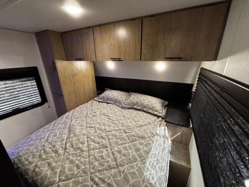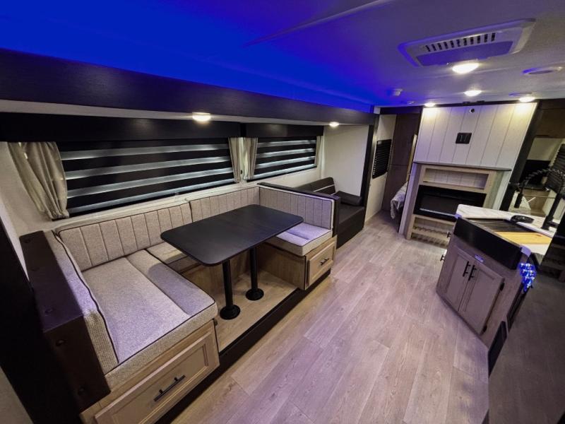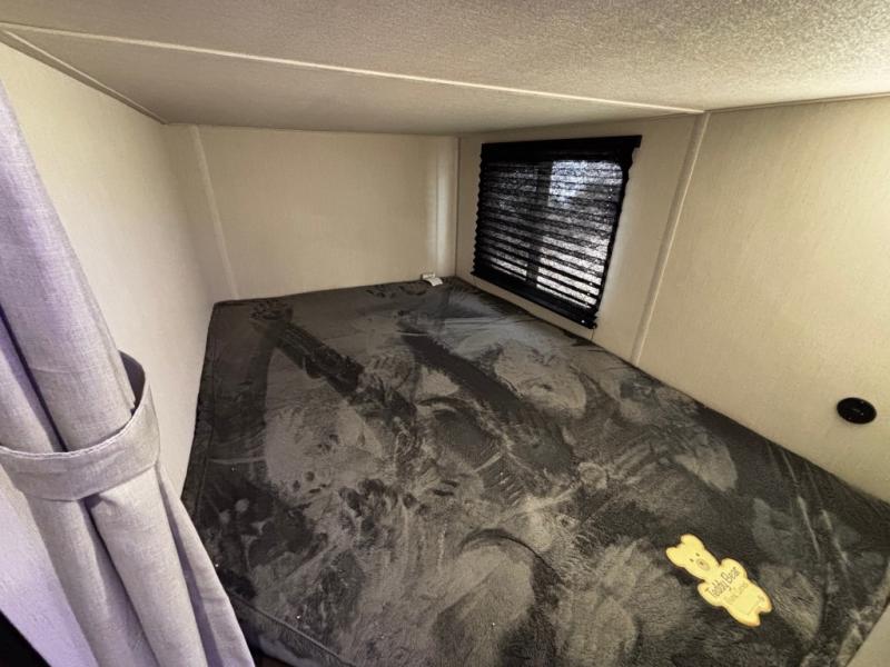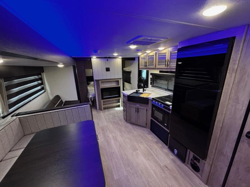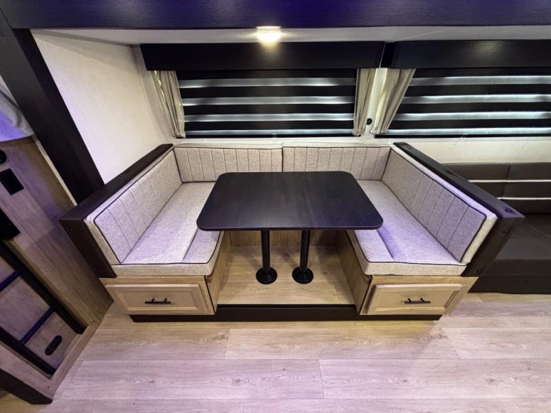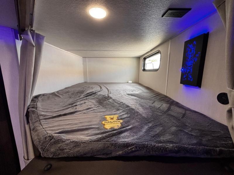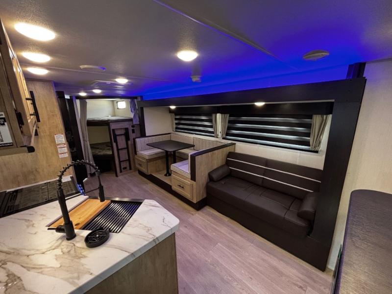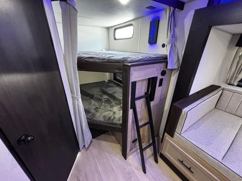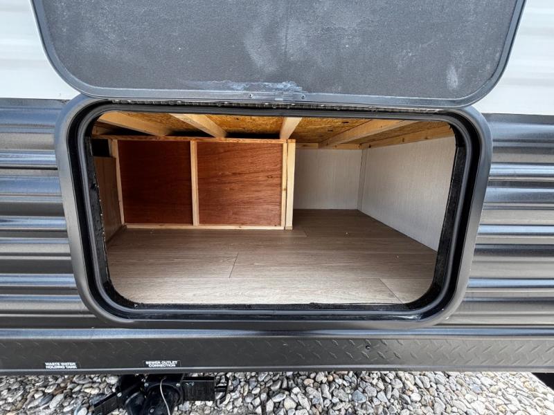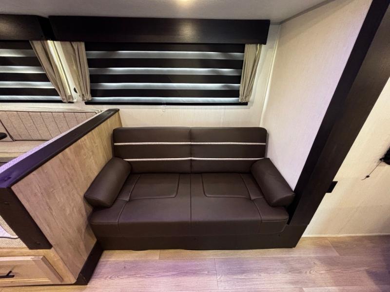 Come on inside this Cherokee Grey Wolf travel trailer and experience the convenience of a smooth flow of traffic in and out with two entry doors. The rear door leads into a full bath which is great for accessibility. Once inside, you will notice the large U-shaped dinette and the sofa which sit on the slide and create a spacious footprint for moving about, as well as great places to play games and socialize with your friends and family. A walk-in pantry provides plenty of storage allowing you to stock up on your favorite snacks and dry goods for your family adventure. At night, there is sleeping space for everyone between the double-size bunks and the RV king bed, plus the furniture.