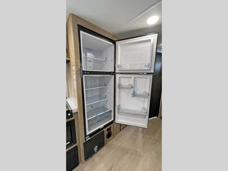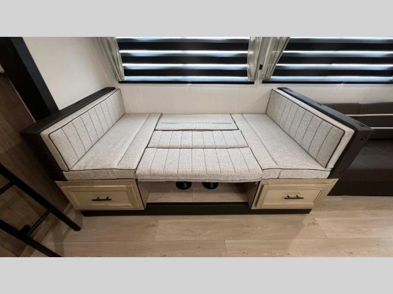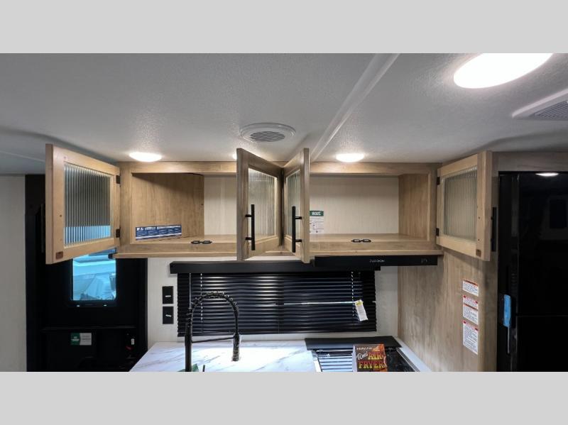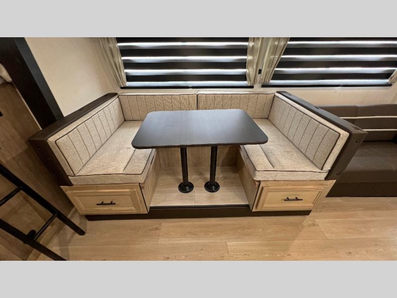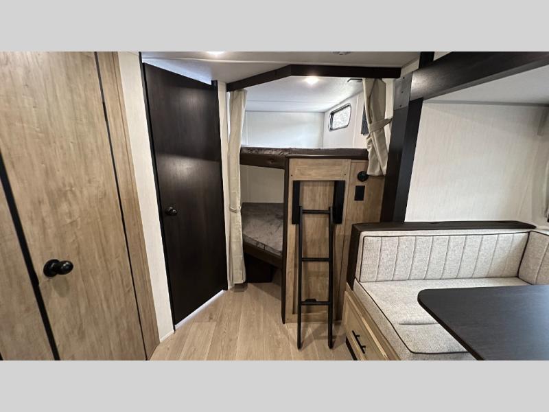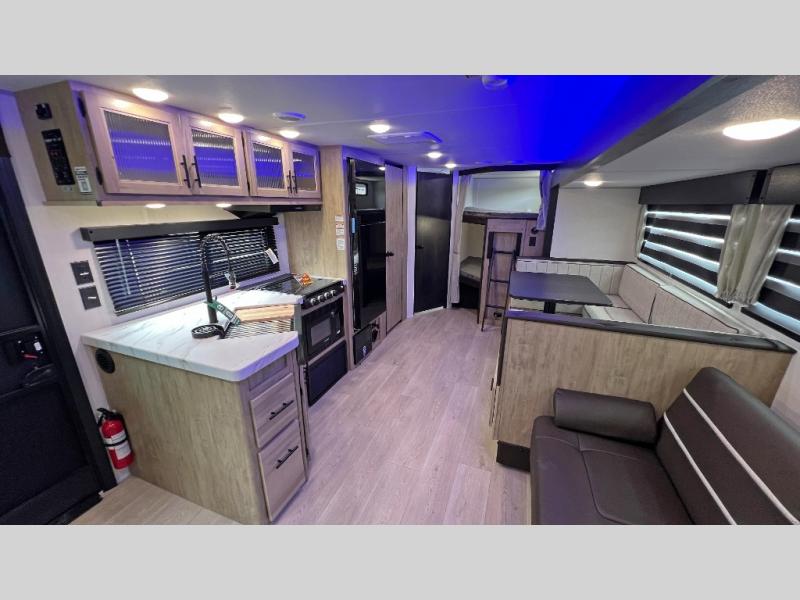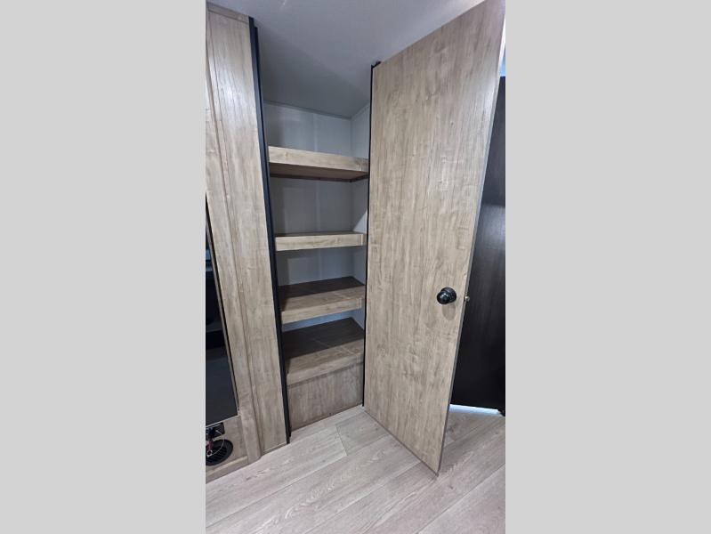 Come on inside this Cherokee Grey Wolf travel trailer and experience the convenience of a smooth flow of traffic in and out with two entry doors. The rear door leads into a full bath which is great for accessibility. Once inside, you will notice the large U-shaped dinette and the sofa which sit on the slide and create a spacious footprint for moving about, as well as great places to play games and socialize with your friends and family. A walk-in pantry provides plenty of storage allowing you to stock up on your favorite snacks and dry goods for your family adventure. At night, there is sleeping space for everyone between the double-size bunks and the bed, plus the furniture.