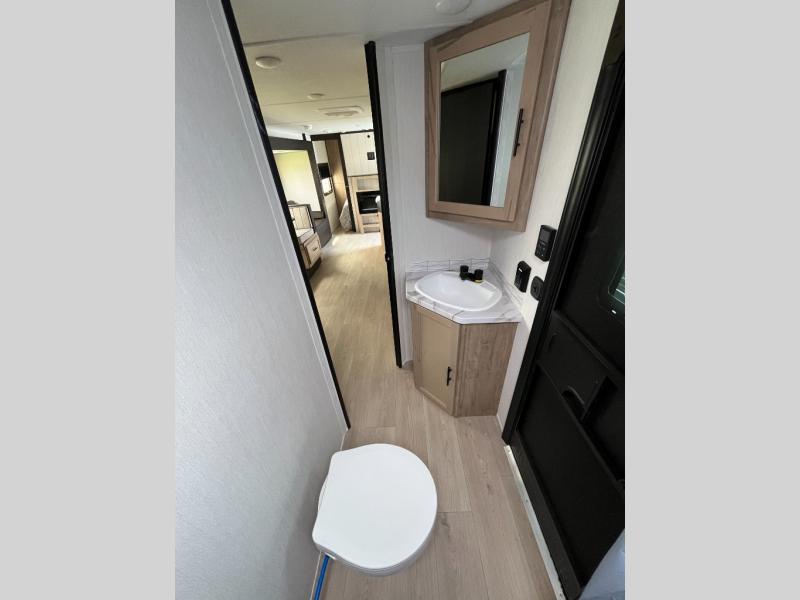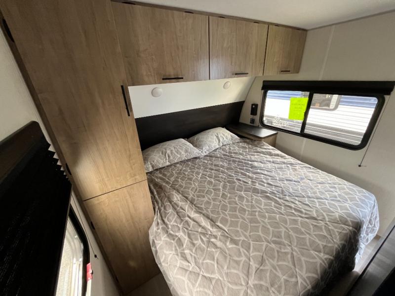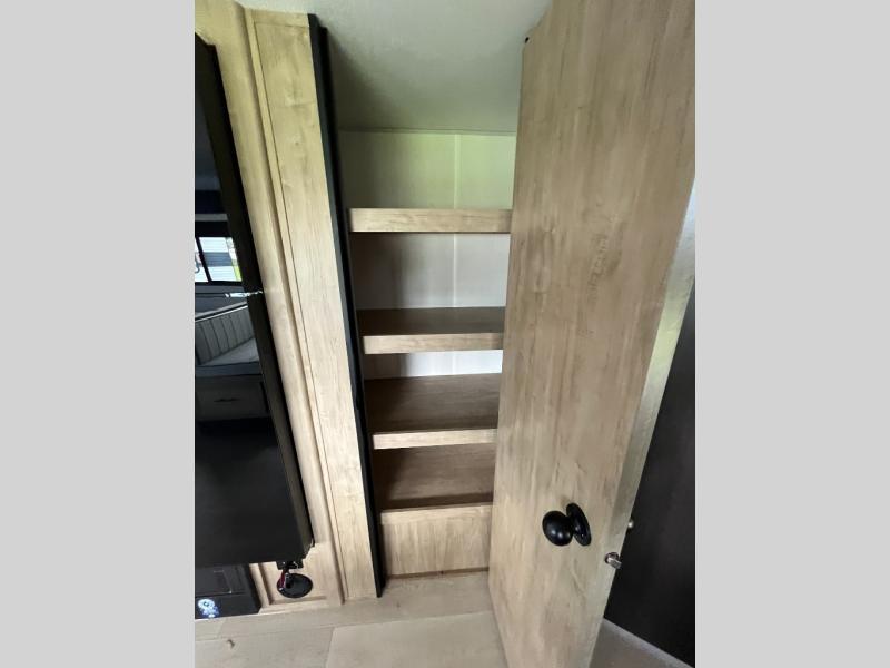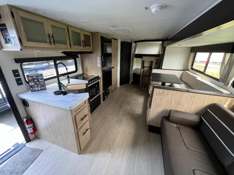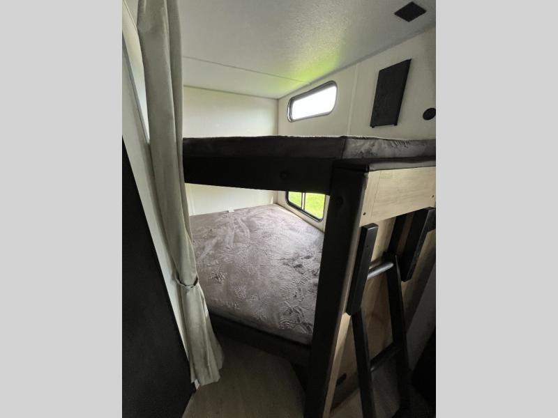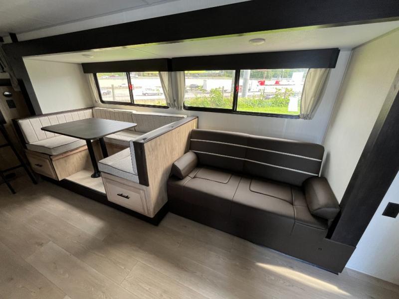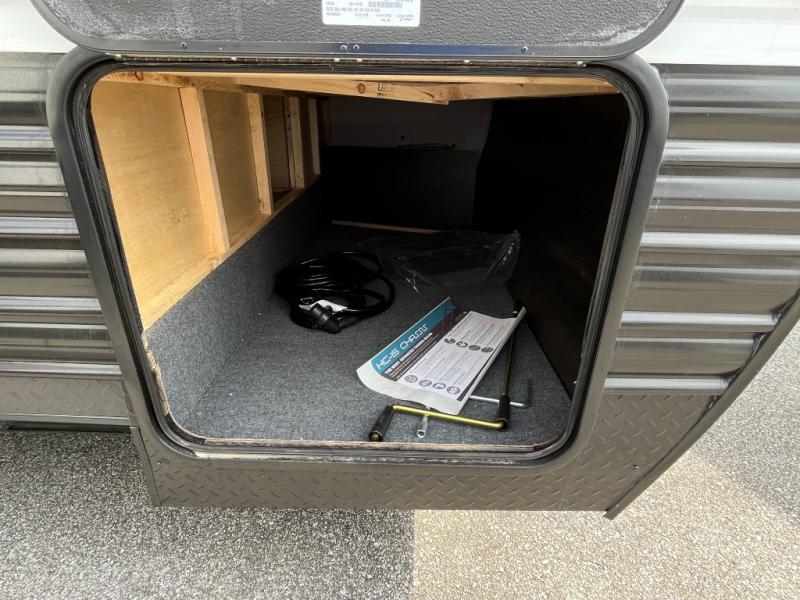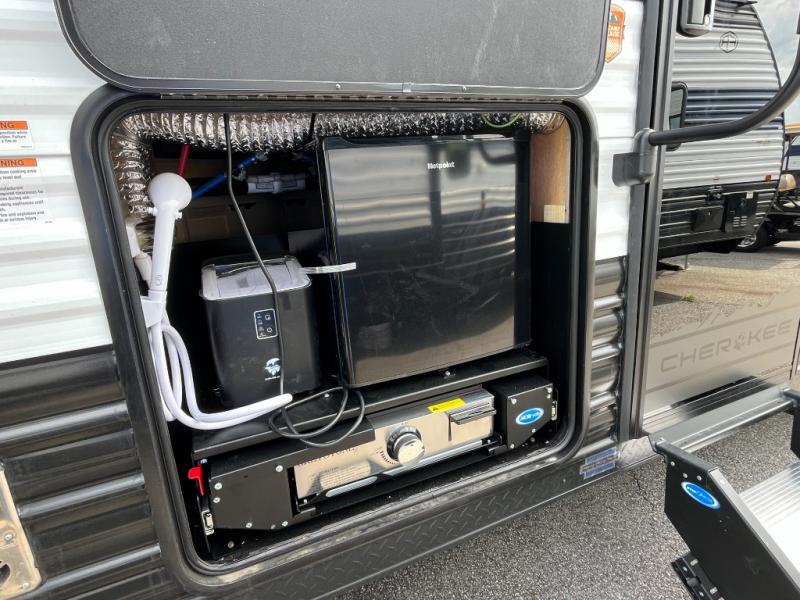Come on inside this Cherokee Grey Wolf travel trailer and experience the convenience of a smooth flow of traffic in and out with two entry doors. The rear door leads into a full bath which is great for accessibility. Once inside, you will notice the large U-shaped dinette and the sofa which sit on the slide and create a spacious footprint for moving about, as well as great places to play games and socialize with your friends and family. A walk-in pantry provides plenty of storage allowing you to stock up on your favorite snacks and dry goods for your family adventure. At night, there is sleeping space for everyone between the double-size bunks and the RV king bed, plus the furniture.