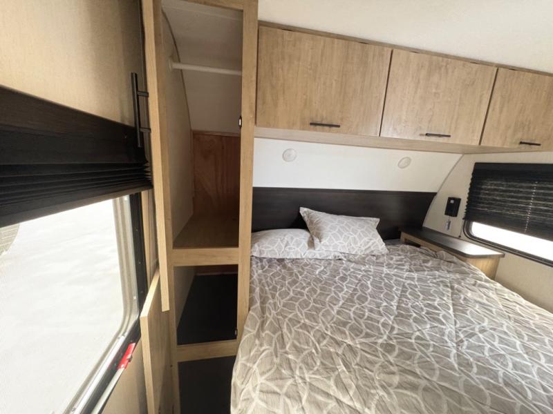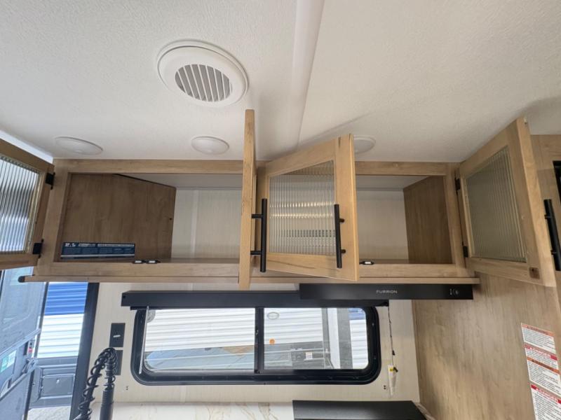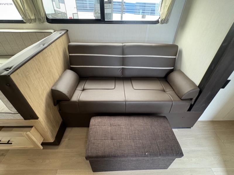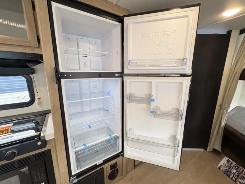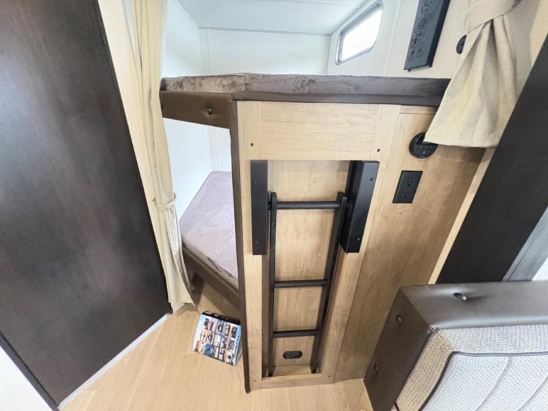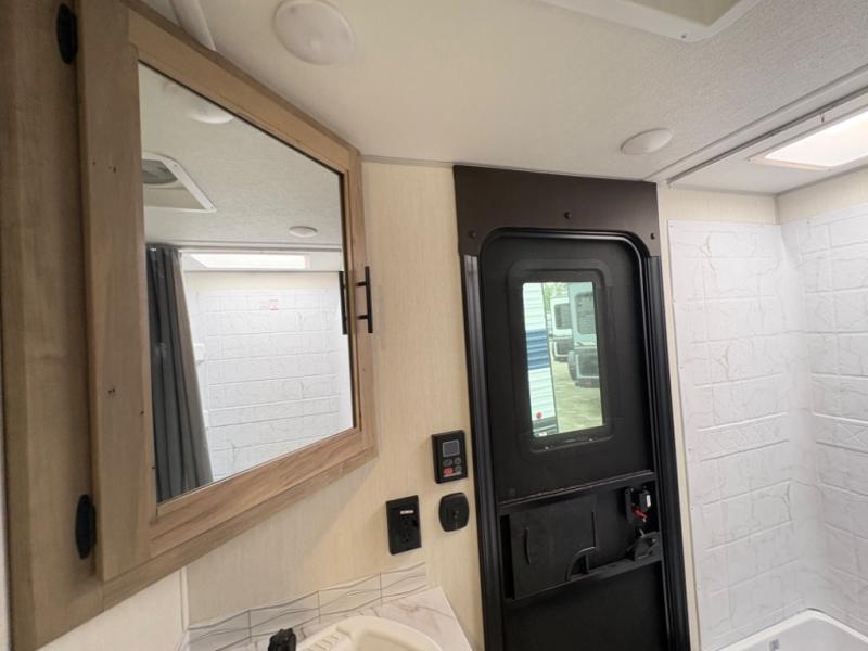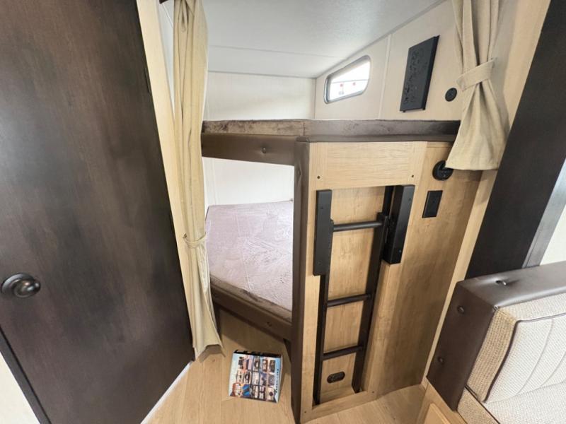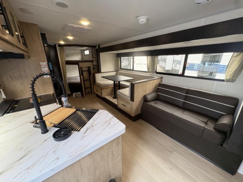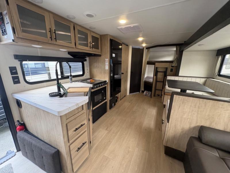 Come on inside this Cherokee Grey Wolf travel trailer and experience the convenience of a smooth flow of traffic in and out with two entry doors. The rear door leads into a full bath which is great for accessibility. Once inside, you will notice the large U-shaped dinette and the sofa which sit on the slide and create a spacious footprint for moving about, as well as great places to play games and socialize with your friends and family. A walk-in pantry provides plenty of storage allowing you to stock up on your favorite snacks and dry goods for your family adventure. At night, there is sleeping space for everyone between the double-size bunks and the RV king bed, plus the furniture.